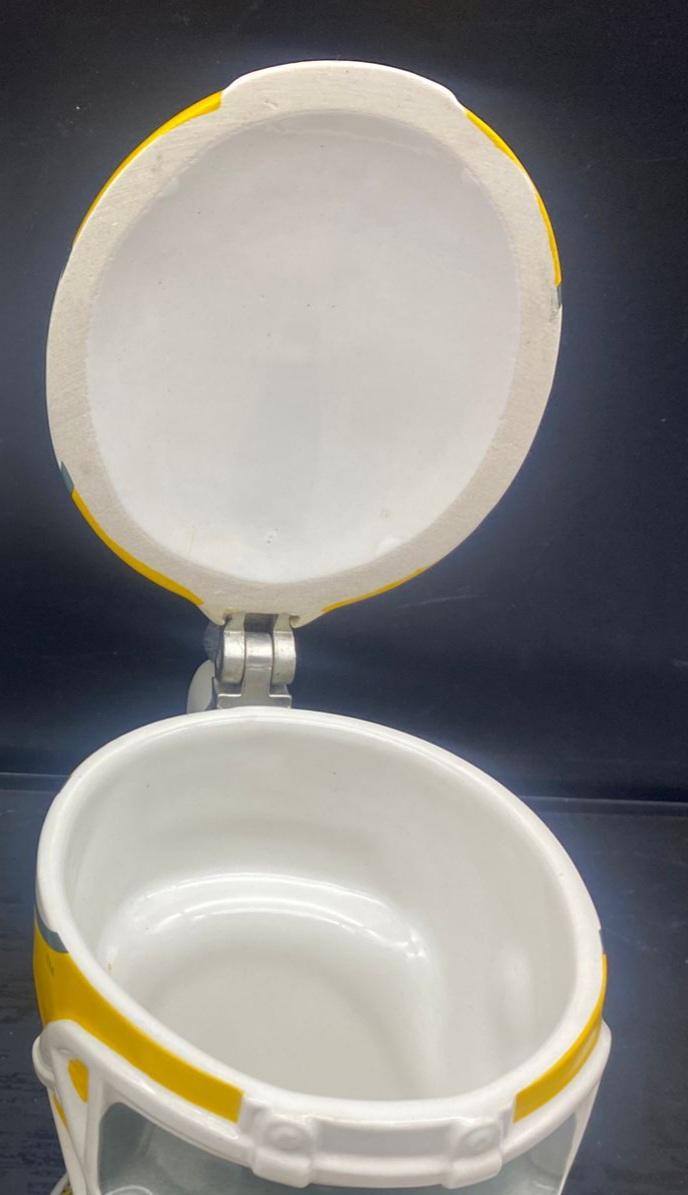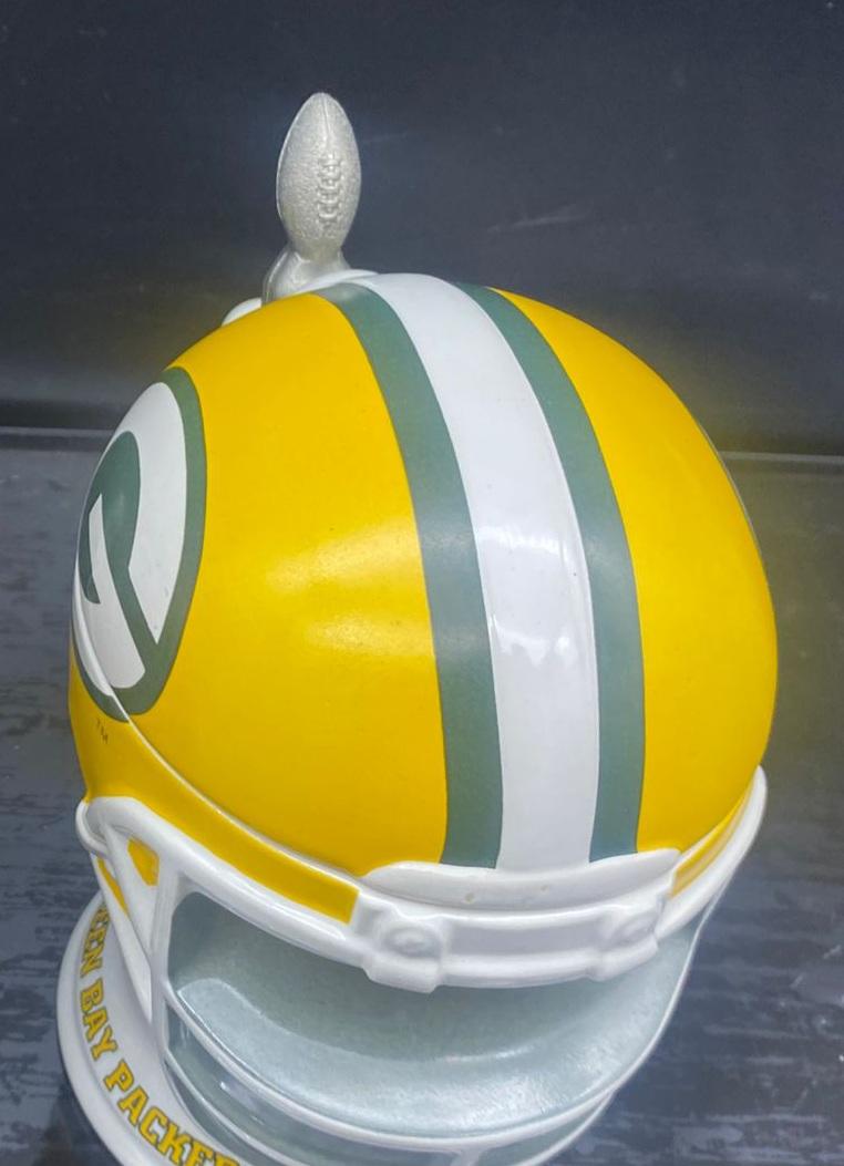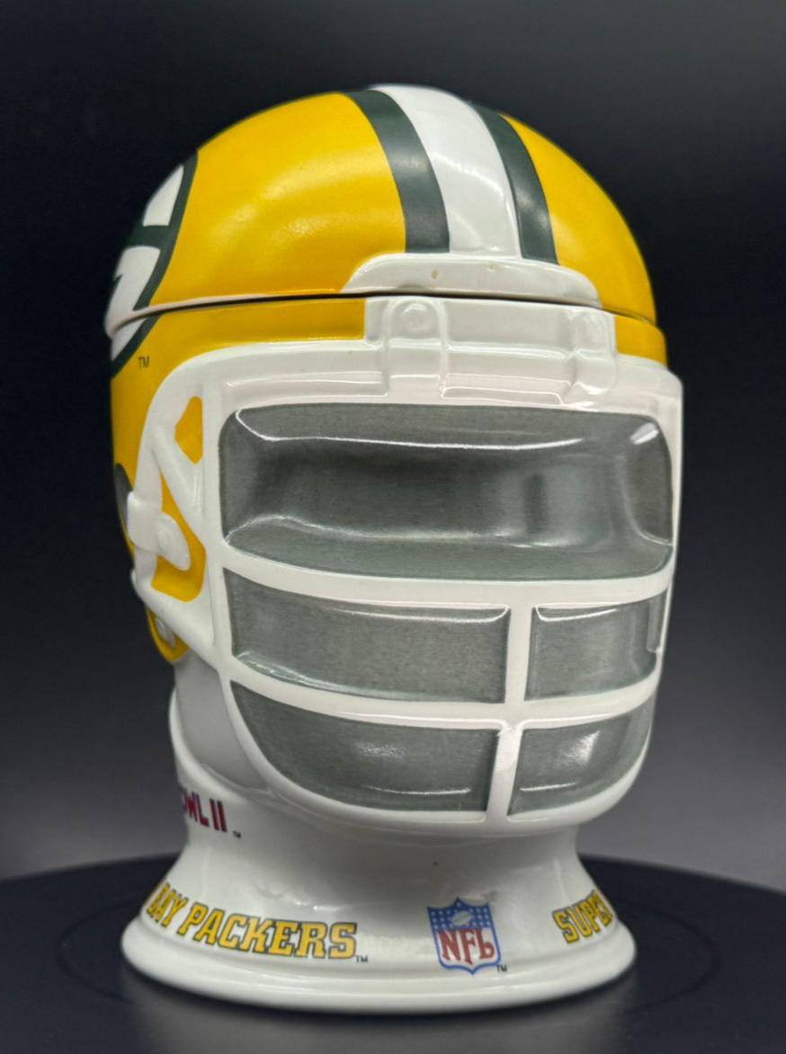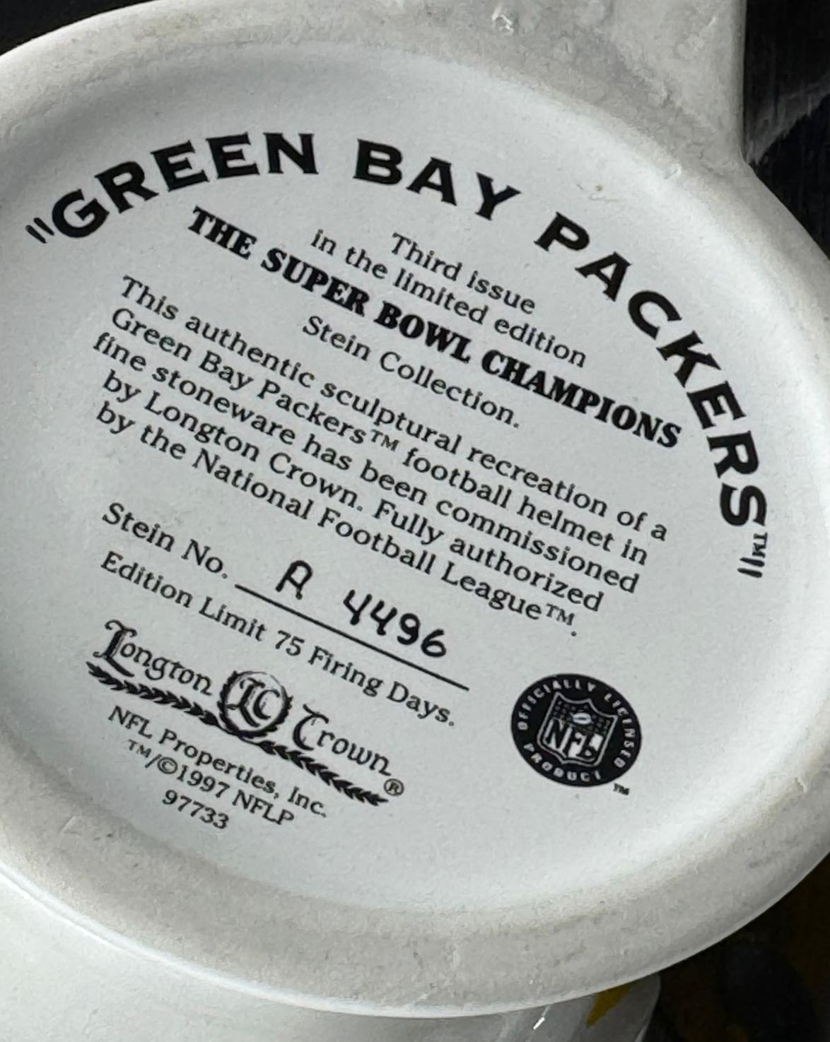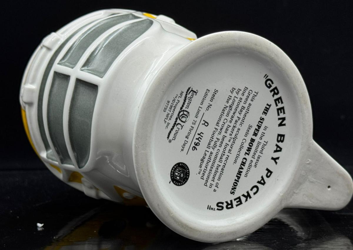 GREEN BAY PACKERS Football helmet lidded stein. Super Bowl wins featured around the bottom rear of the stein are: First World Championship Game AFL vs NFL Packers 35 - Chiefs 10, Super Bowl II Packers 33 - Raiders 14 and Super Bowl XXXI Packers 35 - Patriots 21.