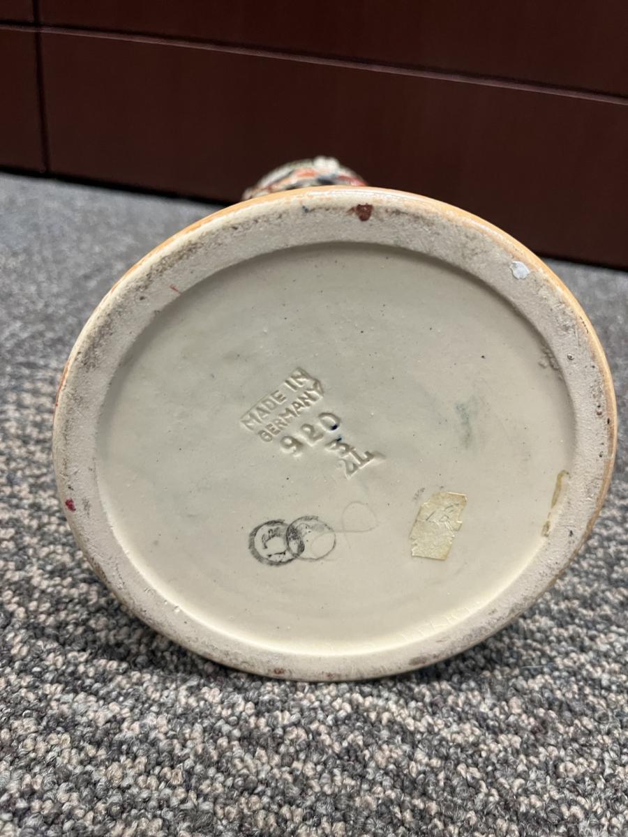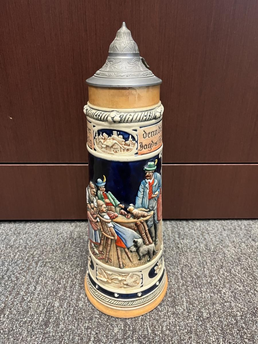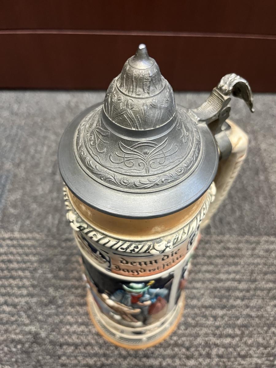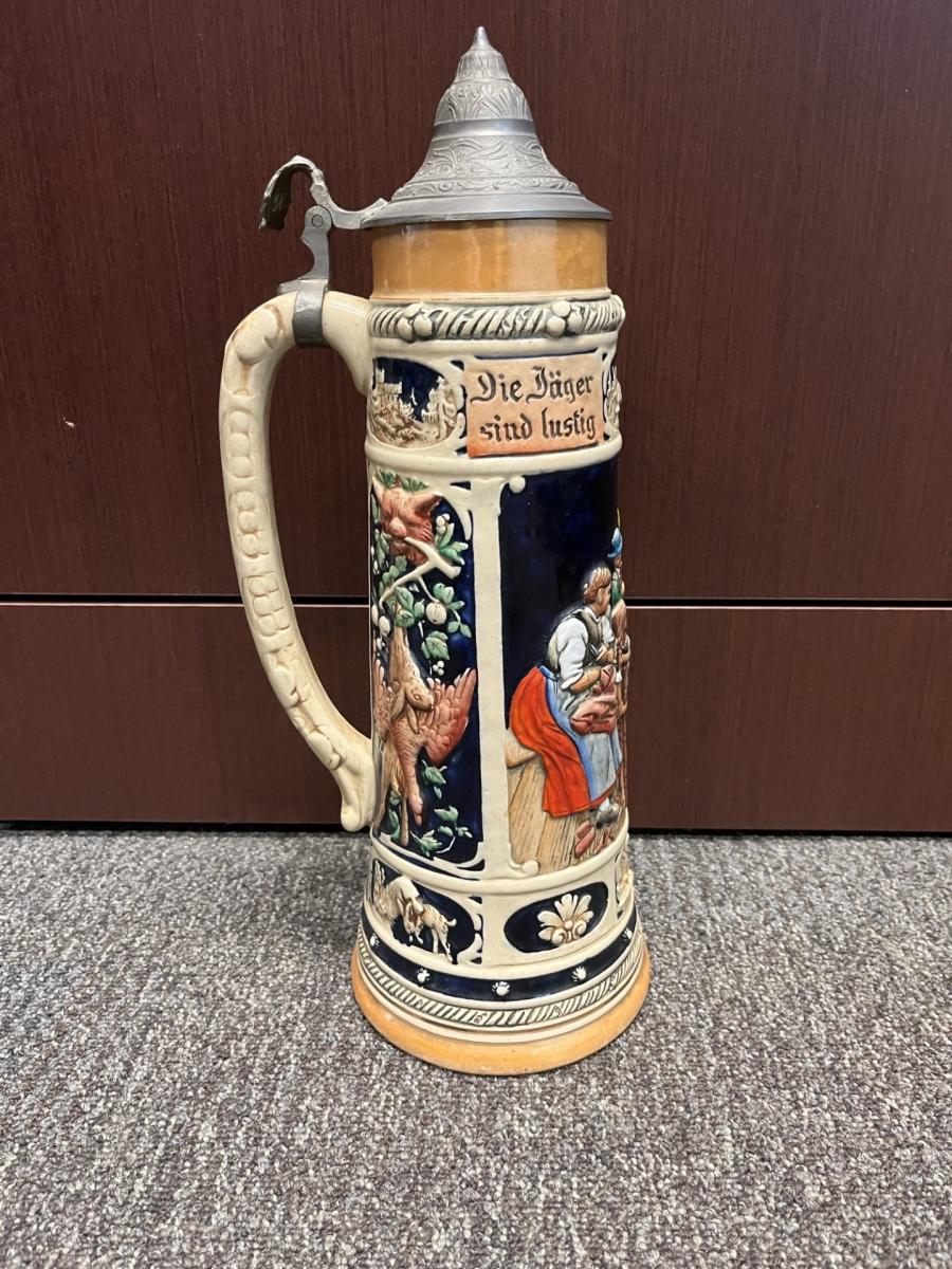 Pottery or stoneware, relief, 2.0L, pewter lid.