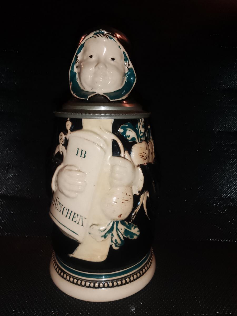 Decorative Beerstein, pottery multi-colour, Münchner Kindl with HB Beerstein and Radish in the other hand. 1/2L capacity mark on side, bottom stamped: Jacob Reinemann - München. - gesetzlich - geschützt and M. Pewter lid with ceramic head, Liebfrauenkirche-Towers thumb-lift and three-pin open hinge.