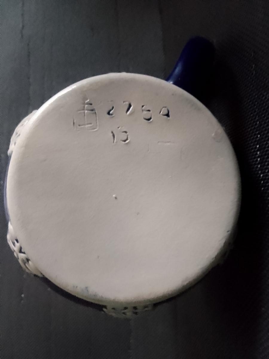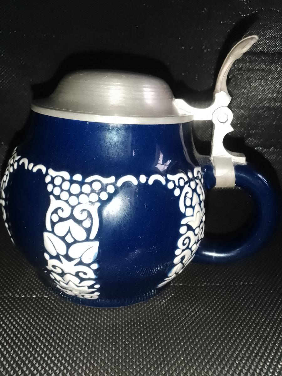 art deco ball-type Relief Beerstein, cobalt-blue glazed stoneware with three-times flower and leaves decor in cream-color. Weak capacity mark incised "Füllstrich", and mold number and pottery wheel for Marzi & Remy on bottom stamped.