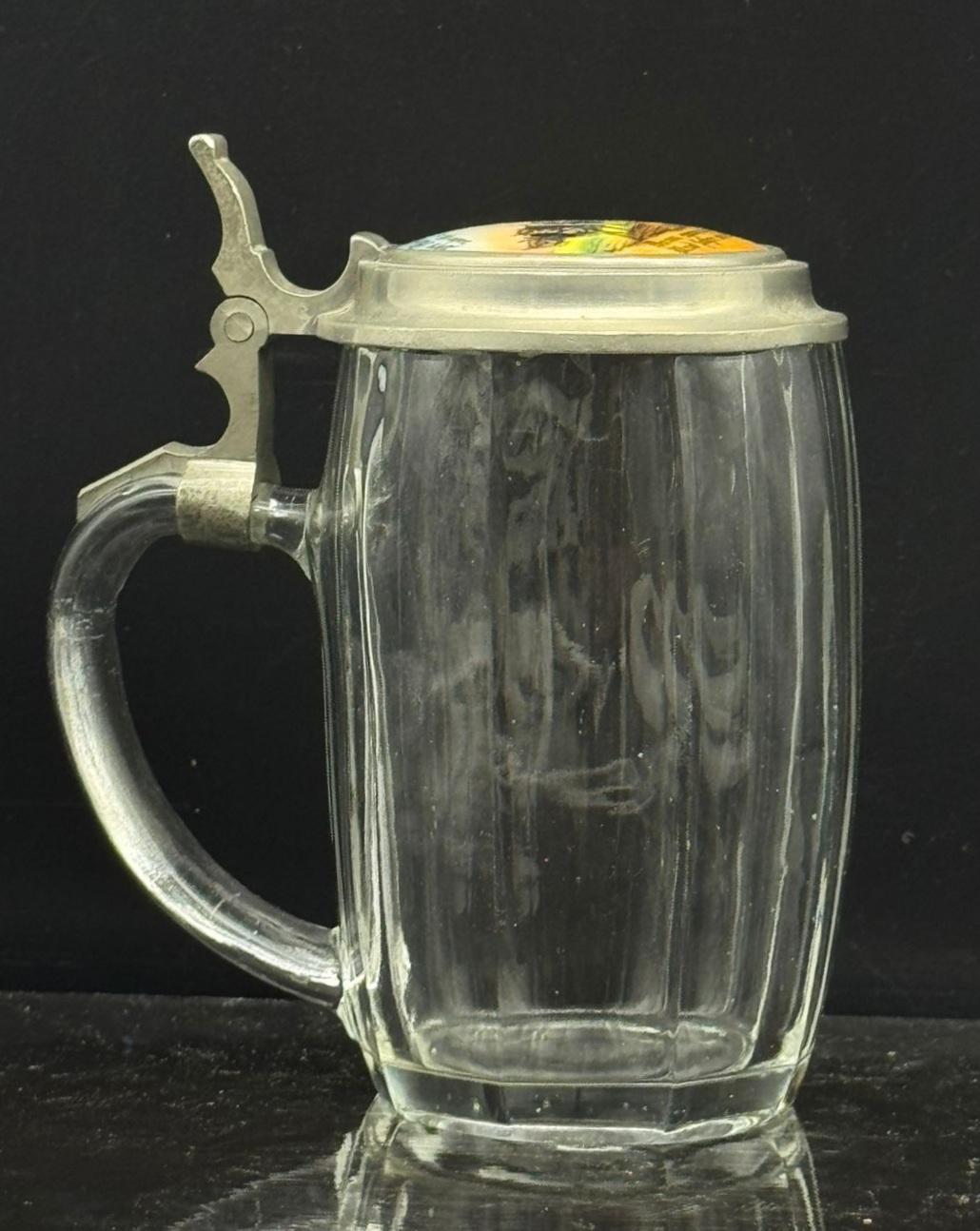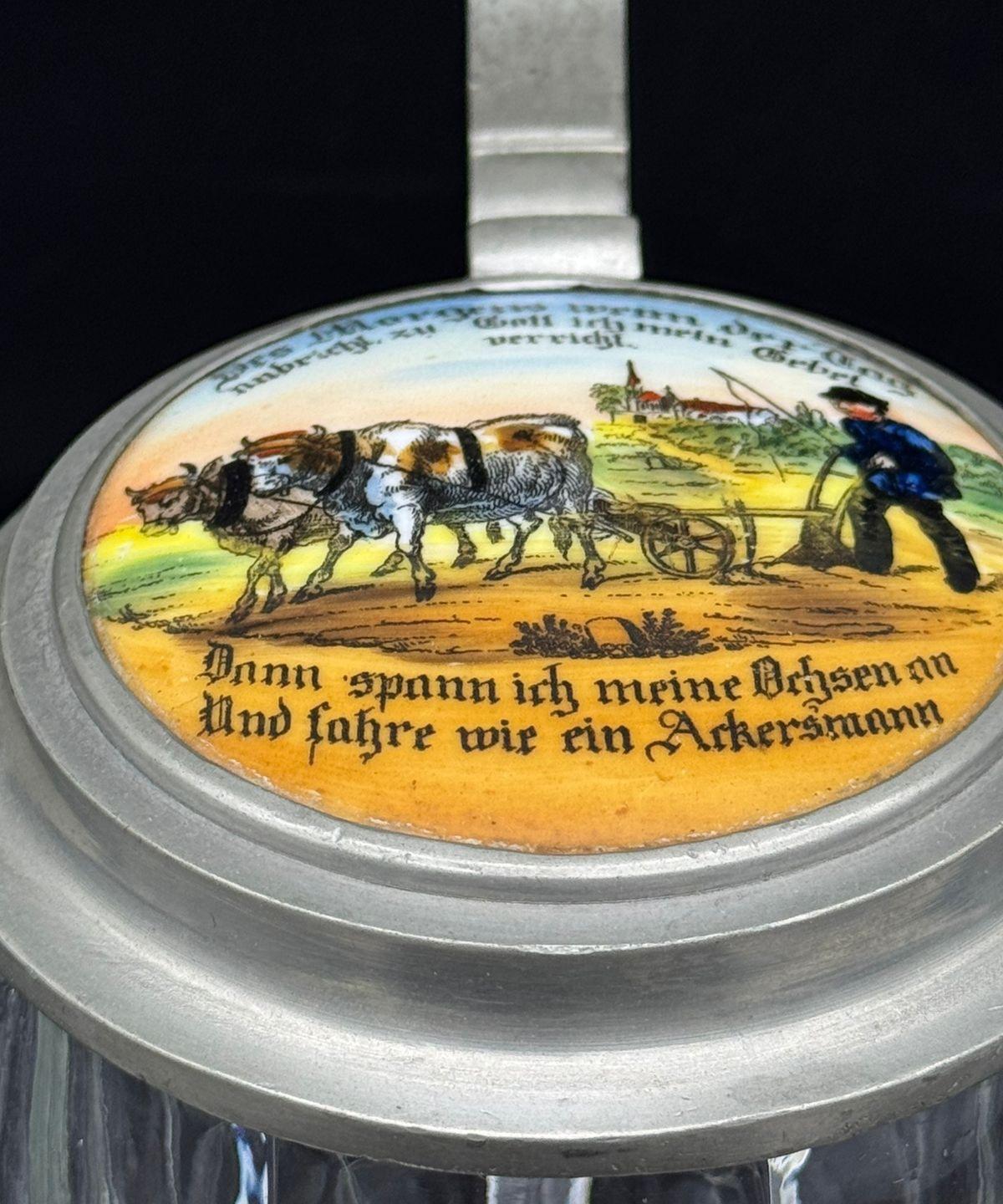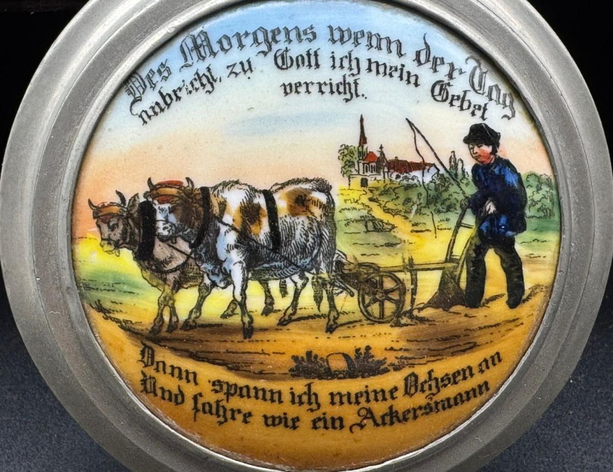 The mug is equipped with a pewter lid with ceramic inlay. The surface of the lid is decorated with a pattern with a story from rural life. The drawing is accompanied by an inscription, which, translated from German, reads as follows: "In the morning, when the day comes",