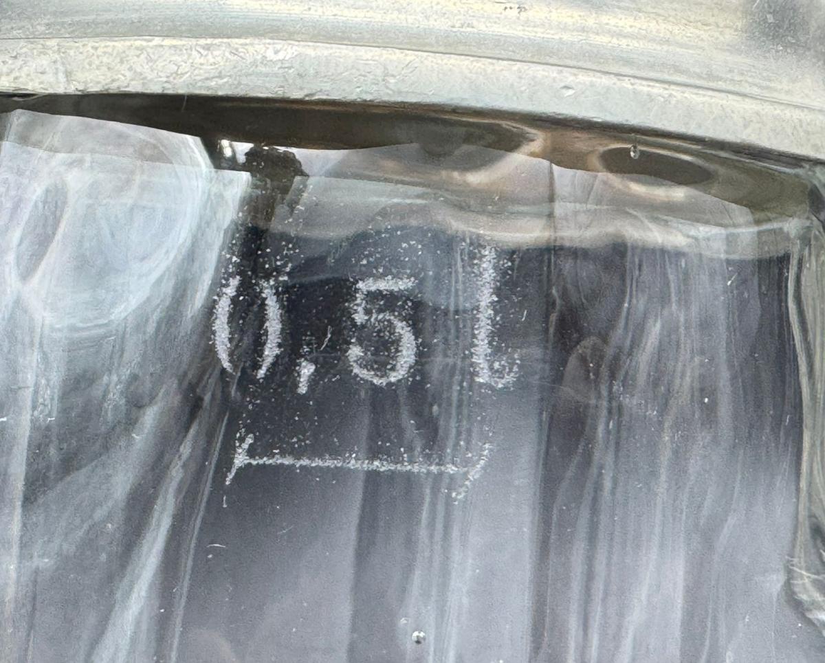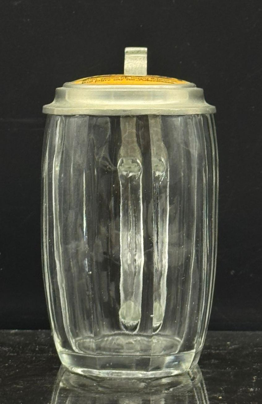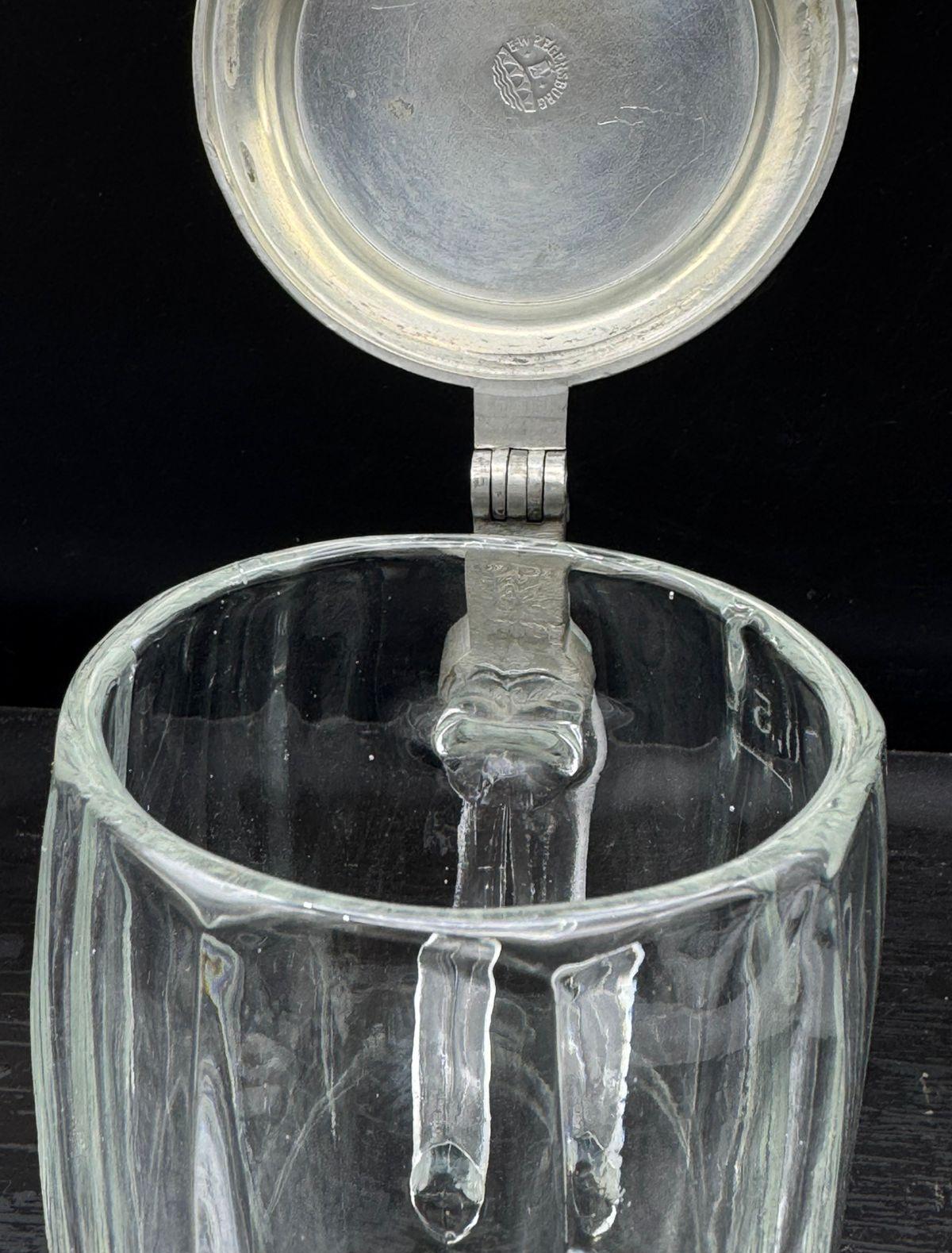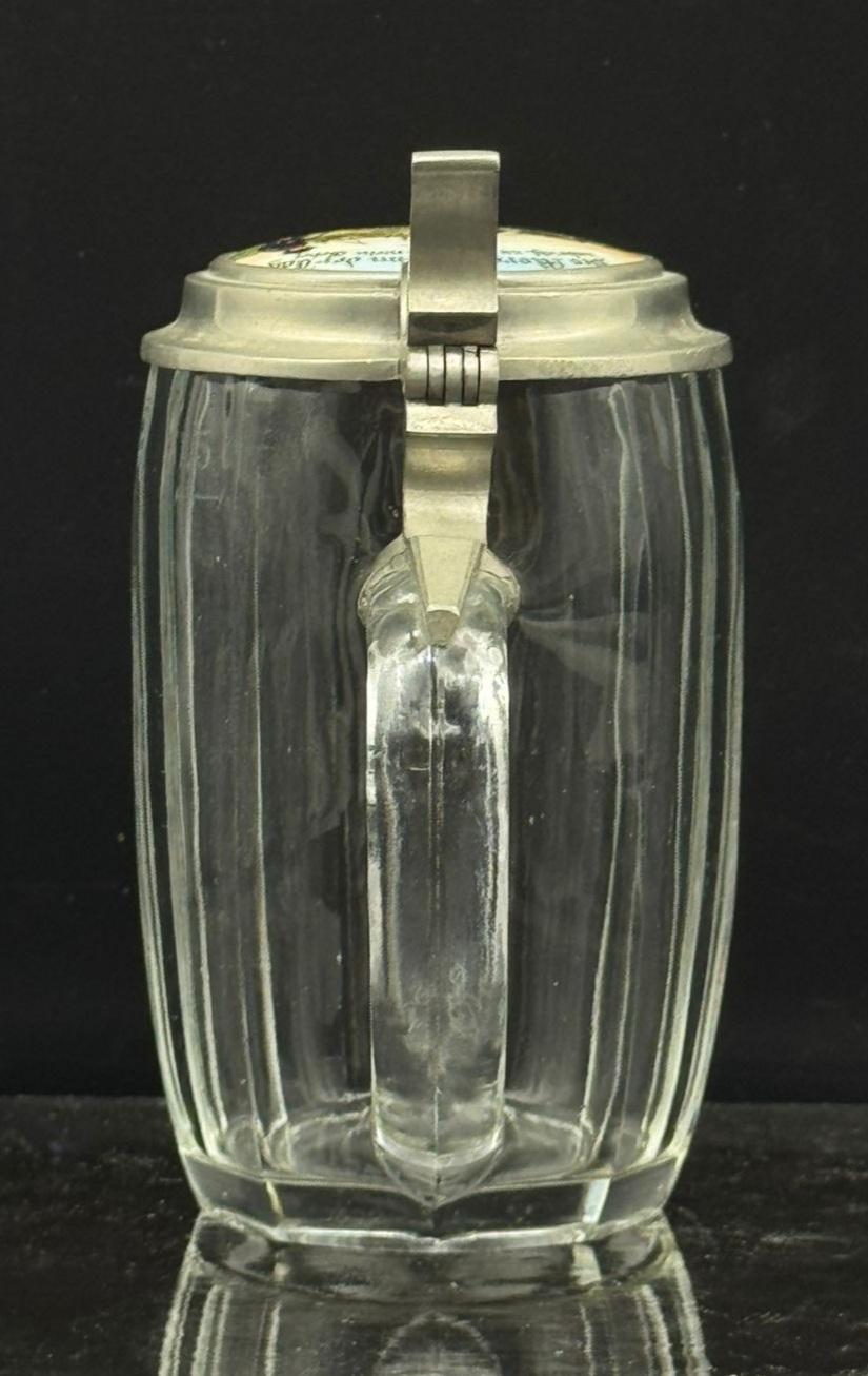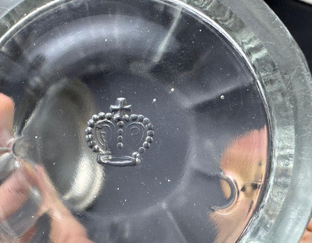 The large glass mug is made using pressed glass technology. At the bottom of the mug there is a stamp in the form of an imperial crown topped with a cross. The crown itself is decorated with the letters S and G. This brand is a trademark of the German glass factory Sächsische Glasfabrik August Walther & Söhne AG. Thus, the letters S and G on the surface of the crown are the first letters from the words of the factory name.