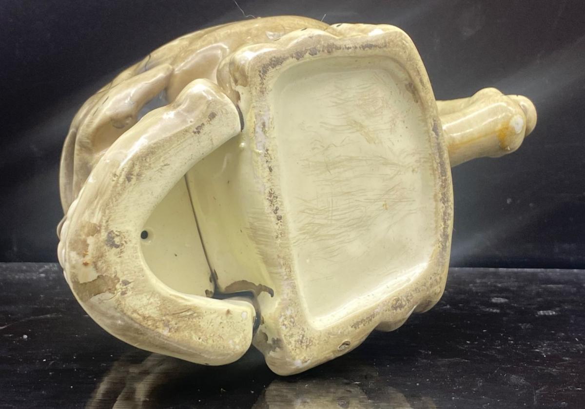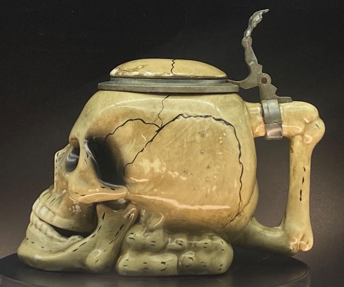 This antique curly mug "Skull" was made by the Schierholz manufactory in the period 1932-1939. After 1930, the Schierholz porcelain factory developed several new molds for shaped beer mugs in the "Menschen Schädel" style. Translated from German, "Human skull." By the first half of the 1930s, for more than 40 years of manufacturing shaped mugs with the image of a human skull in Germany, it was possible to observe variations in design solutions of different shapes and images. These were circles in the form of skulls of various types: with anatomically correct shapes; with stylized skulls resting on books with various inscriptions. Moreover, the inscriptions on the books were serious or humorous. For example, the serious inscription "Memento mori" (from Latin. "remember death") is a Latin expression that means a reminder of the inevitability of death and the shortness of human life. Such mugs with skulls on books were in demand among adherents of natural sciences, academic philosophical teachings or Massonian ideology.