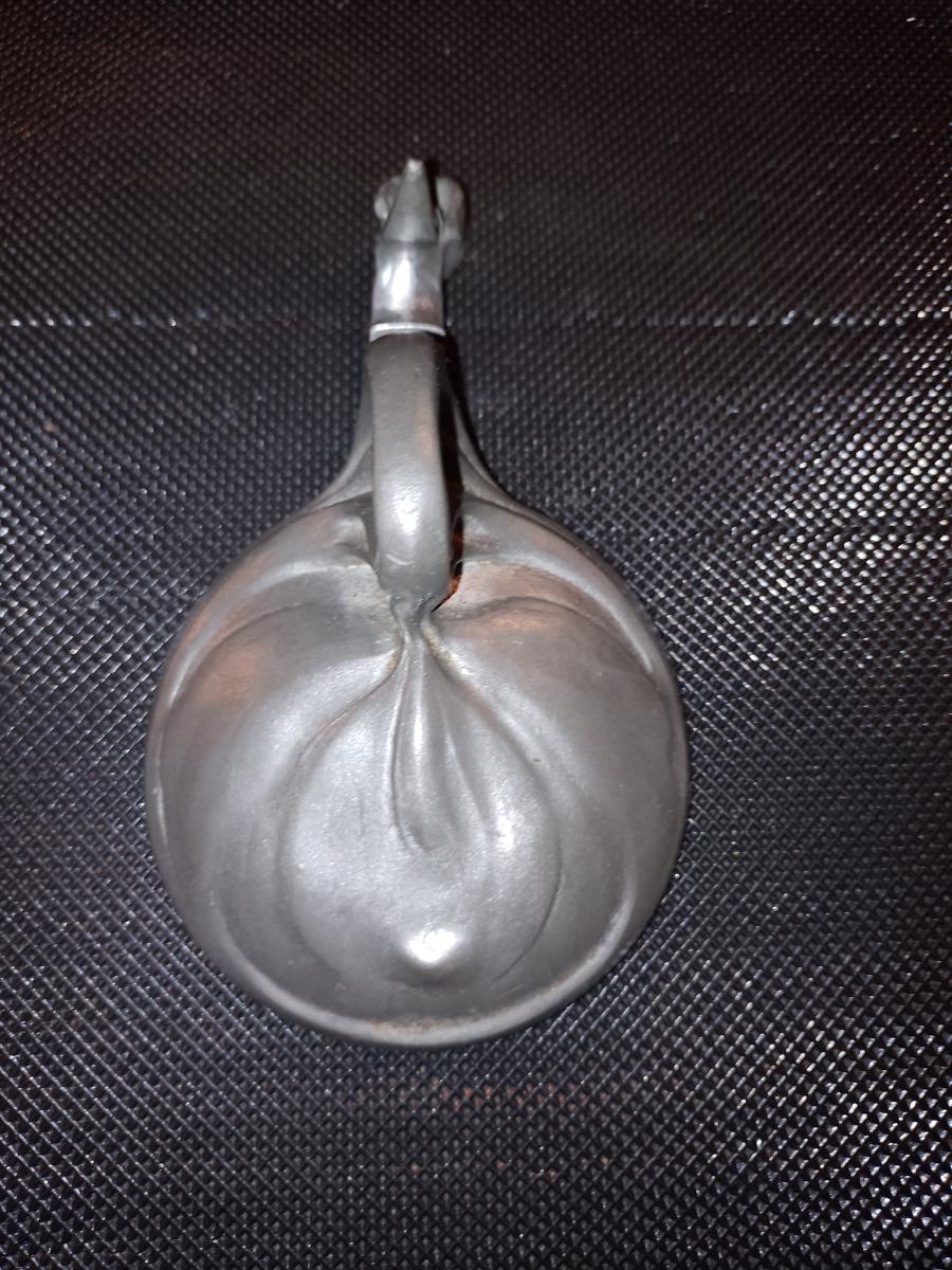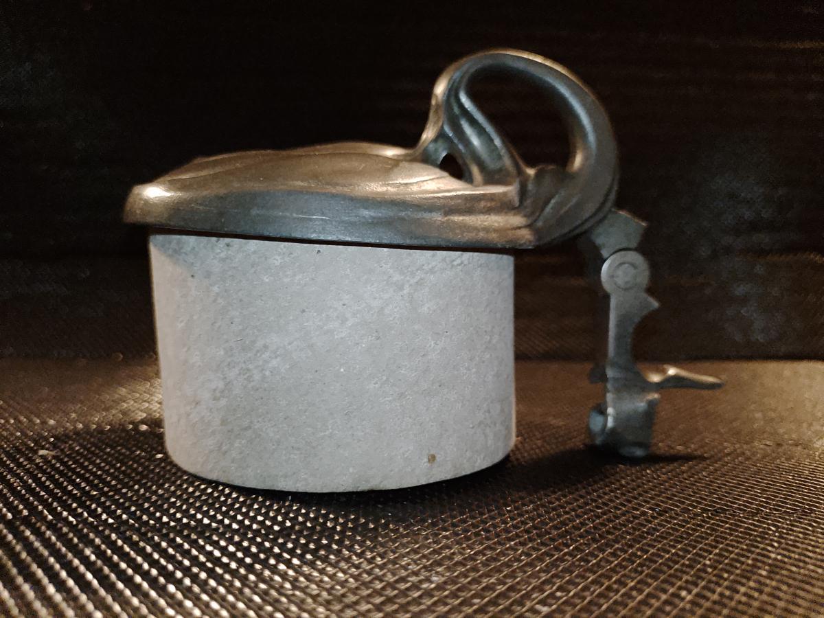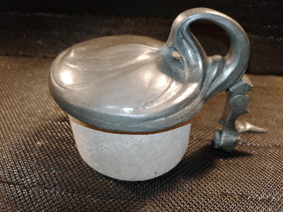 Beautyful art nouveau pewter lid, asymmetric iris flower ? on top, pure art nouveau thumb-lift, small loop, five-ring open hinge, searching for a matching Beerstein.