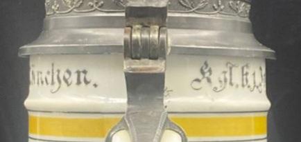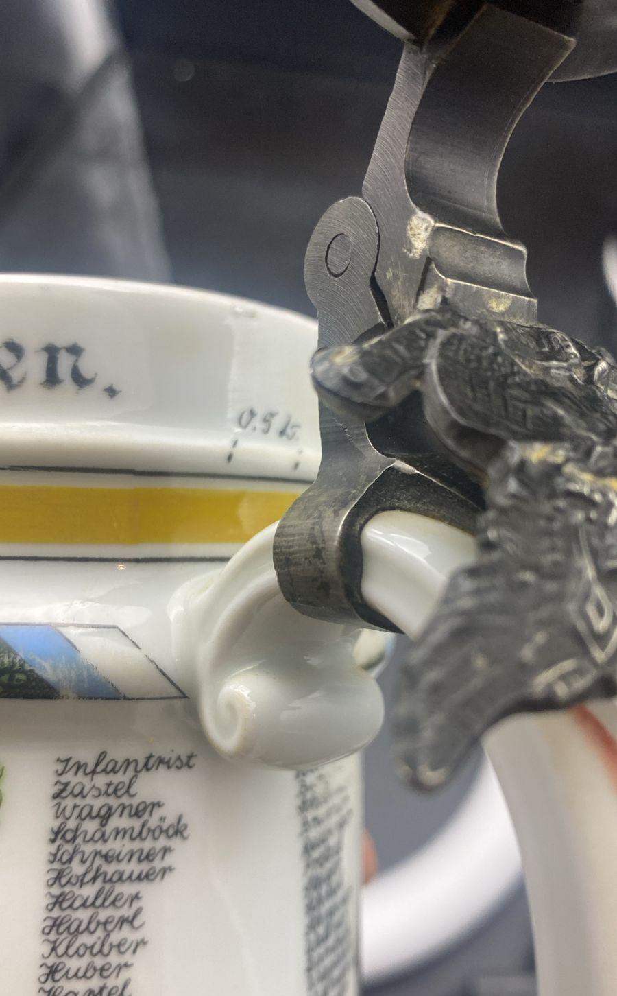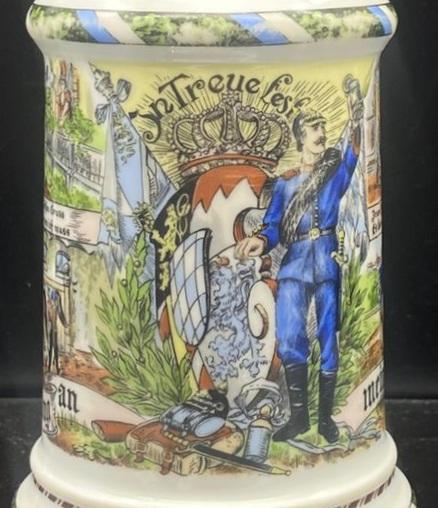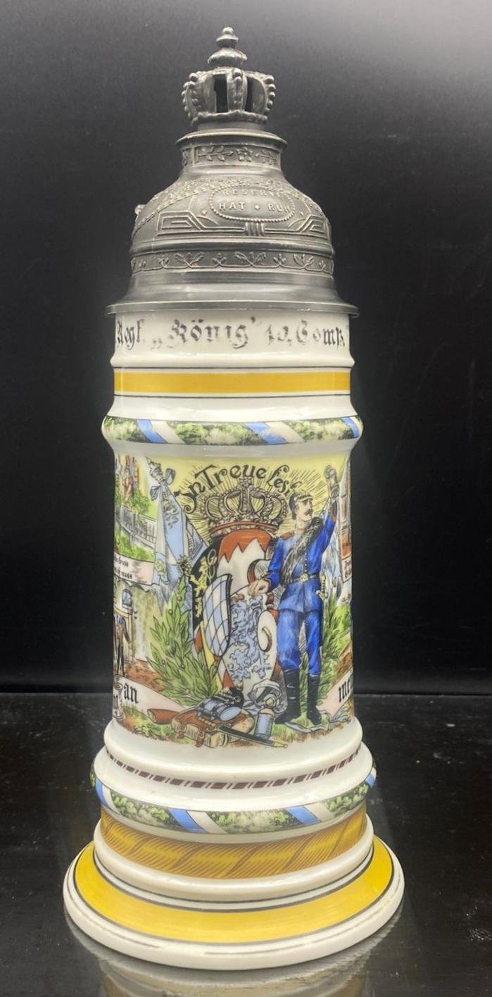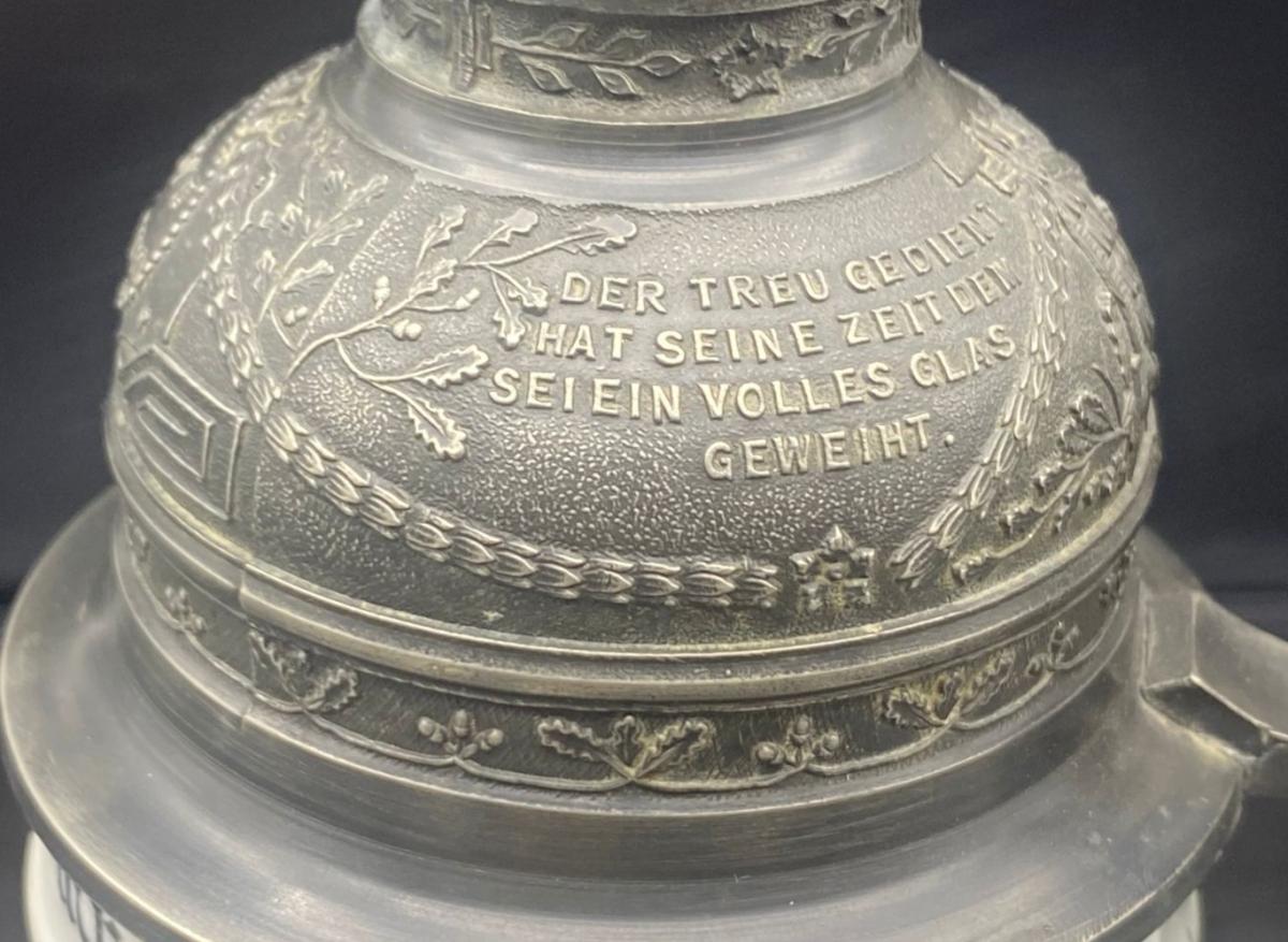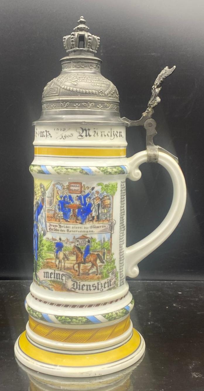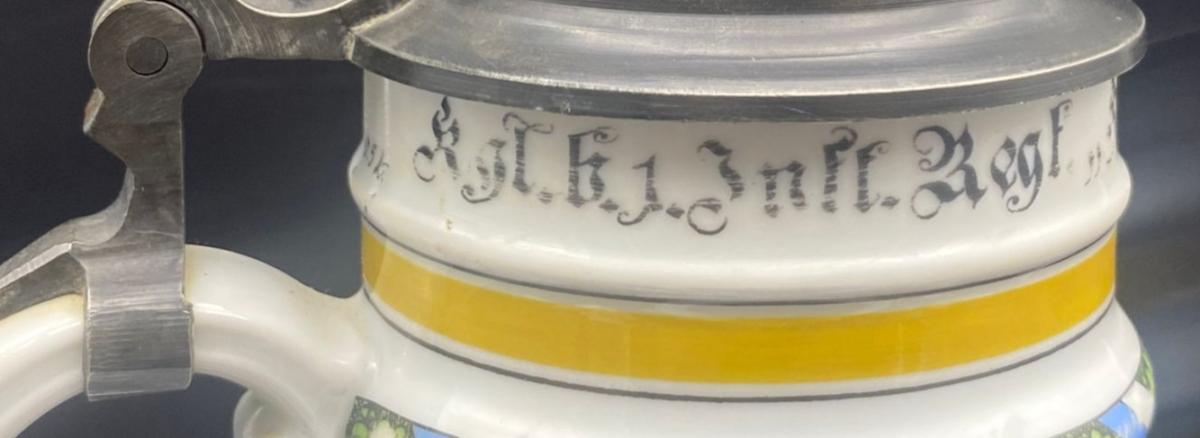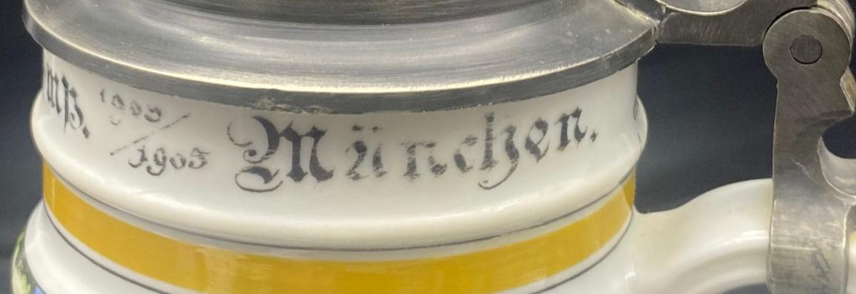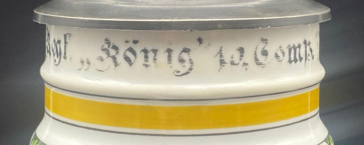 The inscription is applied around the entire circle of the upper part of the frieze of the beer mug: "Kgl. B. 1. Inft. Regt. "König"10. comp. 1903/1905 München.", is an abbreviation and stands for Royal Bavarian 1st Infantry Regiment (Königlich Bayerisches 1. Infanterie-Regiment) 10th Company, 1903-1905 years of service in Munich.