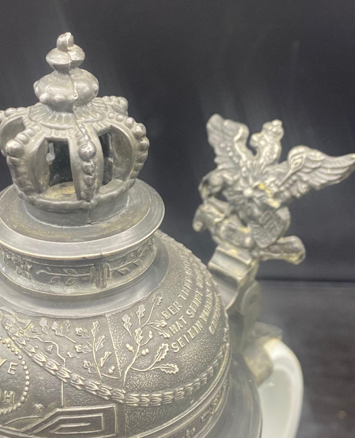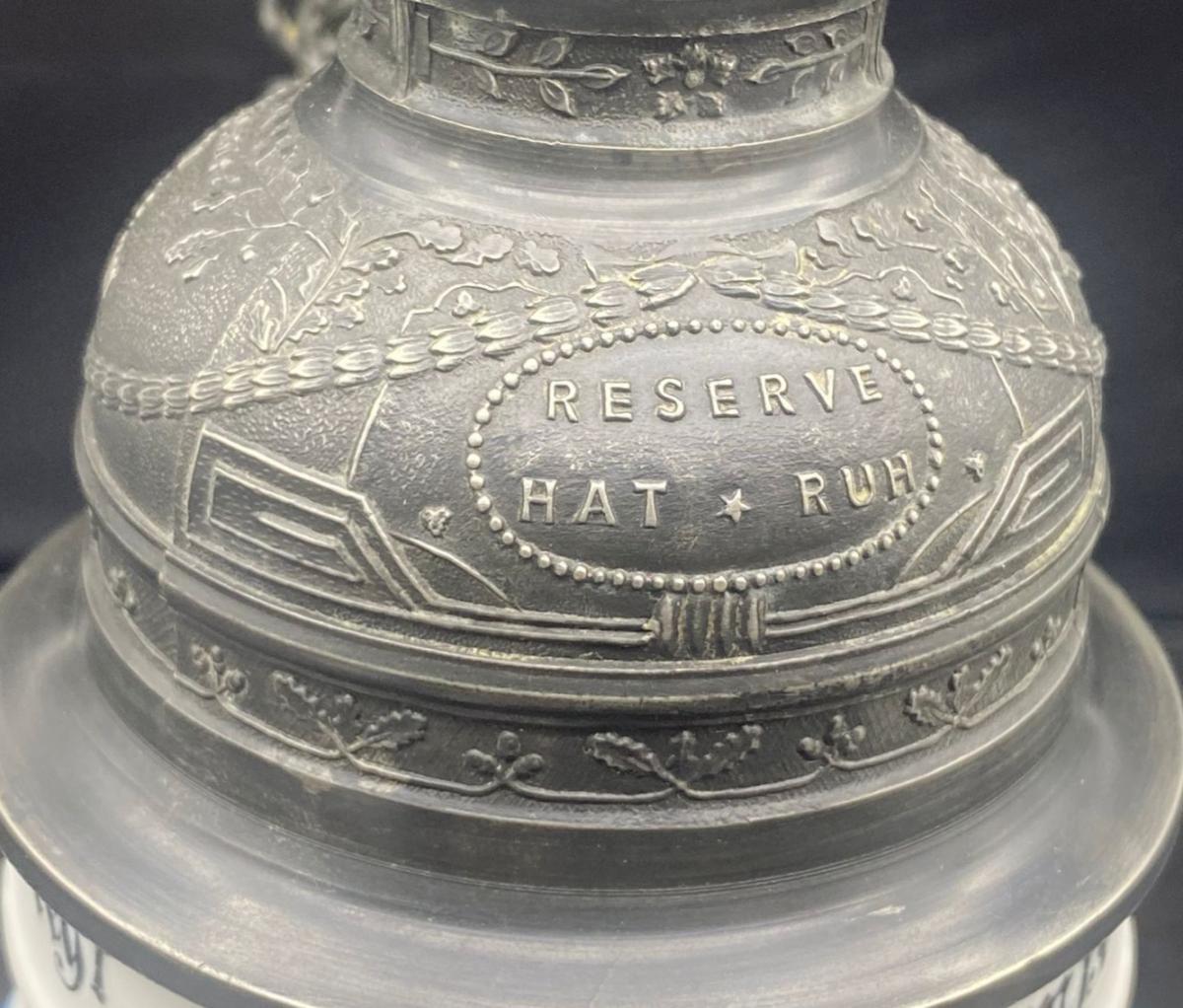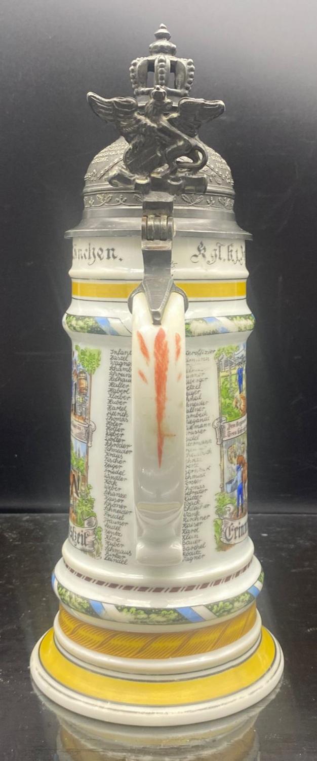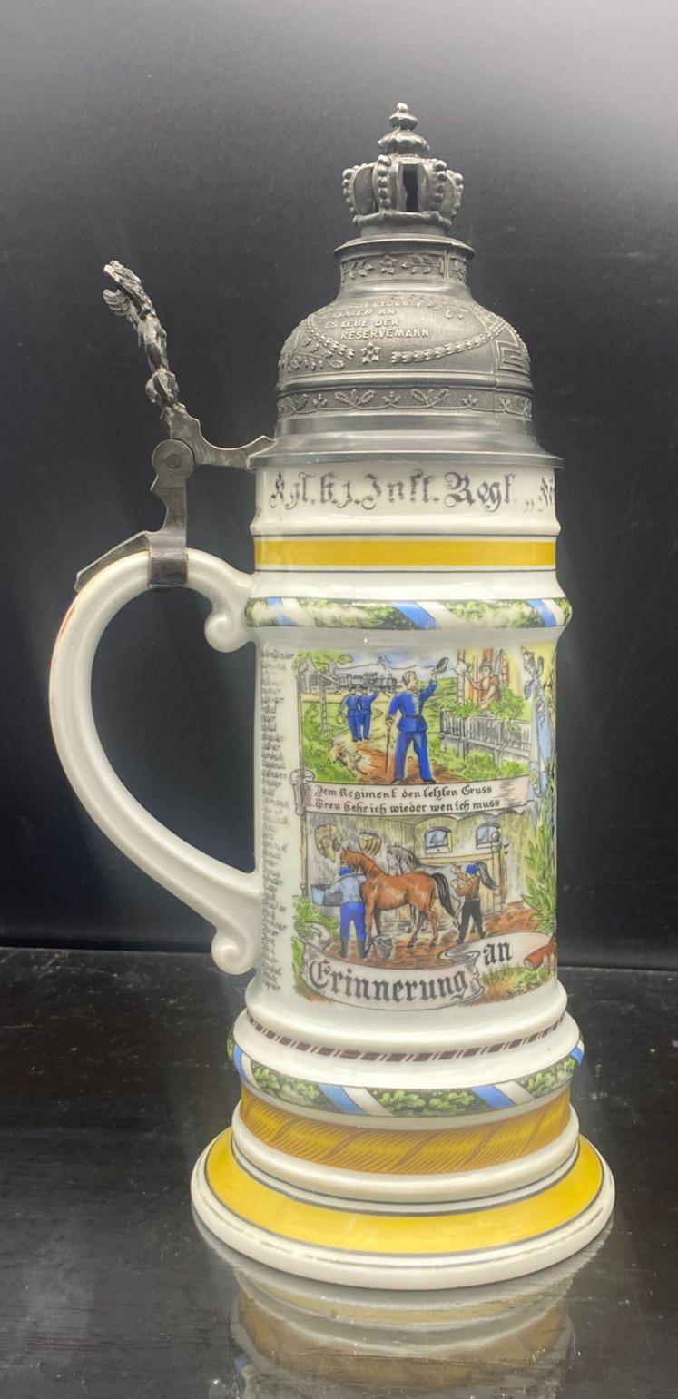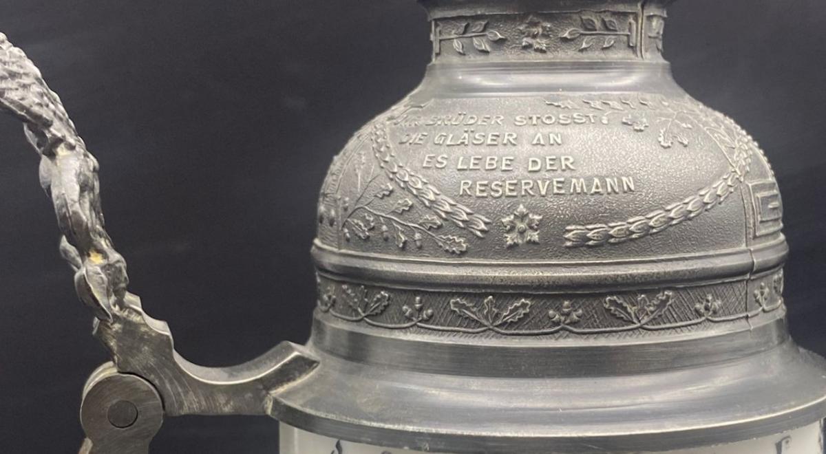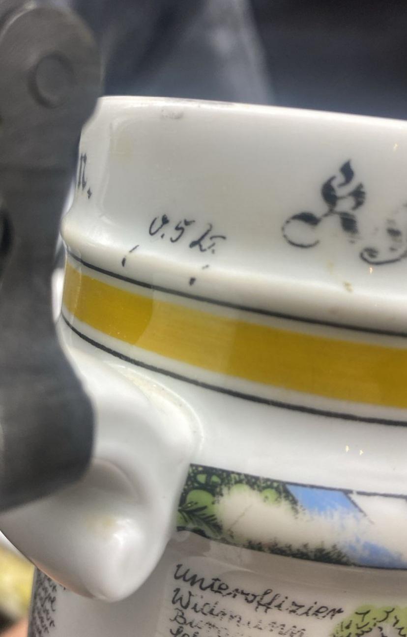 The inscription is applied around the entire circle of the upper part of the frieze of the beer mug: "Kgl. B. 1. Inft. Regt. "König"10. comp. 1903/1905 München.", is an abbreviation and stands for Royal Bavarian 1st Infantry Regiment (Königlich Bayerisches 1. Infanterie-Regiment) 10th Company, 1903-1905 years of service in Munich.