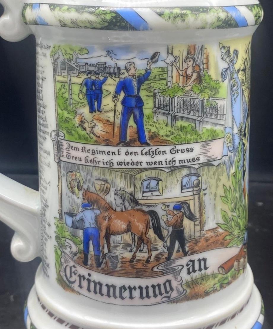 To the right of the mug's handle, we can see two drawings with a caption in German. The top drawing shows the scene of a soldier saying goodbye to his girlfriend. The inscription to this drawing reads: "Dem Regiment den letzten Gruss, Treue Gefrich wieder wen ich muss". In translation, this is "Farewell greetings to the regiment. A loyal comrade will come back again if necessary".