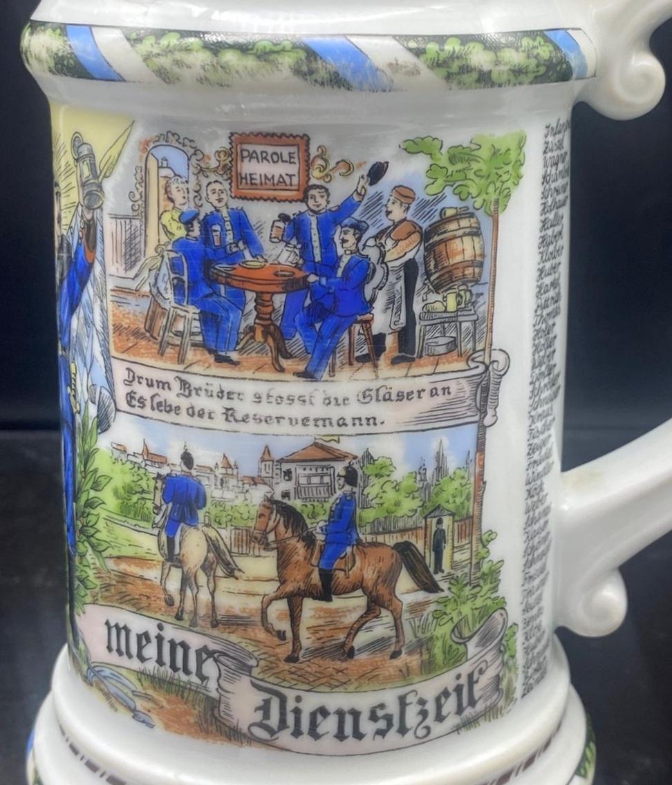 Two scenes are depicted to the left of the mug handle. In the upper picture, a group of colleagues celebrates a holiday. On the wall of the tavern there is a poster with the inscription in German: "PAROLE HEIMAT" (Password Homeland). The caption to this drawing "Drum Bruder Stosst die Gläser an Es lebe der Reservemann" in translation reads: "So, brothers, let's go nuts, long live the reservist." In the lower drawing, we see soldiers on horseback. The caption to this drawing "meine Dienstzeit" means "My service".
