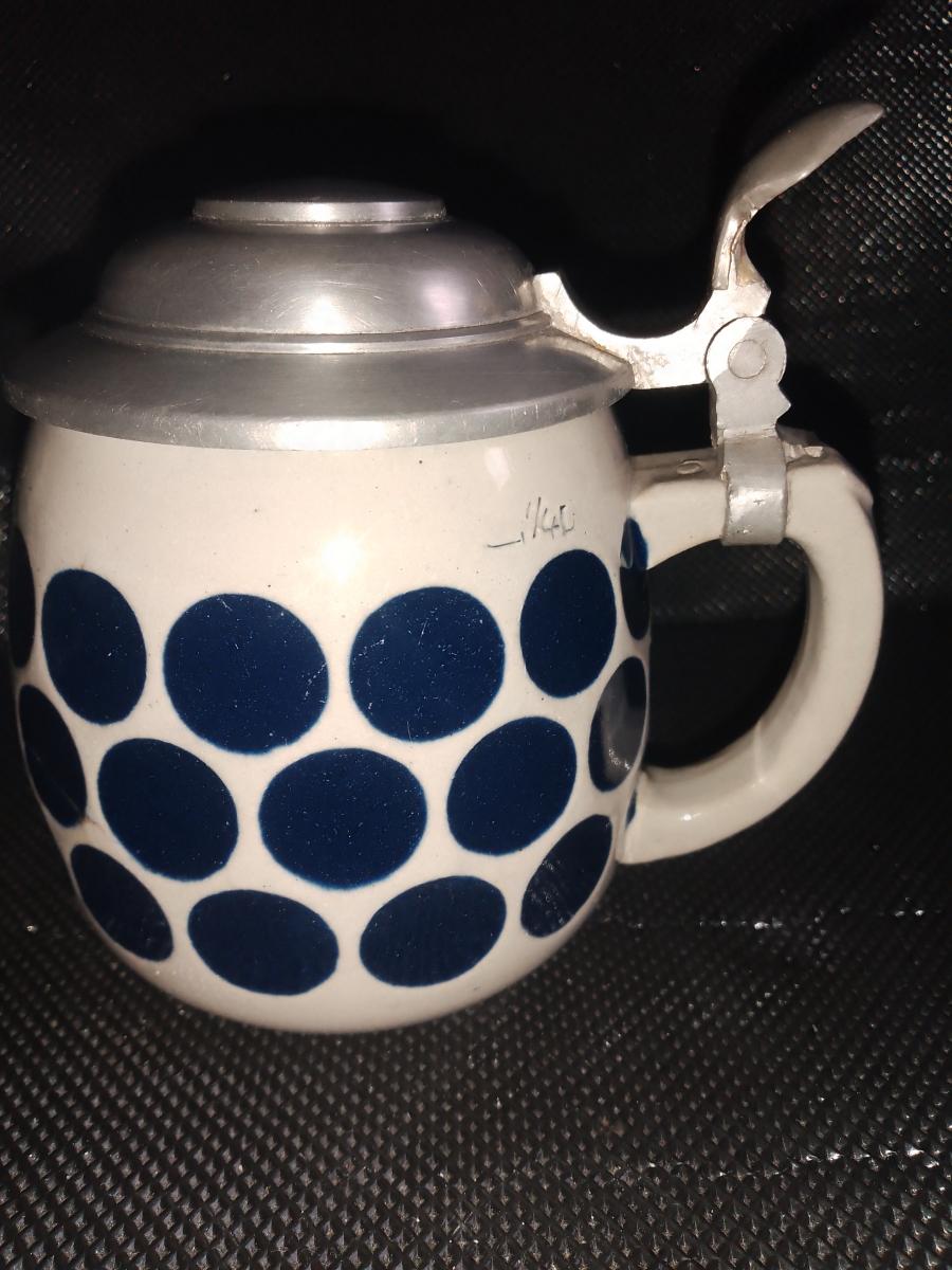 Small, ball-type Cider Stein "Elfenbeinsteinzeug", cream stoneware with relief Circle Design colored in cobalt-blue. 1/4 L capacity mark in side, bottom stamped with mold number "2099", but no marker's mark.