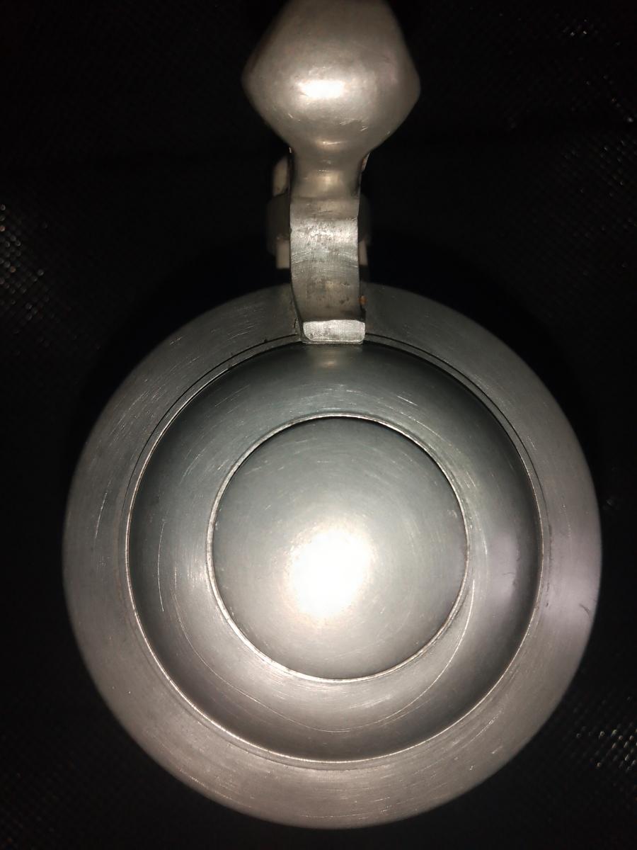 Original art nouveau Domed Pewter Lid, as depicted in the "Marzi & Remy Catalog" in this Database, art nouveau design Thumb-lift, three-ring open hinge.