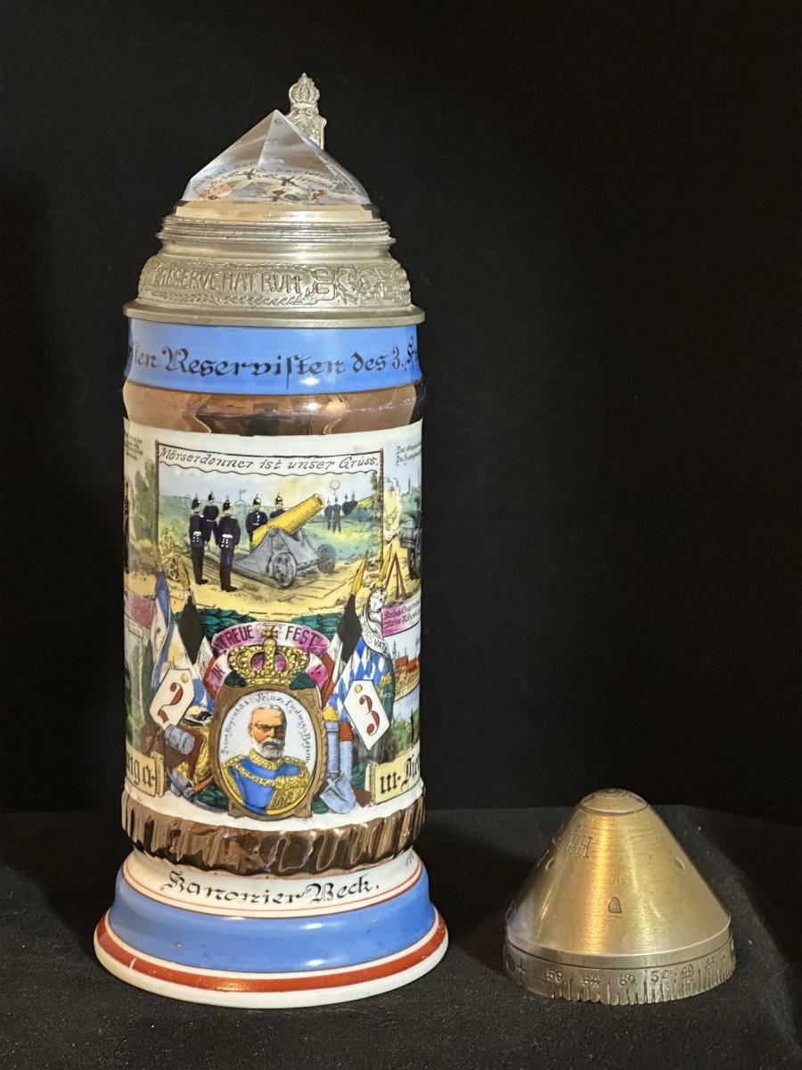 Reservist stein named to Kanonier Beck who served in both the 2d & 3d Royal Bavarian Foot Artillery Regiments, Ingolstadt, 1911-1913. The stein was finished by the firm Jakob Maier, Dachaustrasse 105, Munich.