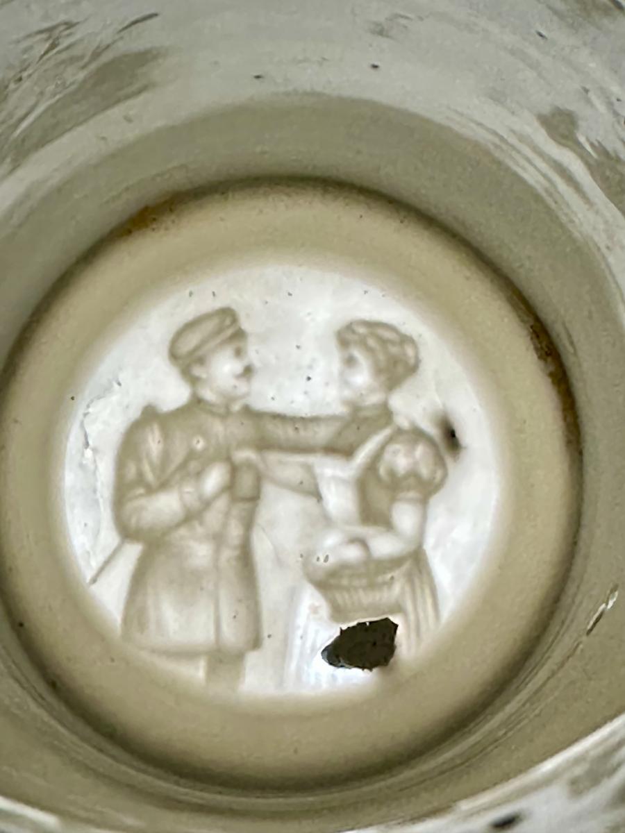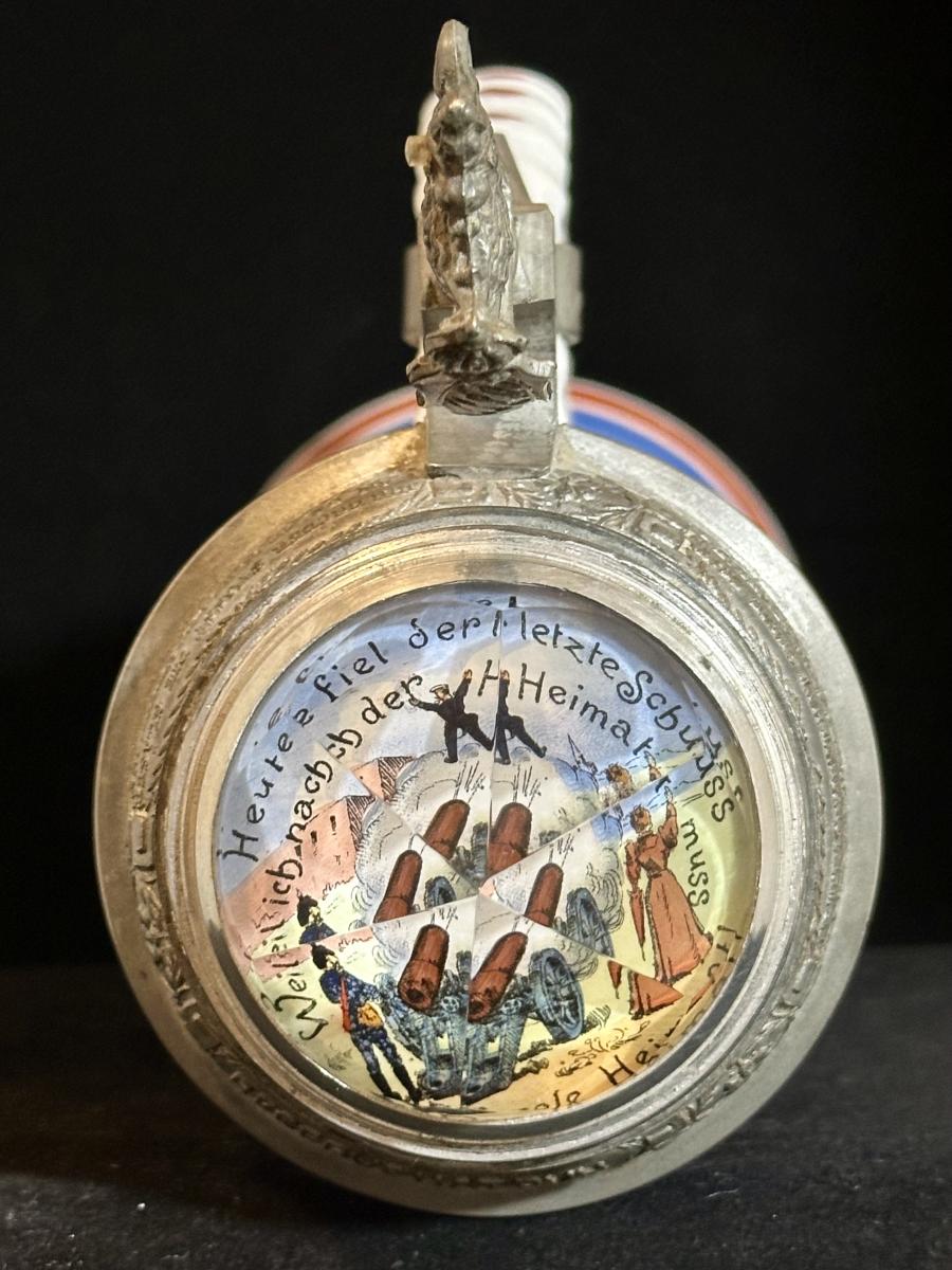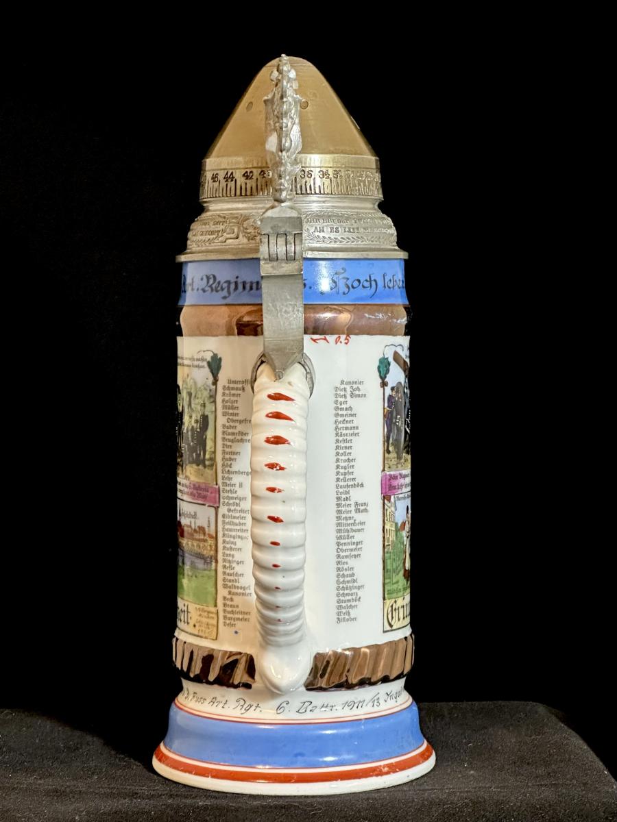 Pewter lid is designed as an adjustable artillery shell which unscrews and shows a prism. The stein originally had a Stanhope and although the magnifying lense is still present, the image has disappeared. The roster includes the names of 5 NCOs, 13 PFCs, 12 Privates, and 42 Kanoniers.