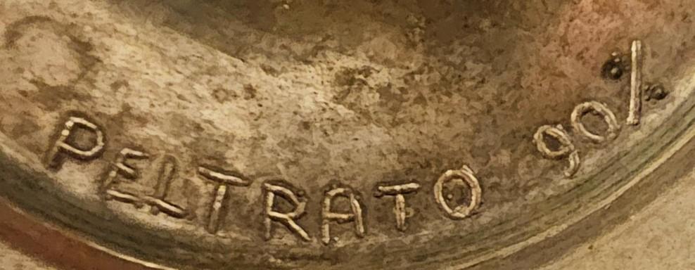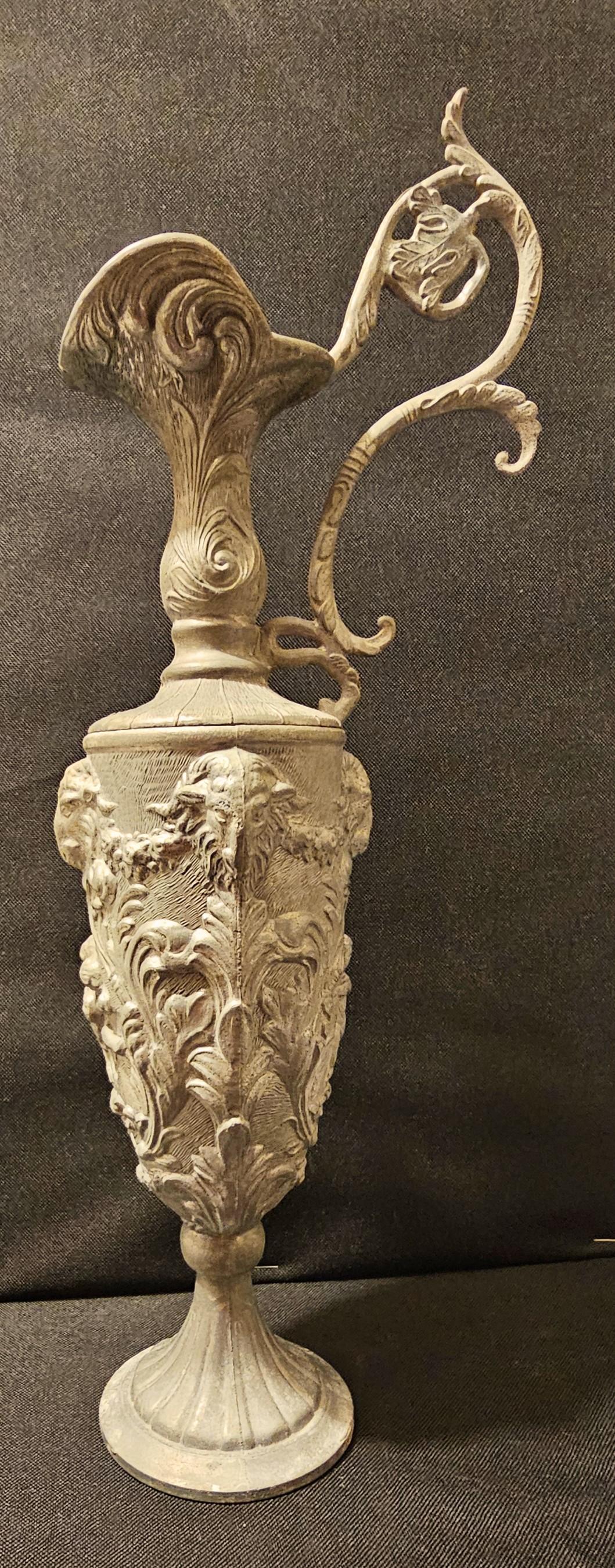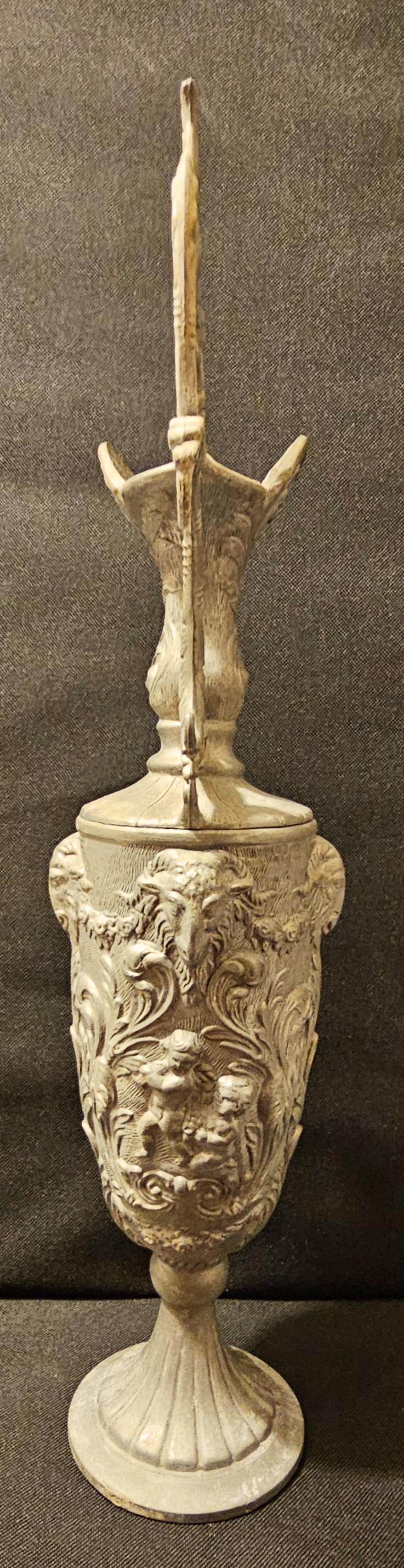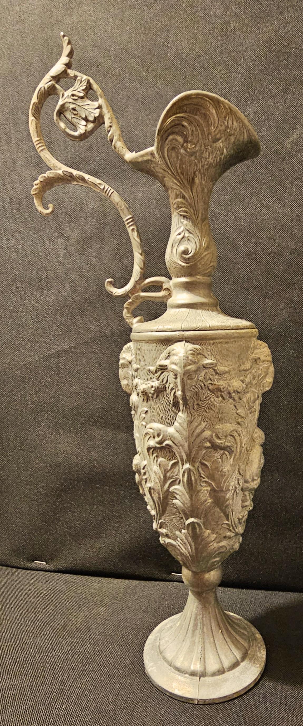 Peltrato 90% pewter ewer depicting goat heads and cherubs. Top comes off and can be used as a chalice