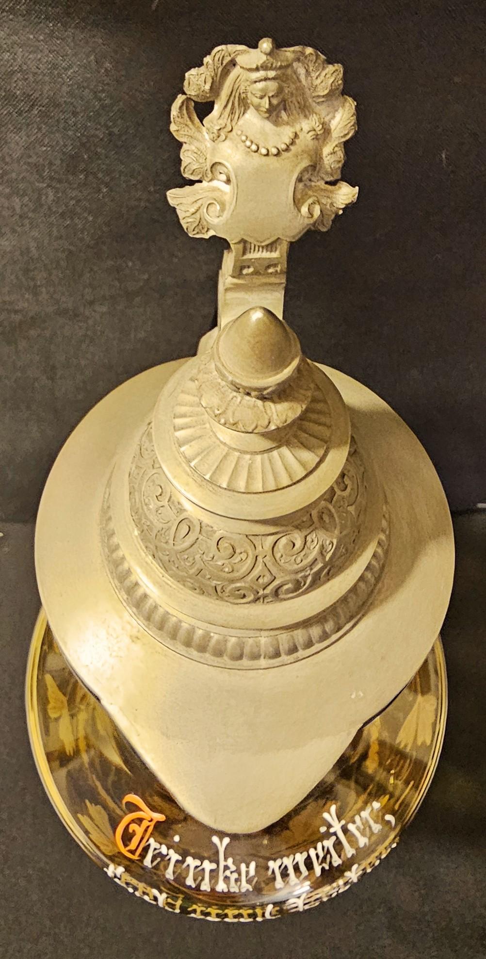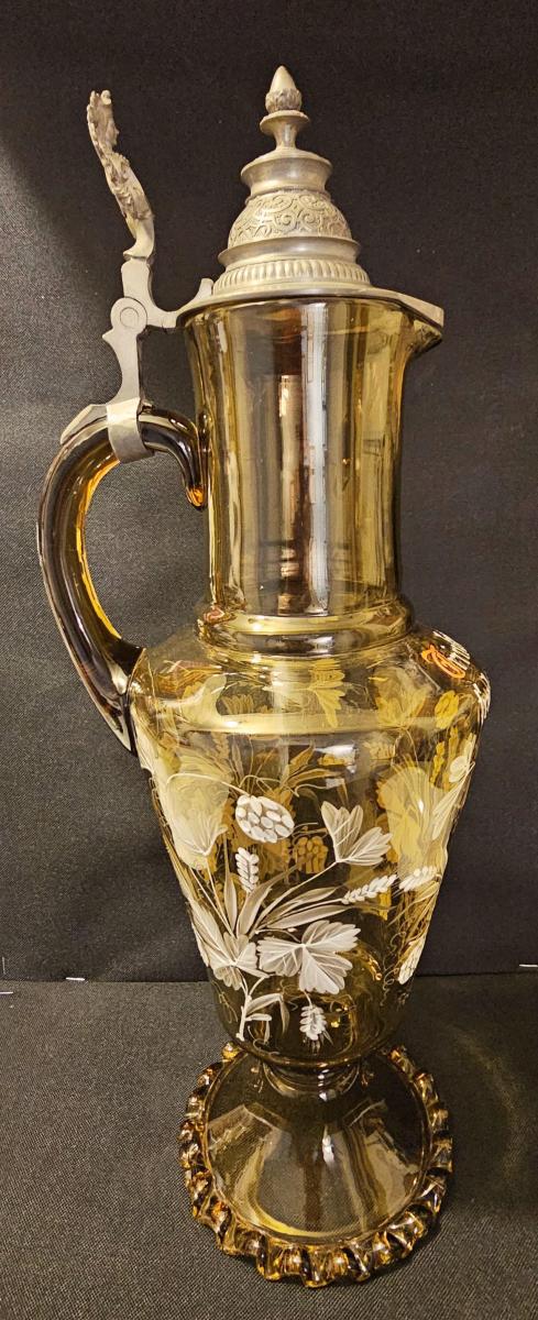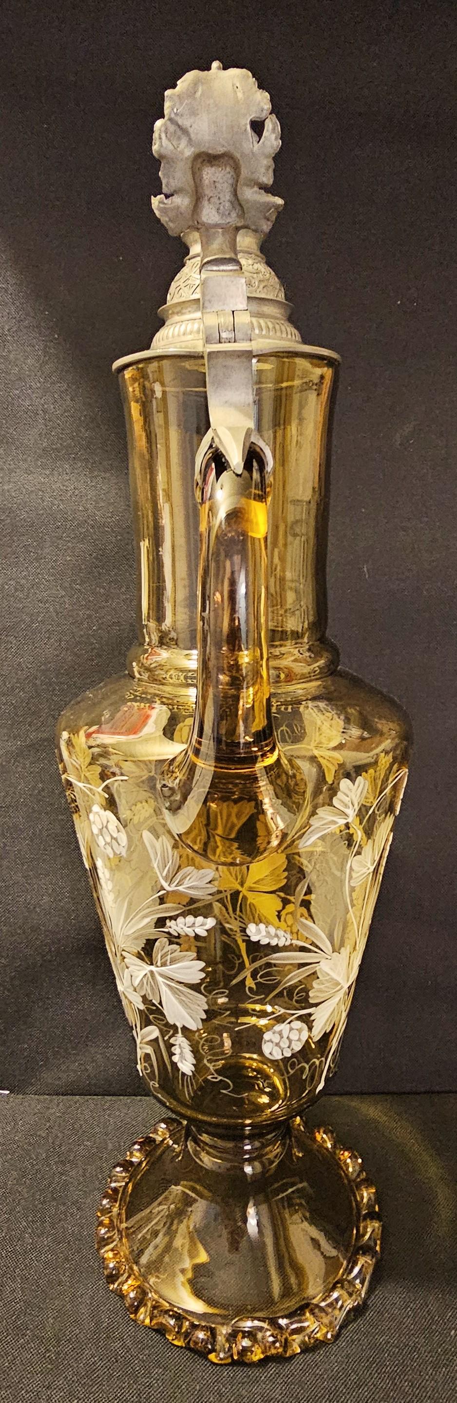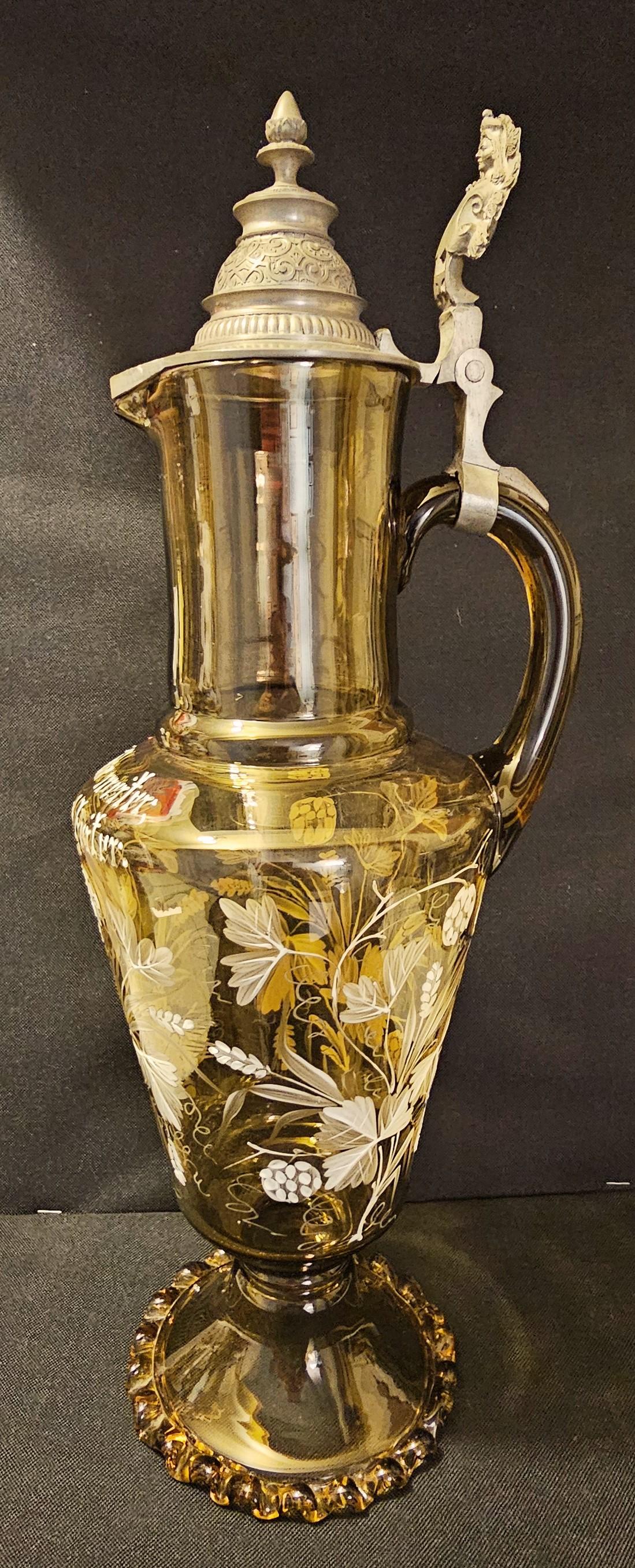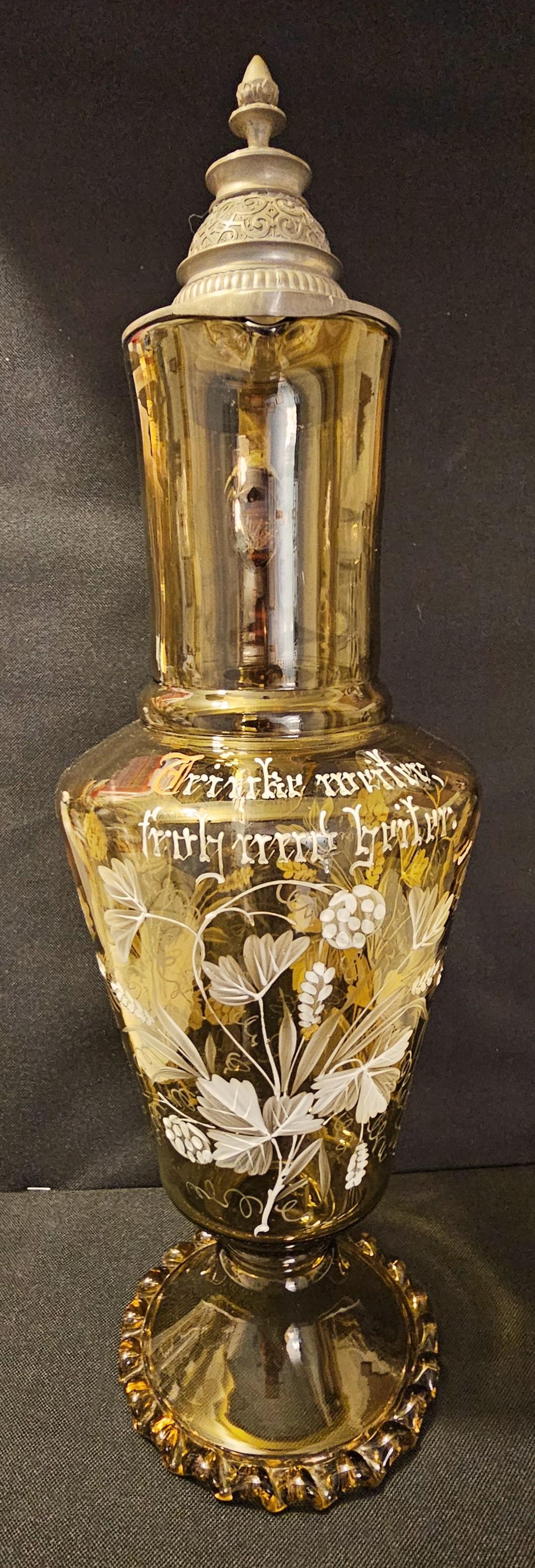Theresenthial 2 liter hand blown amber glass pitcher with enamel saying and etched glass barley and floral design. Maiden head thumb lift, Scalloped edge on footed base. Circa 1890s