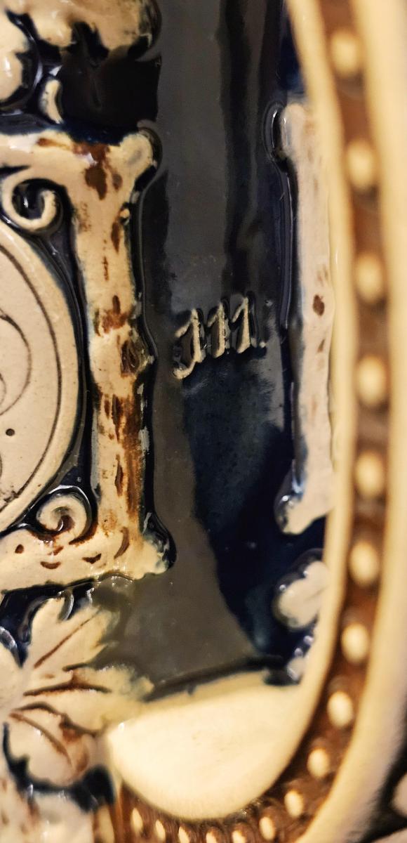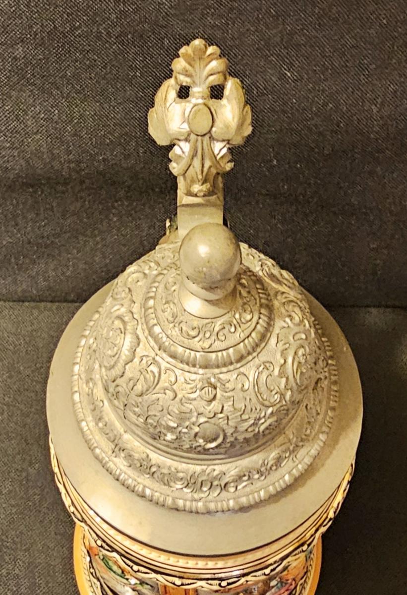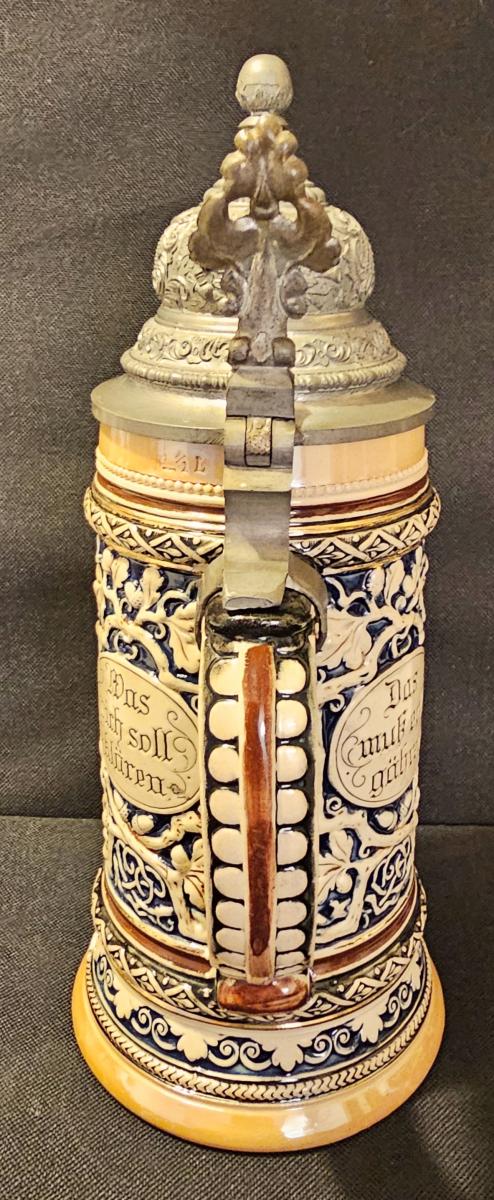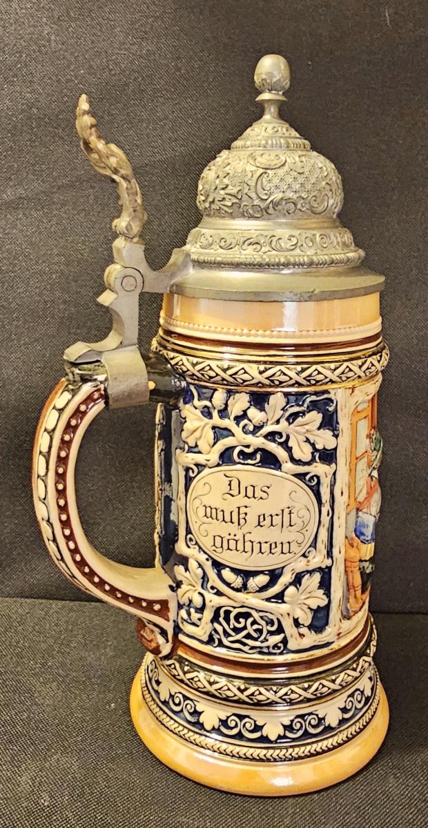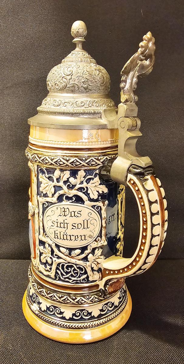 Marzi & Remi full color Finger Wrestling 1/2 liter stein featuring three people thumb wrestling at a table. Sayings on each side "Was sich soll klaren" and "Das muk gahren" translates to " What should be clarified must first ferment" Circa 1890s