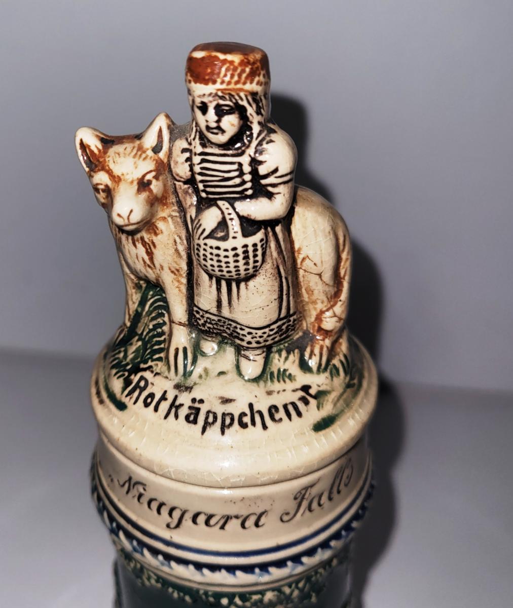 The figural lid has the text "Rotkäppchen" or Red Riding Hood