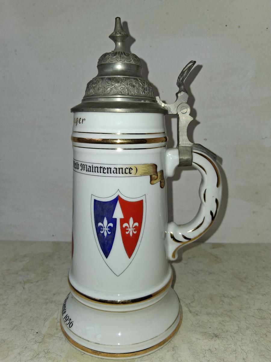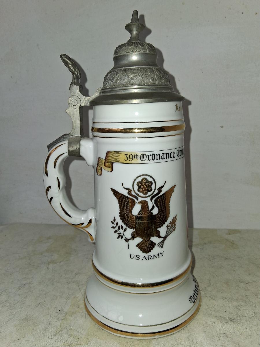 The top front of the stein names it to Ken Metzger. The middle has the standard symbol of ordnance with the banner "39th Ordnance Company (Field Maintainvce)". The bottom of the front gives the location and 1956. The location gave me some trouble. It appears to say Derbun France. Therre is no Derbun but there is a small town named Derban. However as it turns out the 39th Ordnance Co served in Verdun France. The left side has the insignia of the United States Army. The right side I have been unable to locate. It appears to be French due to the fluer de lis and the red, white, and blue colors (French flag). But it looks nothing like the coats of arms of either Derban or Verdun. Another element on this stein which isn't common among Cold War steins is a music box in the base. I has no lithophane.,