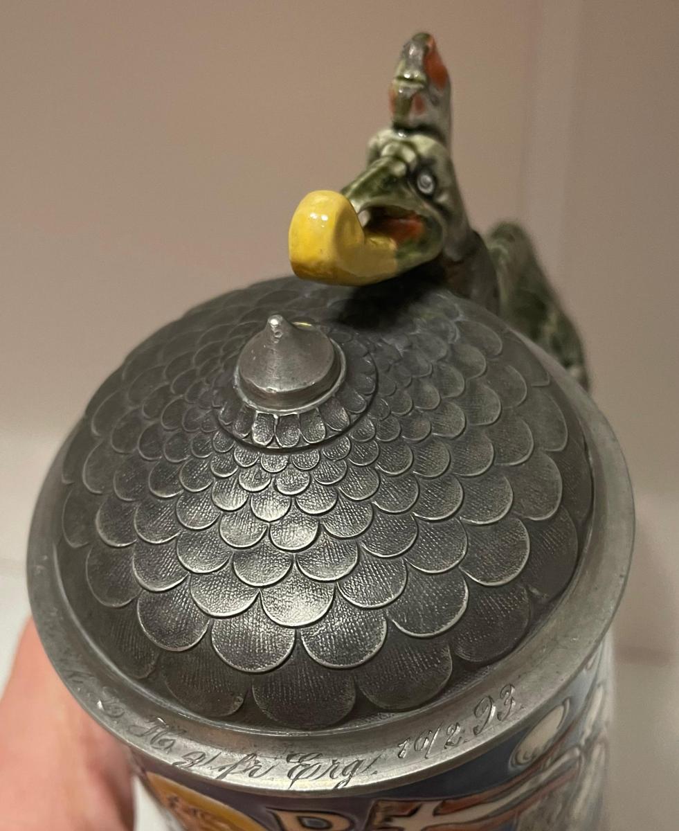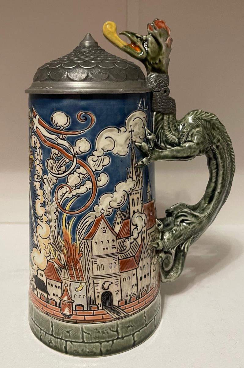 Typically seen with a pewter “tiled” rooftop lid and a ceramic dragon head thumblift. Other variations include a smooth pewter rooftop lid, a pewter lid with a relief depiction of Munich, and varying steeple pewter lids mated to a either a pewter or ceramic dragon head thumblift. Deduct 20% for versions with either Munich lid or the steeple lid.