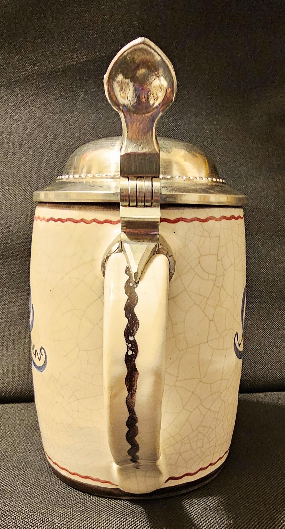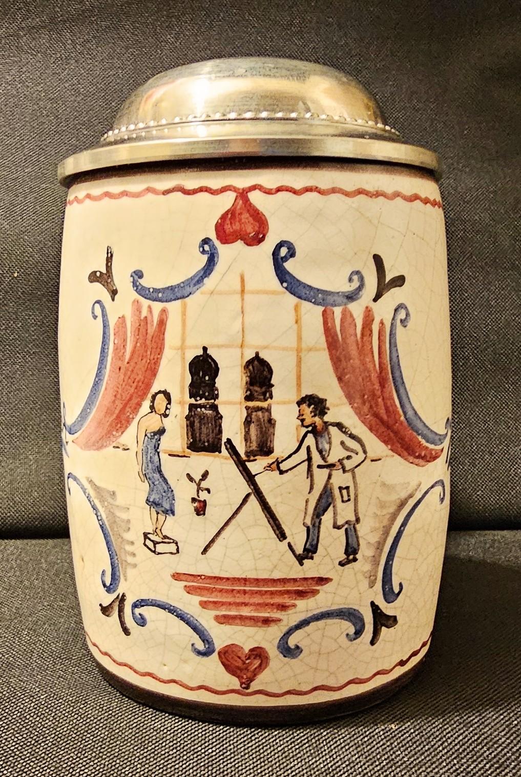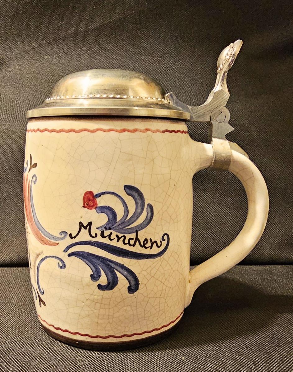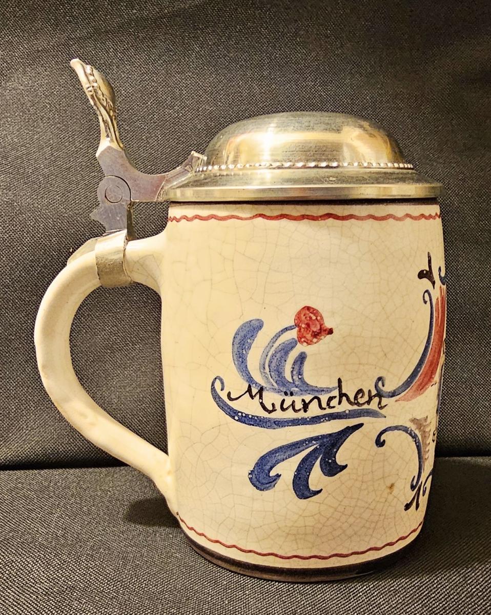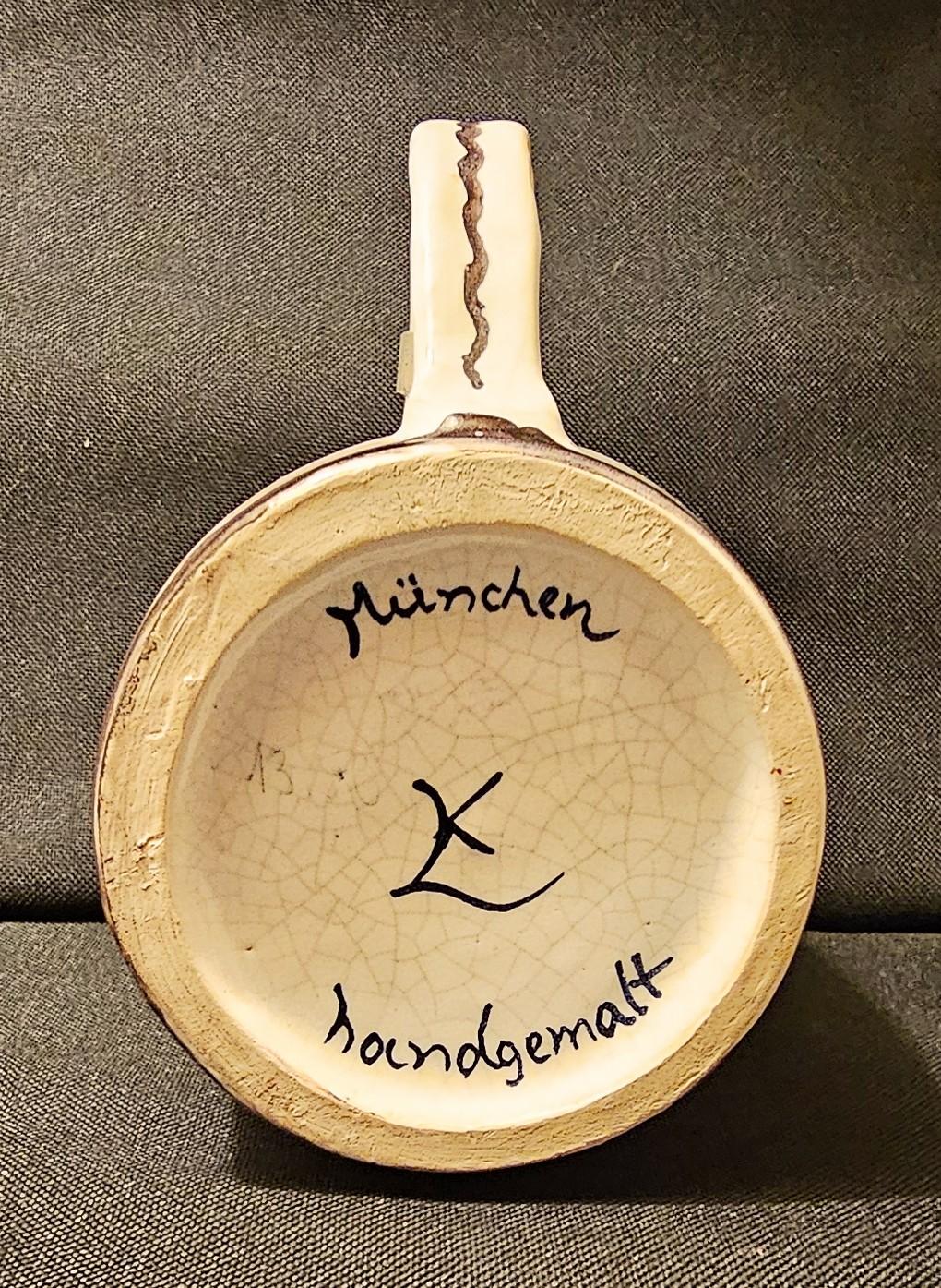 1/2 Liter Munchen stein featuring a painter and subject. Munchen written on both sides. Unable to determine maker mark on bottom.