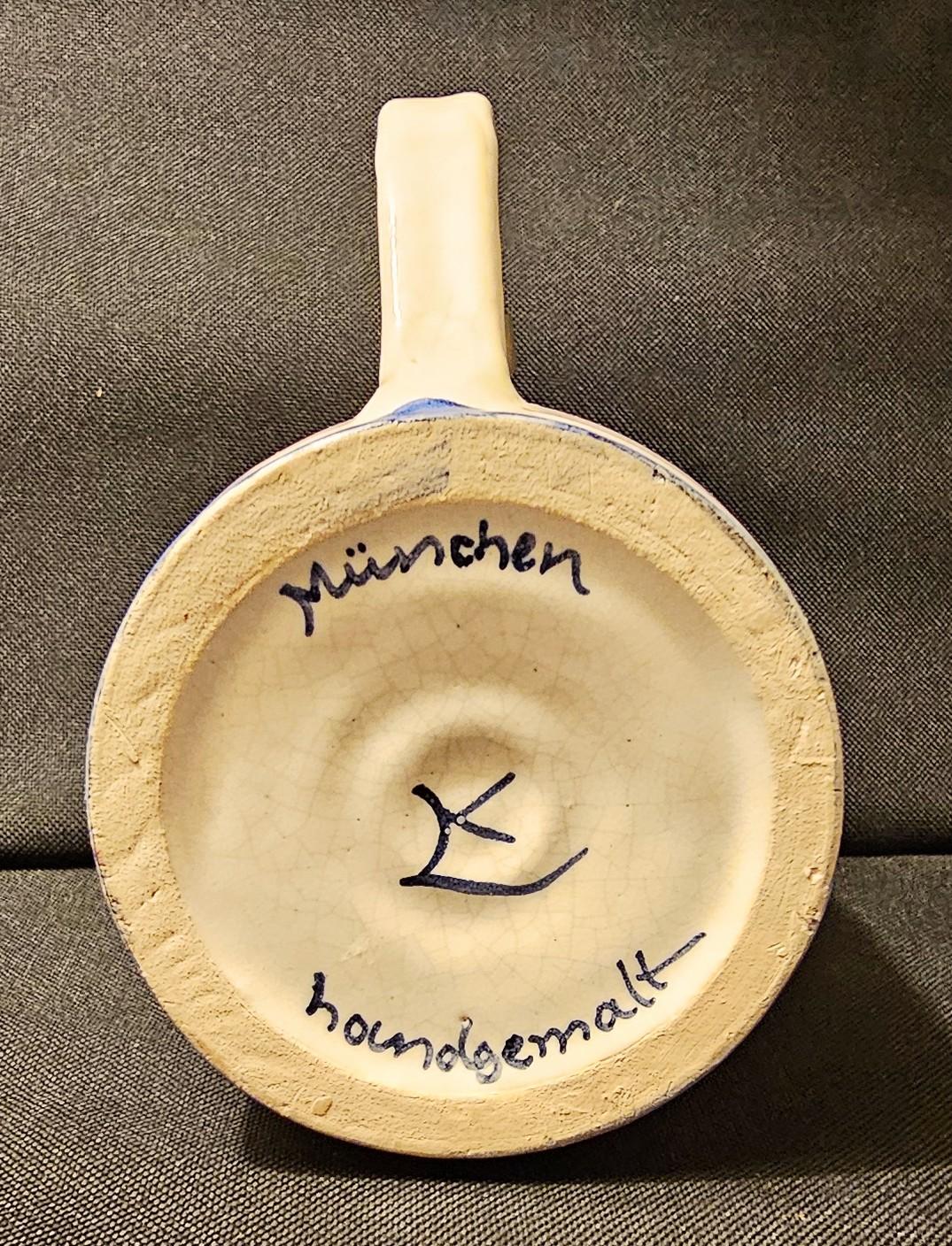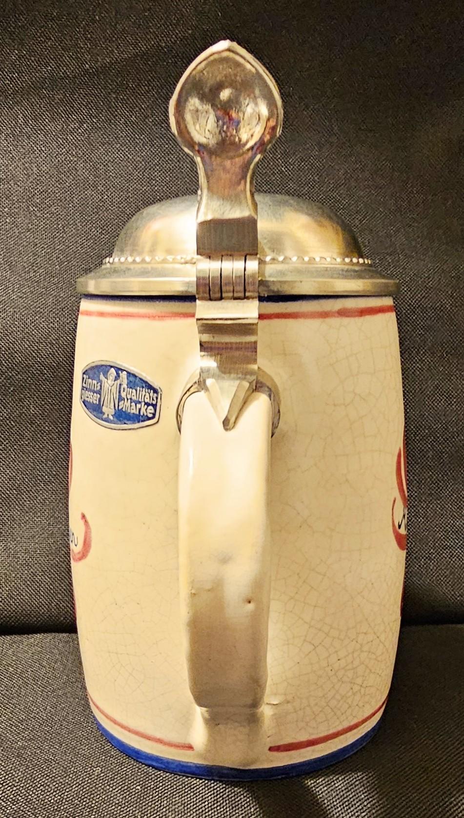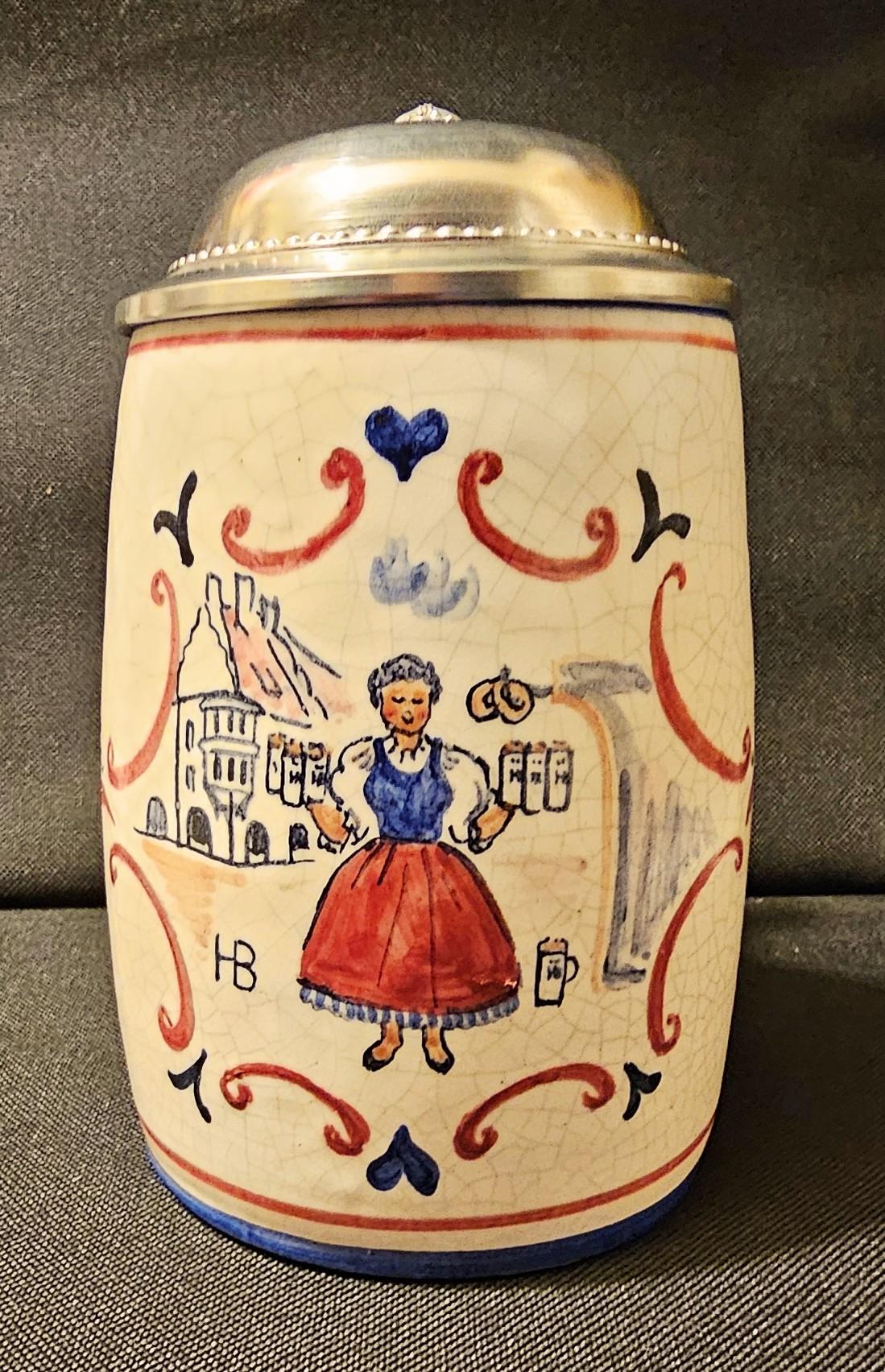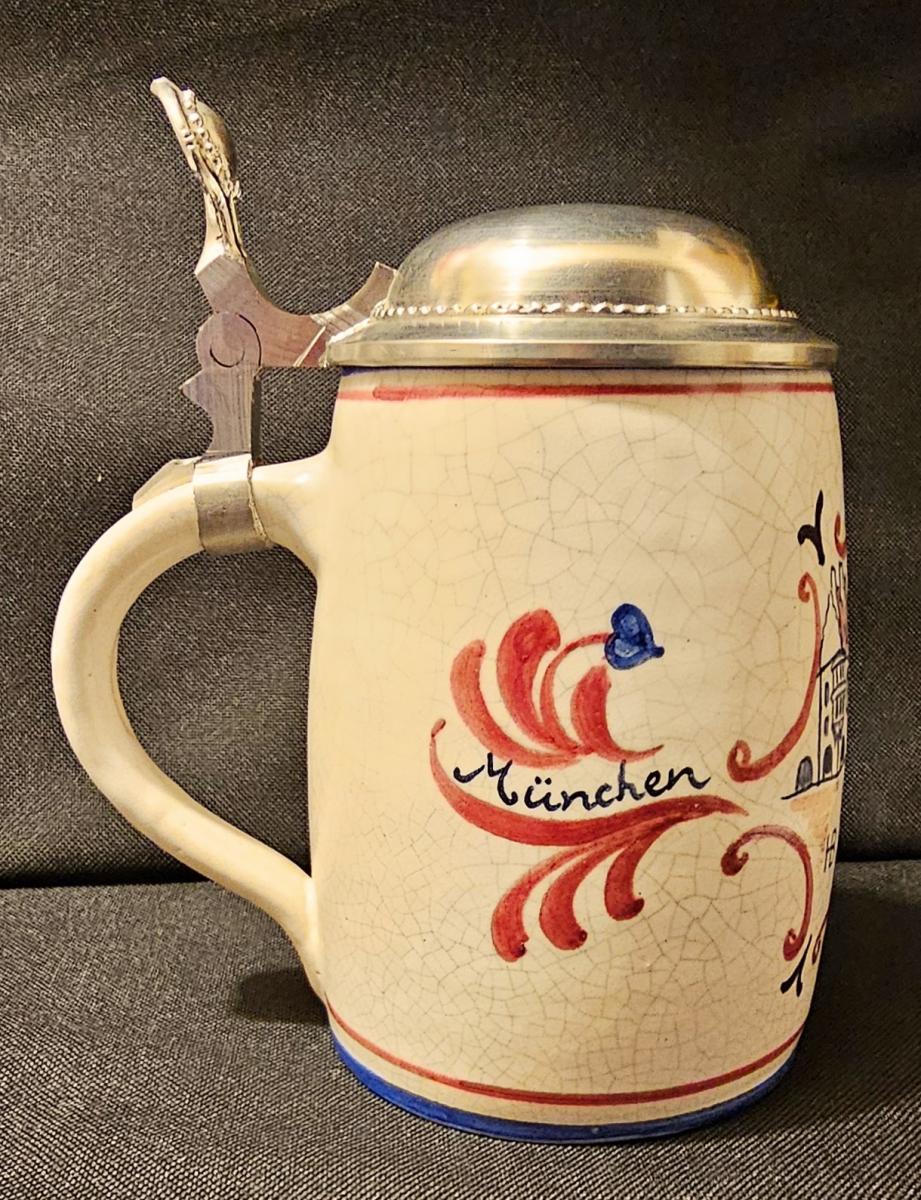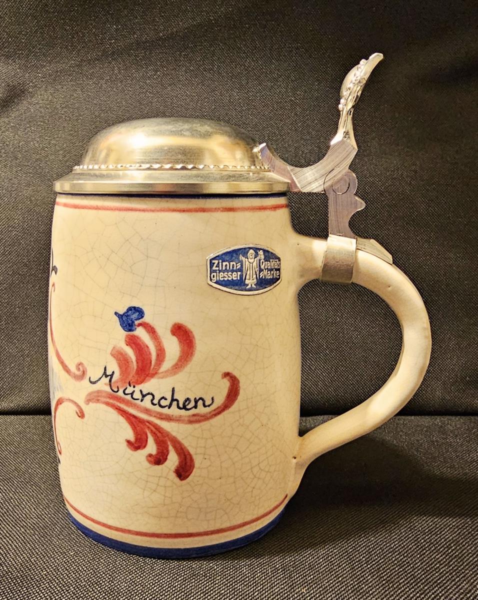 1/2 Liter Munchen stein featuring a beer maiden wearing a red and BLUE dress. Munchen written on both sides. Unable to determine maker mark on bottom.