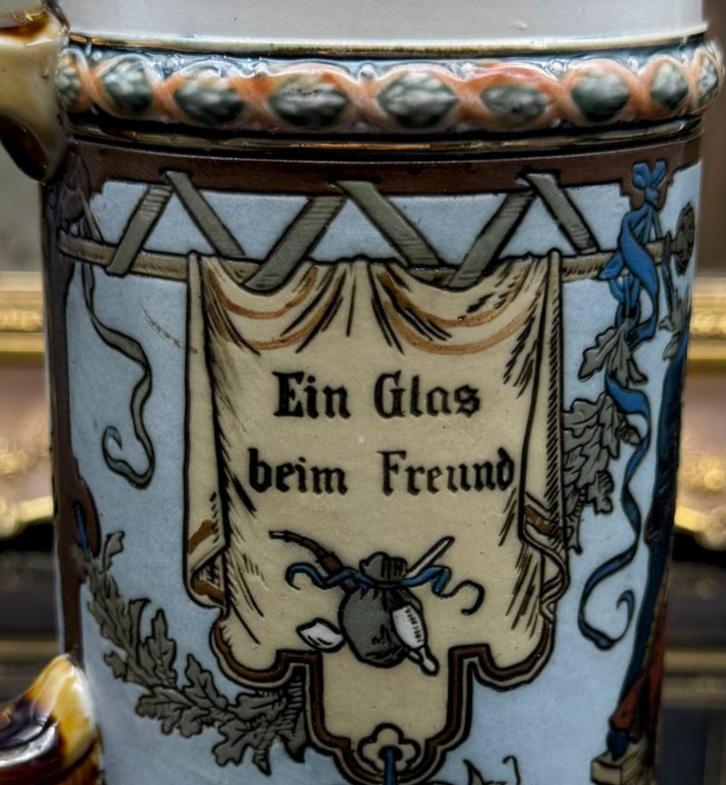 On the right side of the mug there is an inscription in German: "Ein Glas beim Freund". It translates as "A glass with a friend." To the left of the handle there is a continuation of the phrase: "ist gut gemeint". Translated, it means "well-intentioned." Together, these two phrases represent an old and popular German toast: "A glass with a friend — with the best of intentions!"