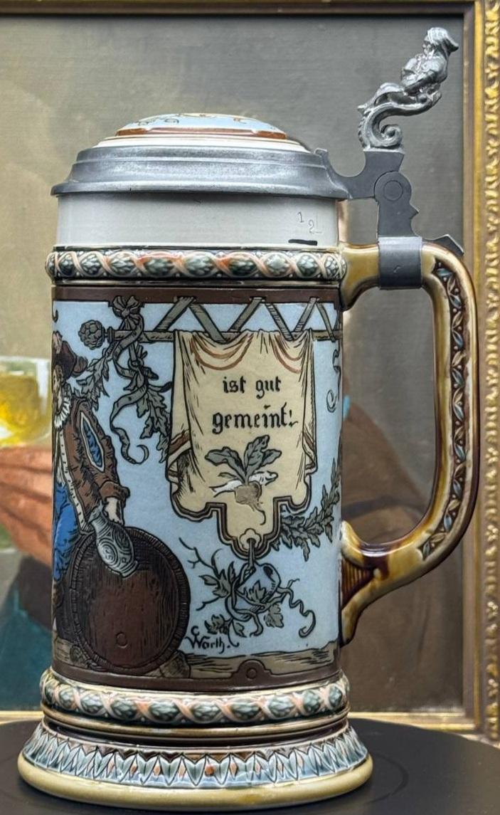 In the Villeroy & Boch product catalog, the mold of this mug is listed under the number 1932. She was given the name "Cavaliers drink." Although, in my opinion, the mug should be called "Bosom friends will always find a reason to drink." The mug is made using a sophisticated technique of engraving on raw ceramics. The design of the mug was created by the famous artist Christian Warth at the end of the 19th century. Christian Warth was born on April 21, 1836 in Birkenfeld. In early 1890, he suffered a severe stroke and died on March 28, 1890. Christian Warth's products were a great commercial success. Many products were manufactured at Villeroy & Boch factories at least until 1906.