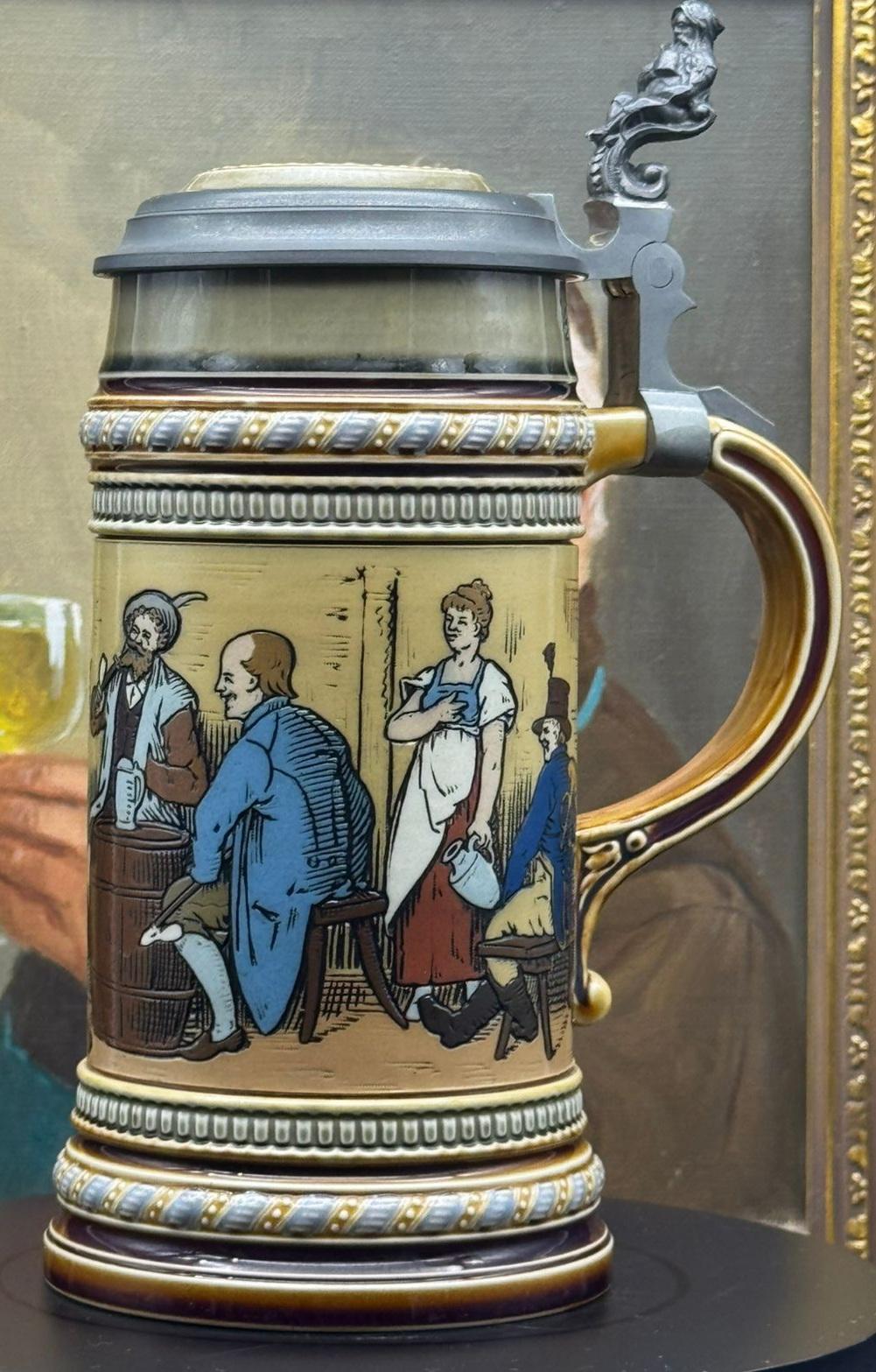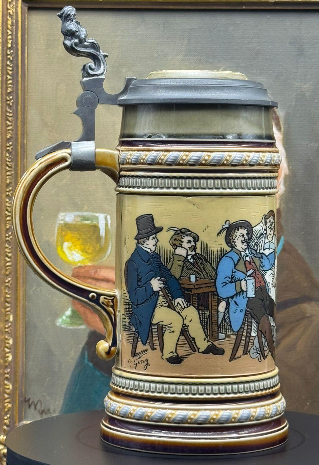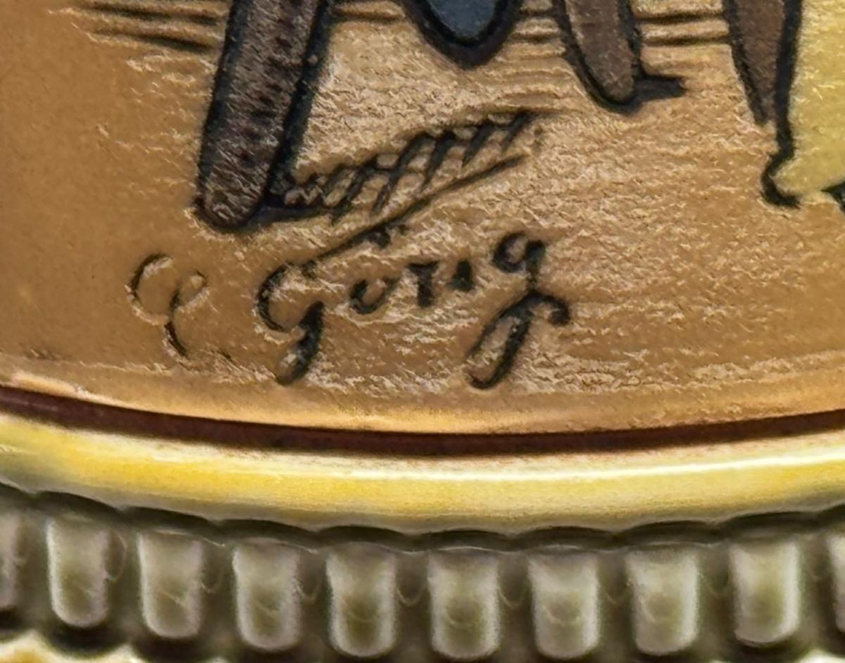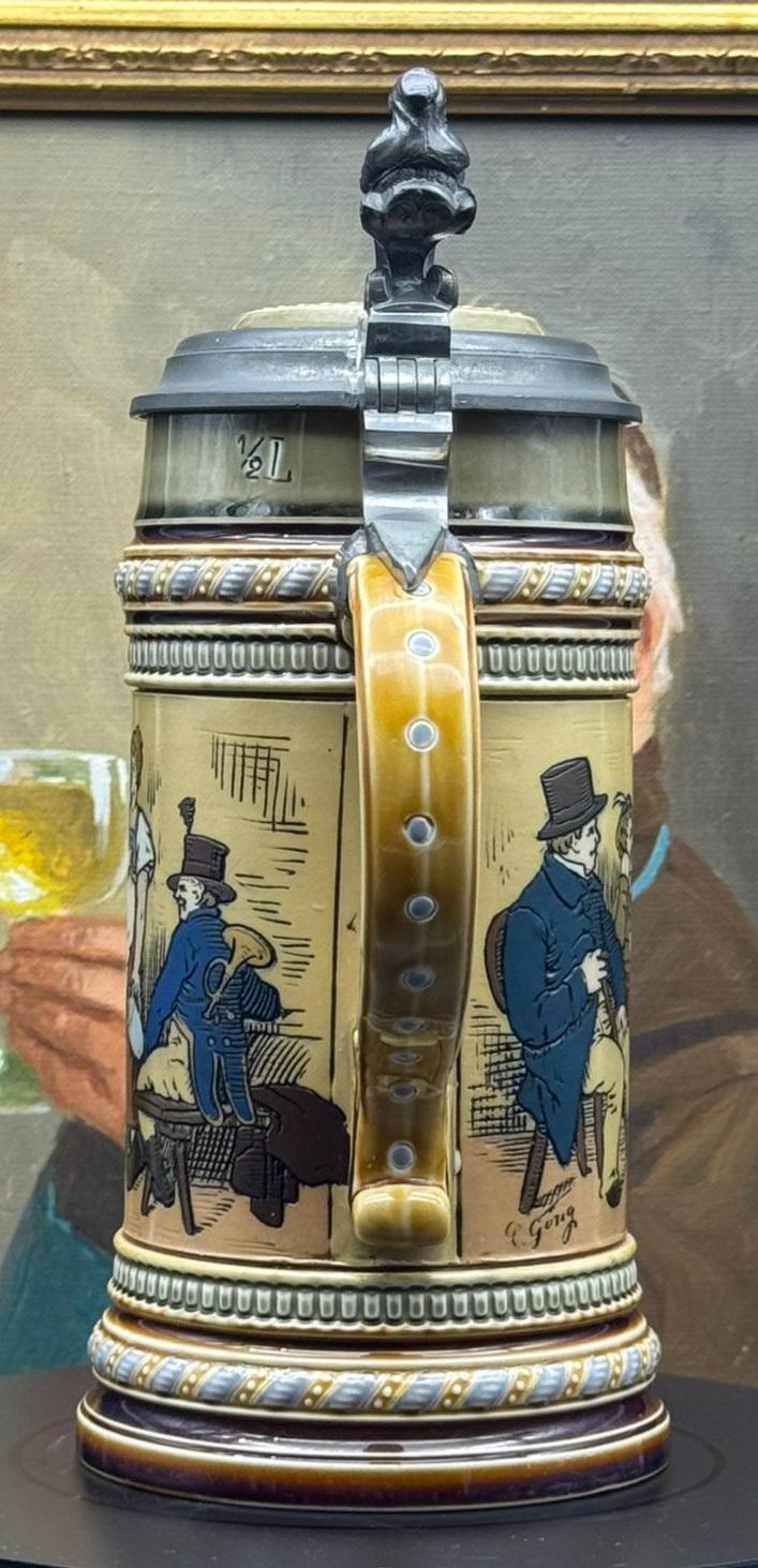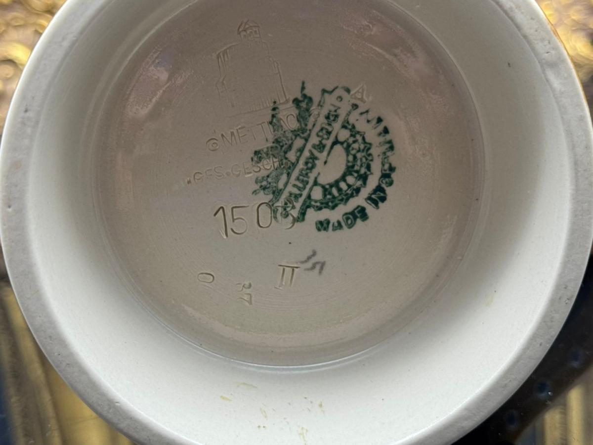 This vintage 0.5 liter beer mug was made in 1887 at the famous Villeroy & Boch factory in Metlach. In the Villeroy & Boch catalog, the mold of this mug has the number 1508. See the link: [link]
