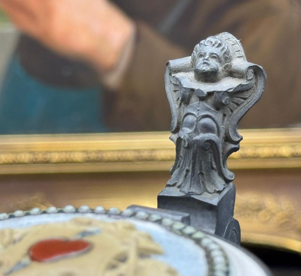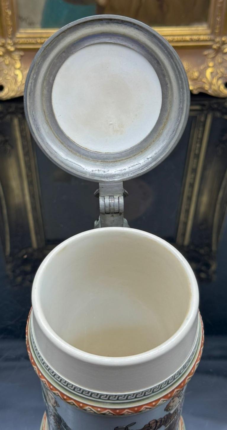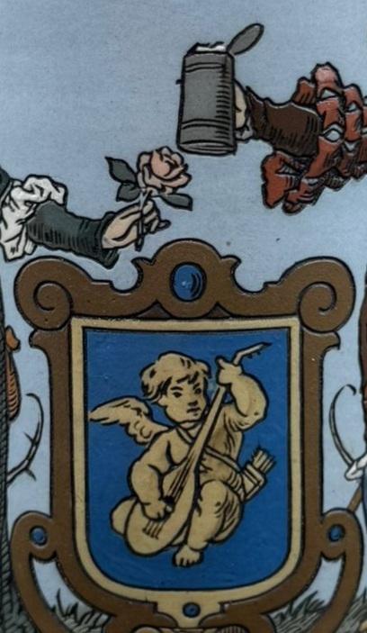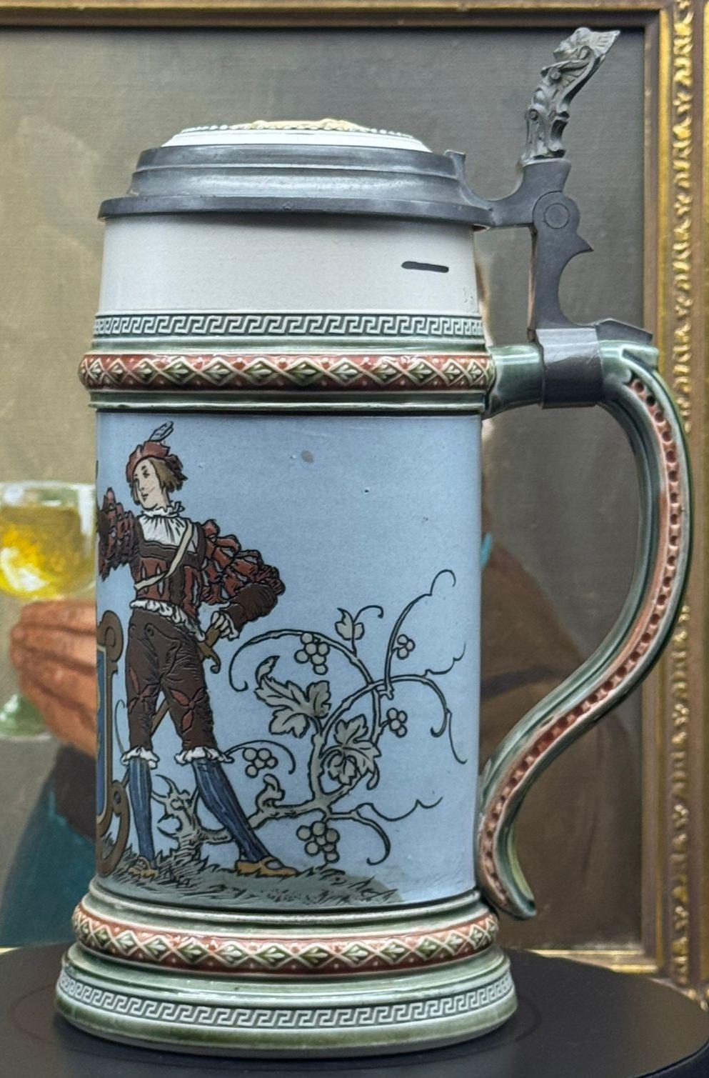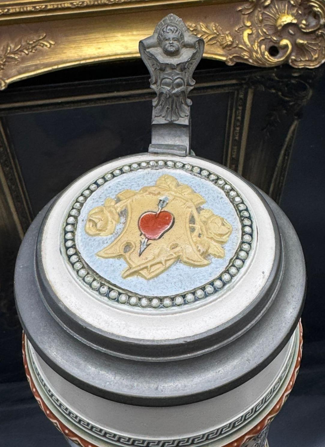 The mug was made in 1897 at the famous Villeroy & Boch factory in Metlach. In the Villeroy & Boch catalog, the mold of this mug has the number 1725. The mug is topped with an inlaid lid. A heart with an arrow is depicted on the ceramic insert of the lid. This composition is considered a symbol of love. The lid pattern is executed in the technique of moderate relief. The drawing of the mug itself is made in the technique of fine engraving on ceramics. This technique of applying jewelry to ceramics is considered the most difficult and expensive. This is completely manual and highly skilled labor.