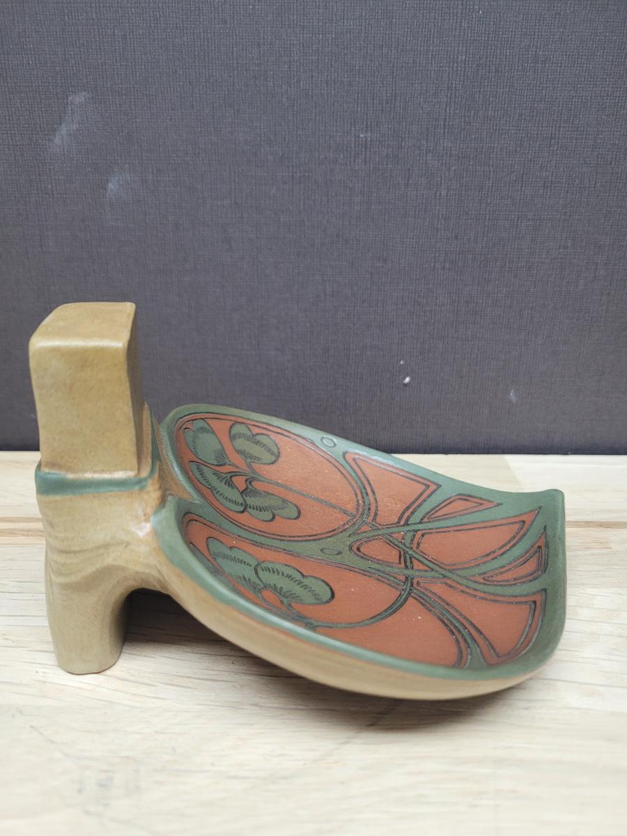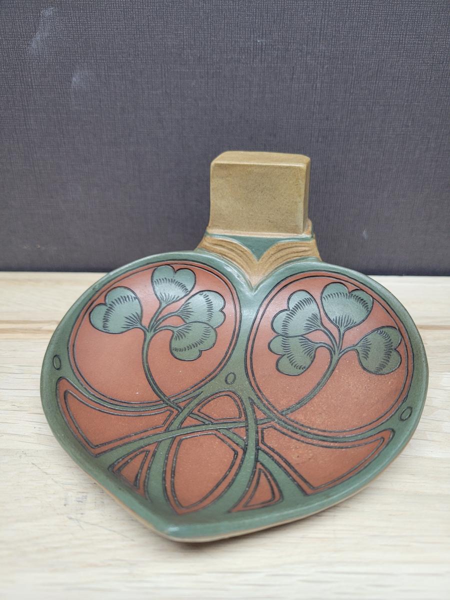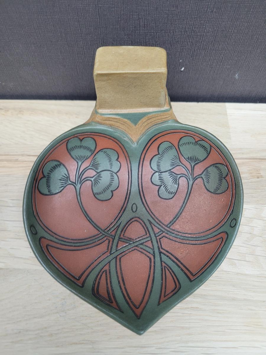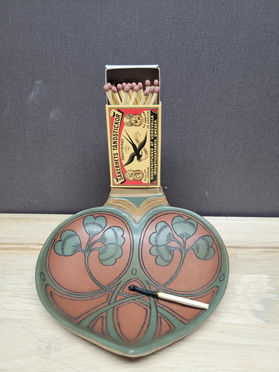 This match box holder was made in 1903 by Villeroy & Boch in Mettlach, Germany. It is decorated in the art nouveau style, typical of the period around 1900.