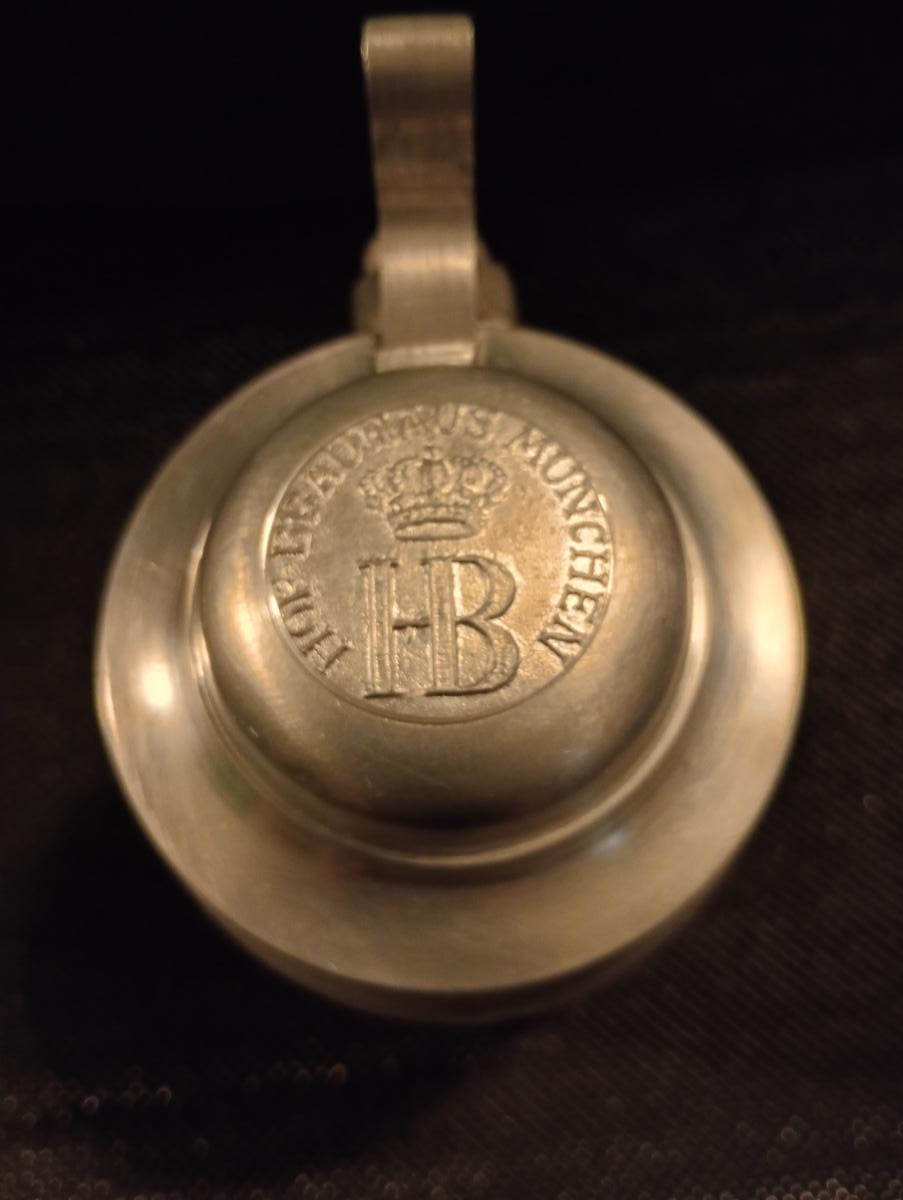 Massive, domed pewter lid with cast relief 3 cm diameter, depicting Brewery Logo and crown surounded by only "HOFBRAUHAUS MUNCHEN". Rare Sample without "Kgl." , neither "Staatl." nor "Stl." Pre-fix, simple Thumb-lift and massive three-ring open hinge.