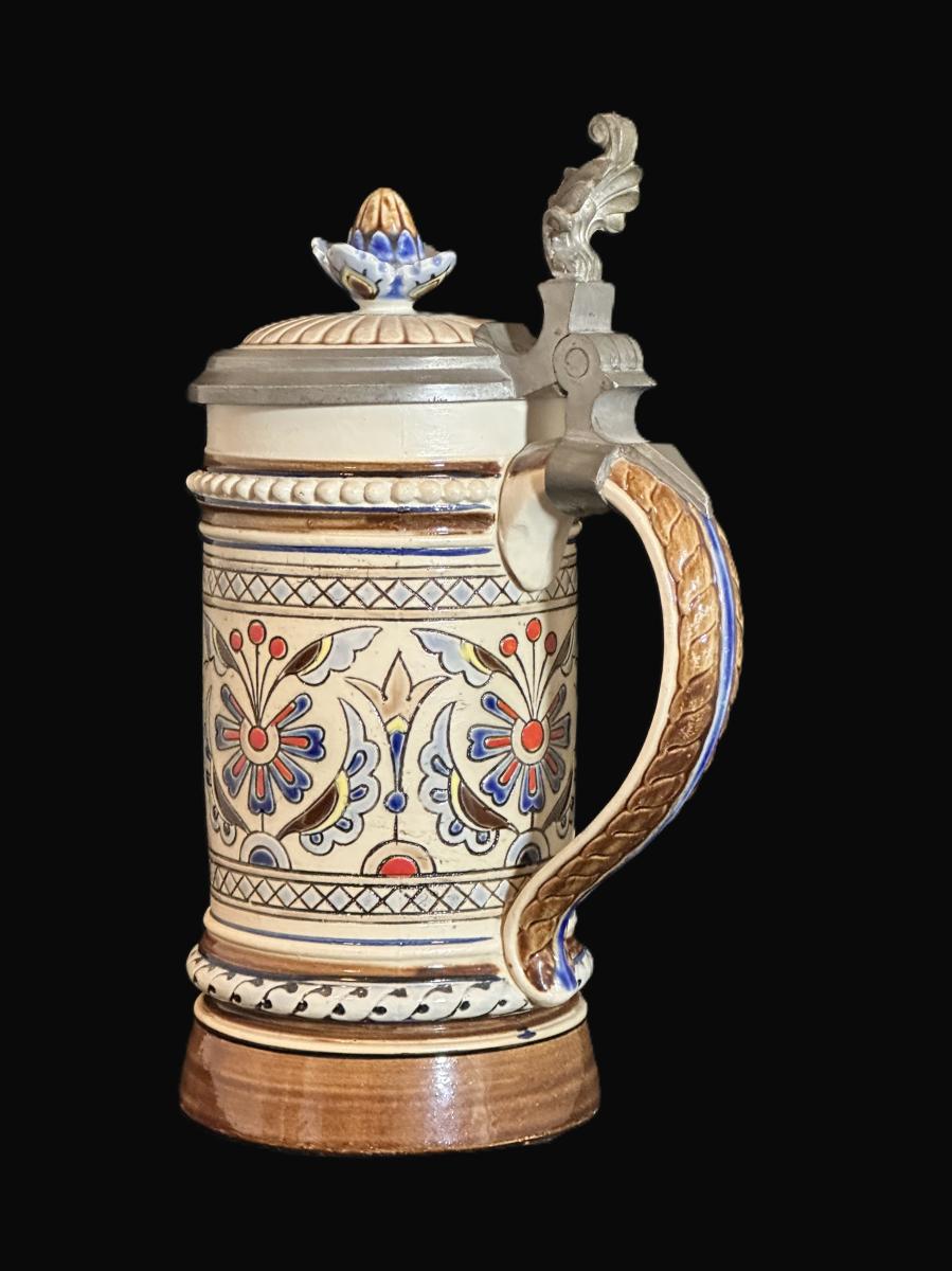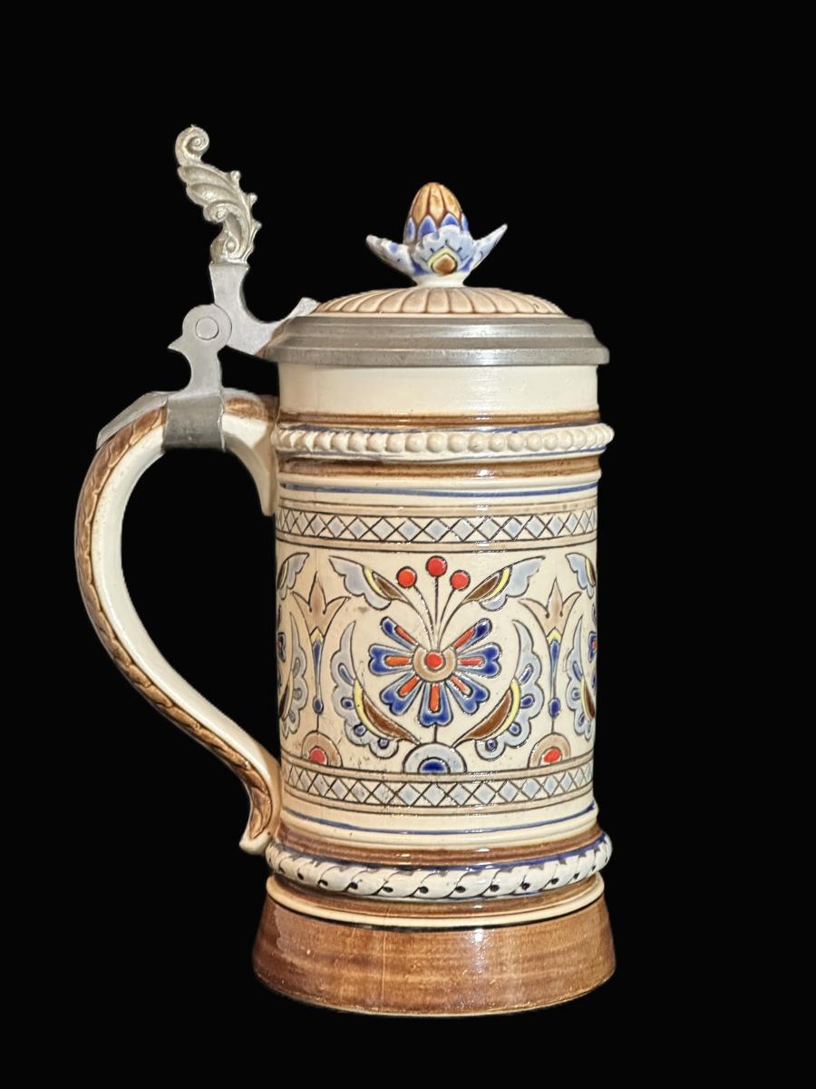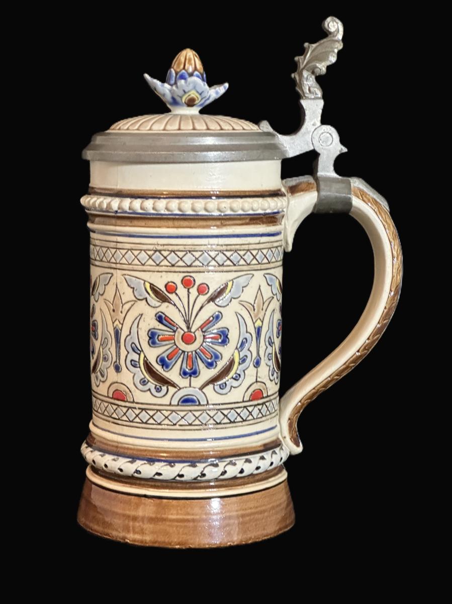 Villeroy and Boch Mettlacj 0.3 liter etched pottery stein mold 1121 with floral scrollwork. The figural lid has a hops bud on it. The Master Stein is mold 1120.