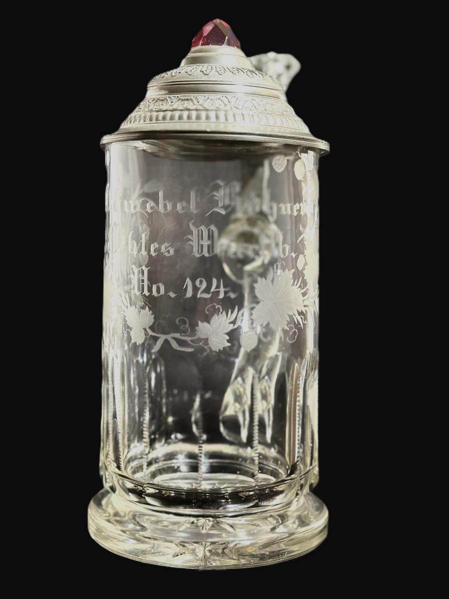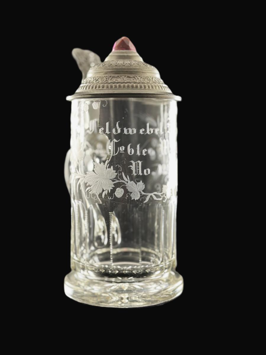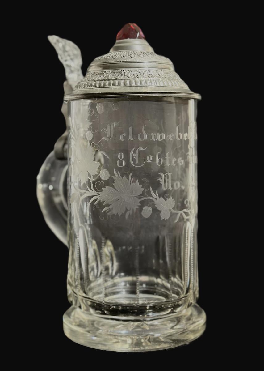Glass 1/2 liter stein engraved with 8 Co. 6tes Wuerttb. No. 124 -[Infanterie-Regiment „König Wilhelm I.“ (6. Württembergisches) Nr. 124] (Infantry Regiment "King William I." 6th Wuerttemberg) No. 124) named to Feldwebel (Staff Sergeant).