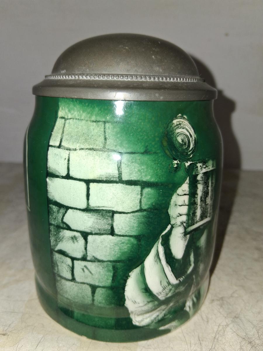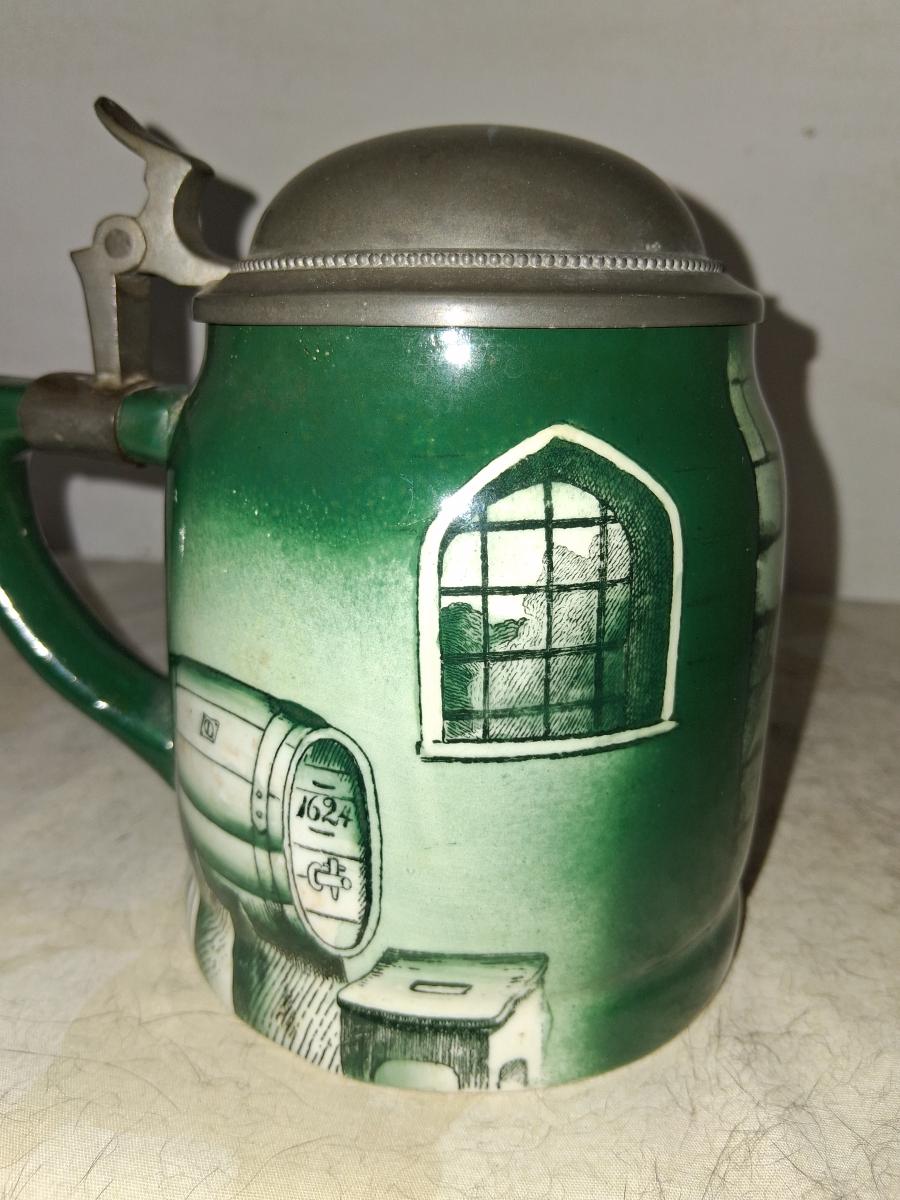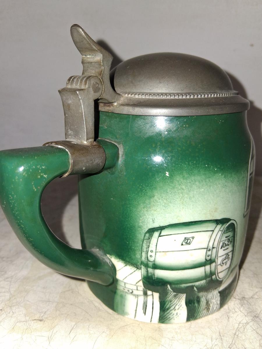 Manning Bowman mark on base. Manning Bowman was based in Meriden, Connecticut and existed from 1849 to 1945. They worked principally in pewter in this market and provided dthe lids and fittings to most American companies producing steins. They undoubtedly purchased bodies for their steins from another company, possibly the Ceramic Arts Company.