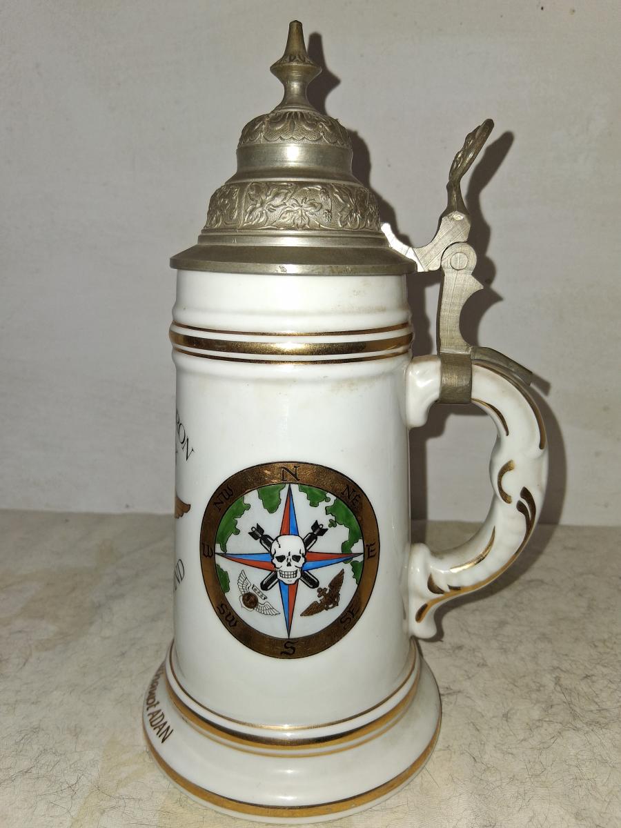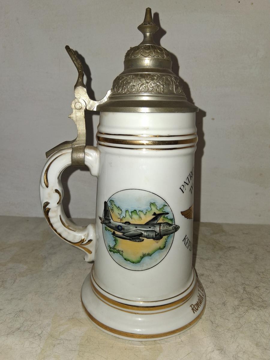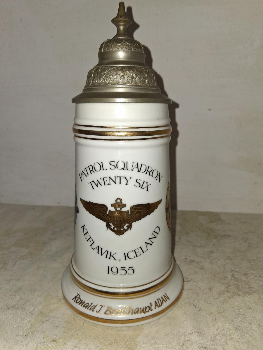 The front of the stein at top says "Patrol Squadron twenty six". In the middle, a Naval aviator badge. Below that is " Keflavik, Iceland 1955". On the front of the base it stein is named to Ronald J. Breithampt ADAN. On the left side is a painting of a VP-26. On the right sid is an insignia that I haven't been able to locate yet.