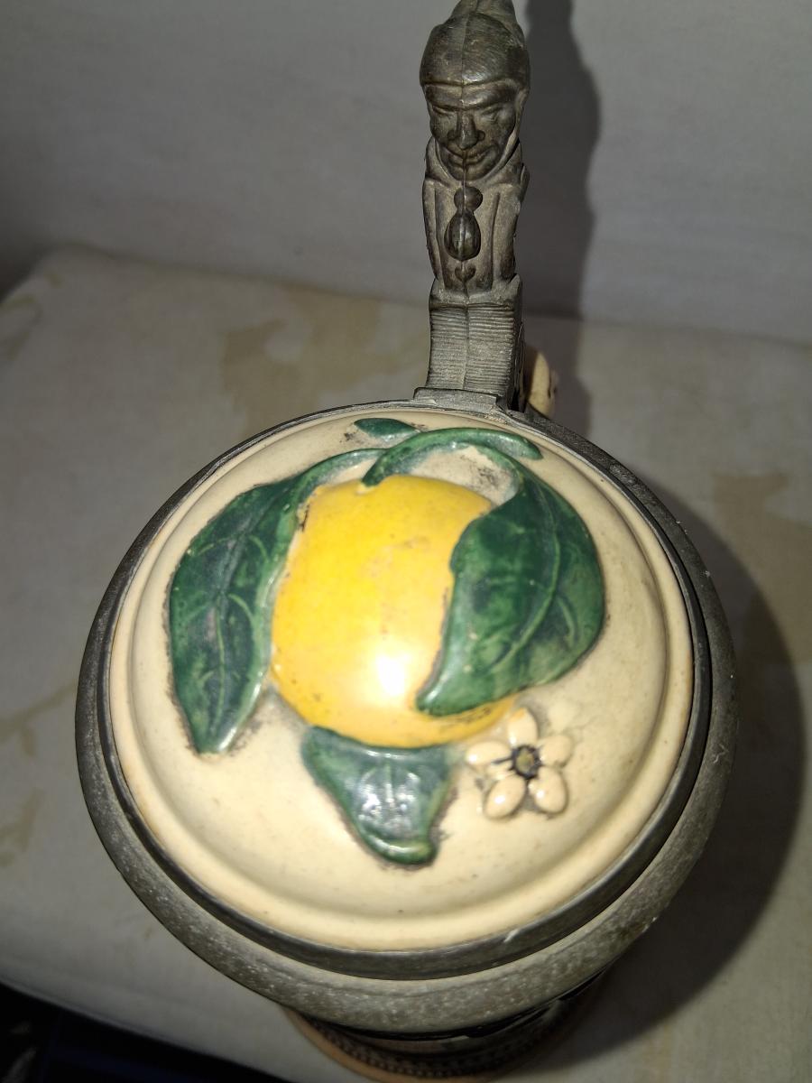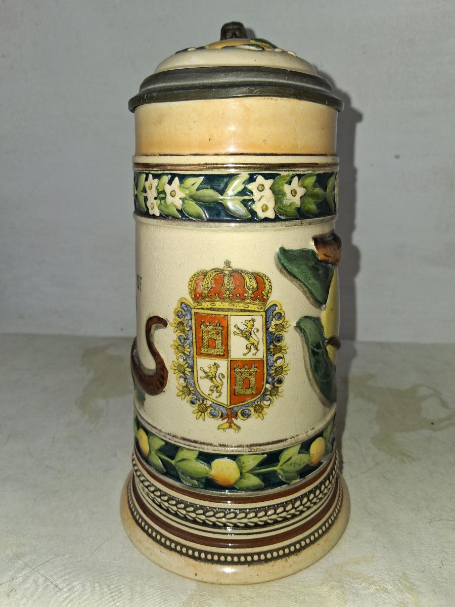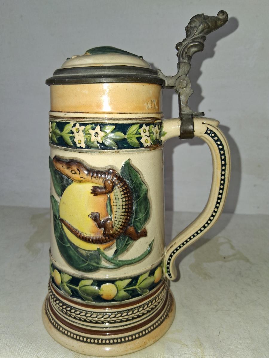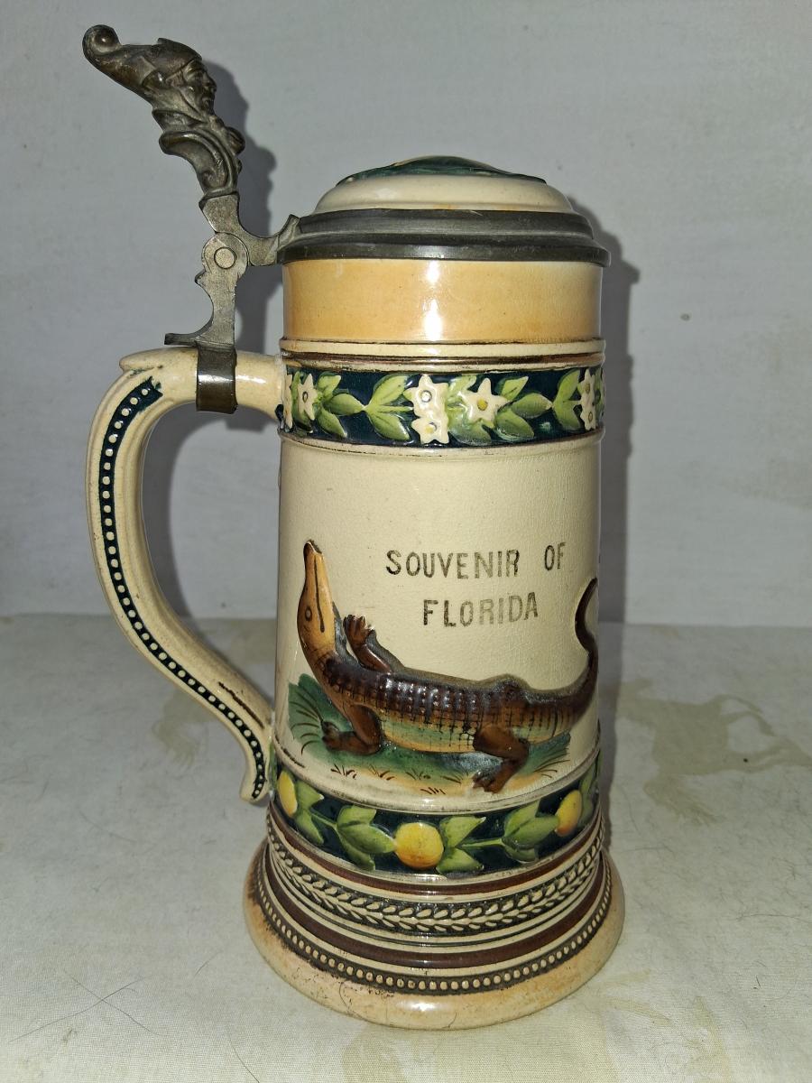There are several similar steins made by Marzi and Remy with various permutations. This one differs from this one [link] in having "Souvenir of Florida" above the alligator. Also this one features Marzi and Remy's jester thumblift (identical to the one used by Villeroy and Boch). Marzi and Remy typically only used this thumblift on it's higher price point steins, usually etched. Recessed base.