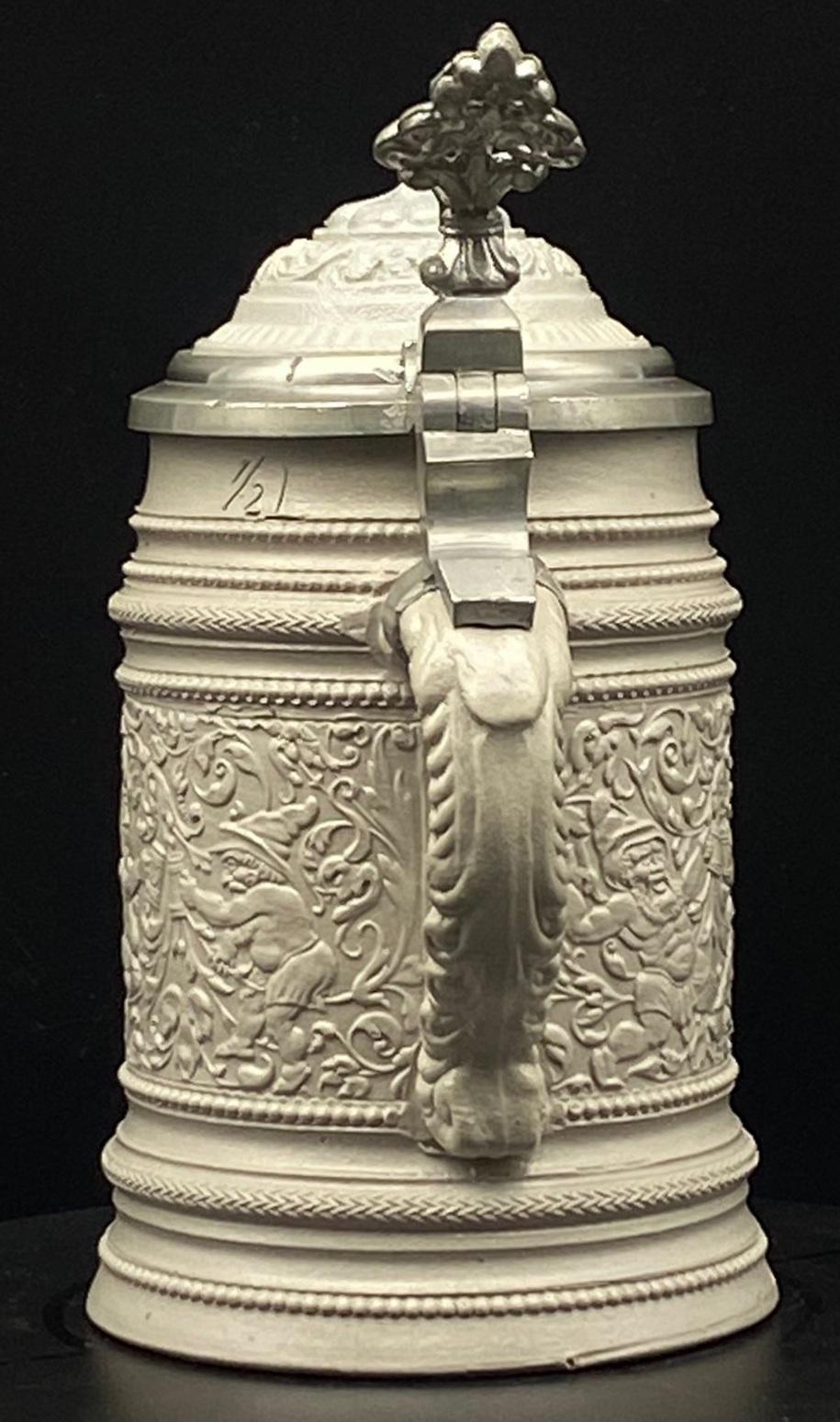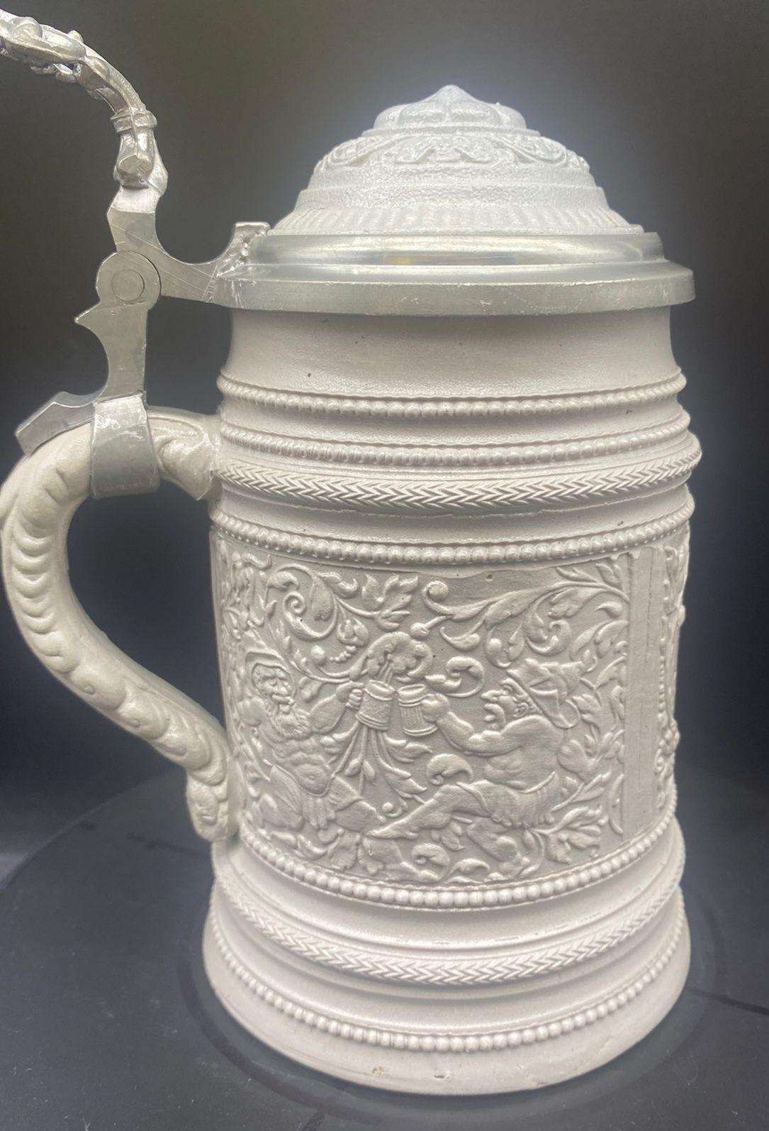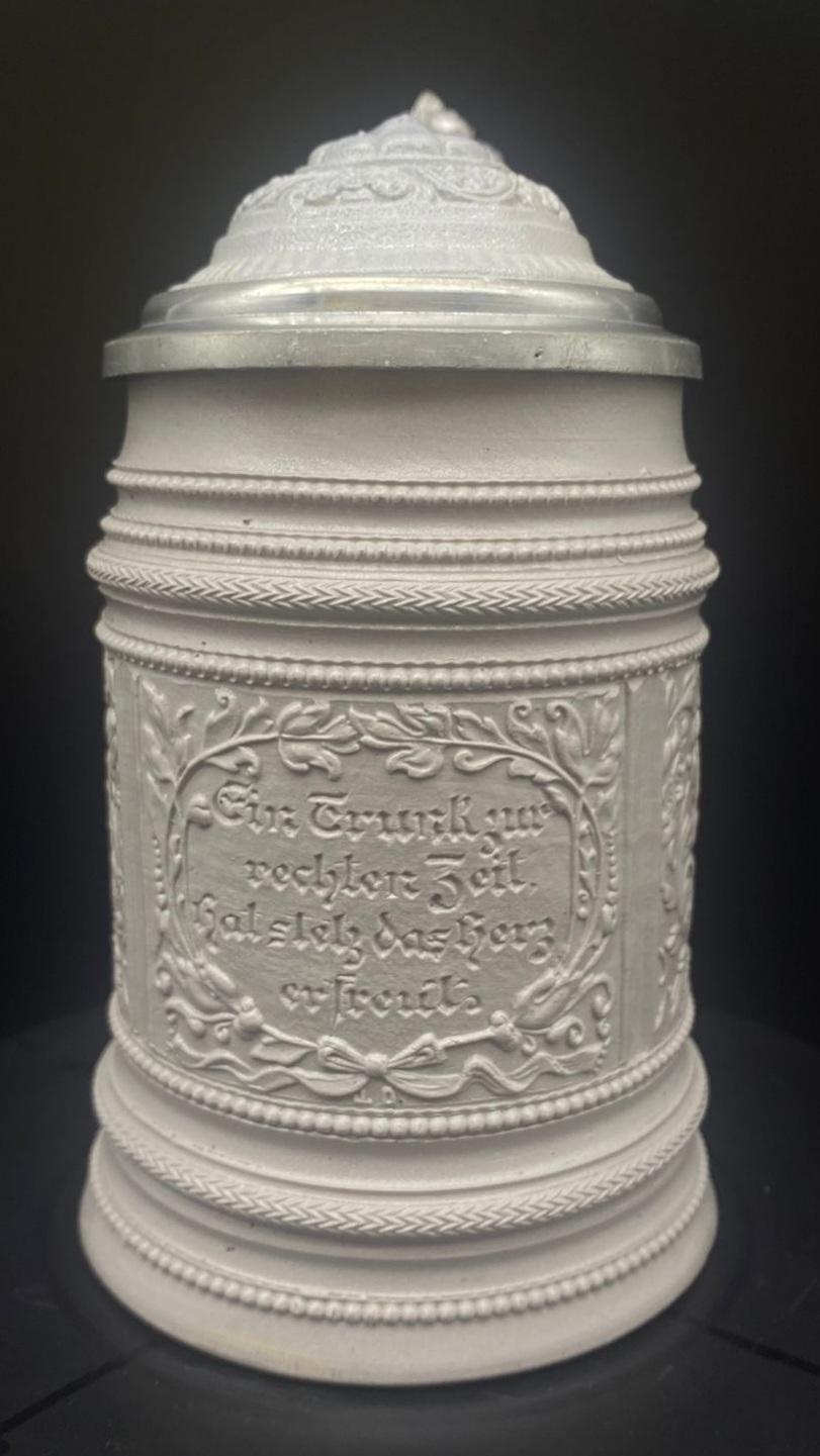 The inscription on the beer mug (stein) in German reads: "Ein Trunk zur rechten Zeit. Hält stets das Herz erfreut". Translated, it means: "A sip at the right time always makes the heart happy." This phrase is a common traditional inscription on German beer mugs, which were often decorated with such sayings to add humor or philosophy to the process of drinking beer.