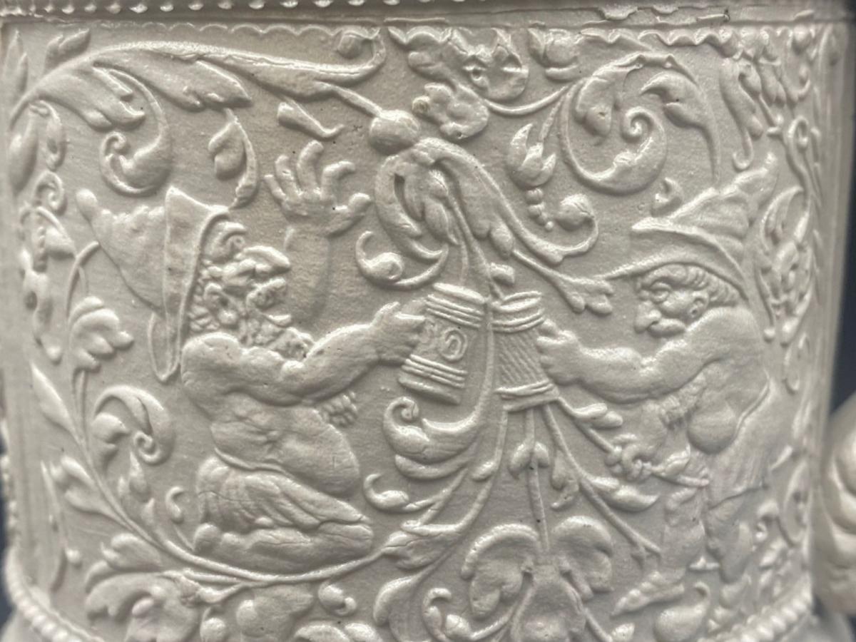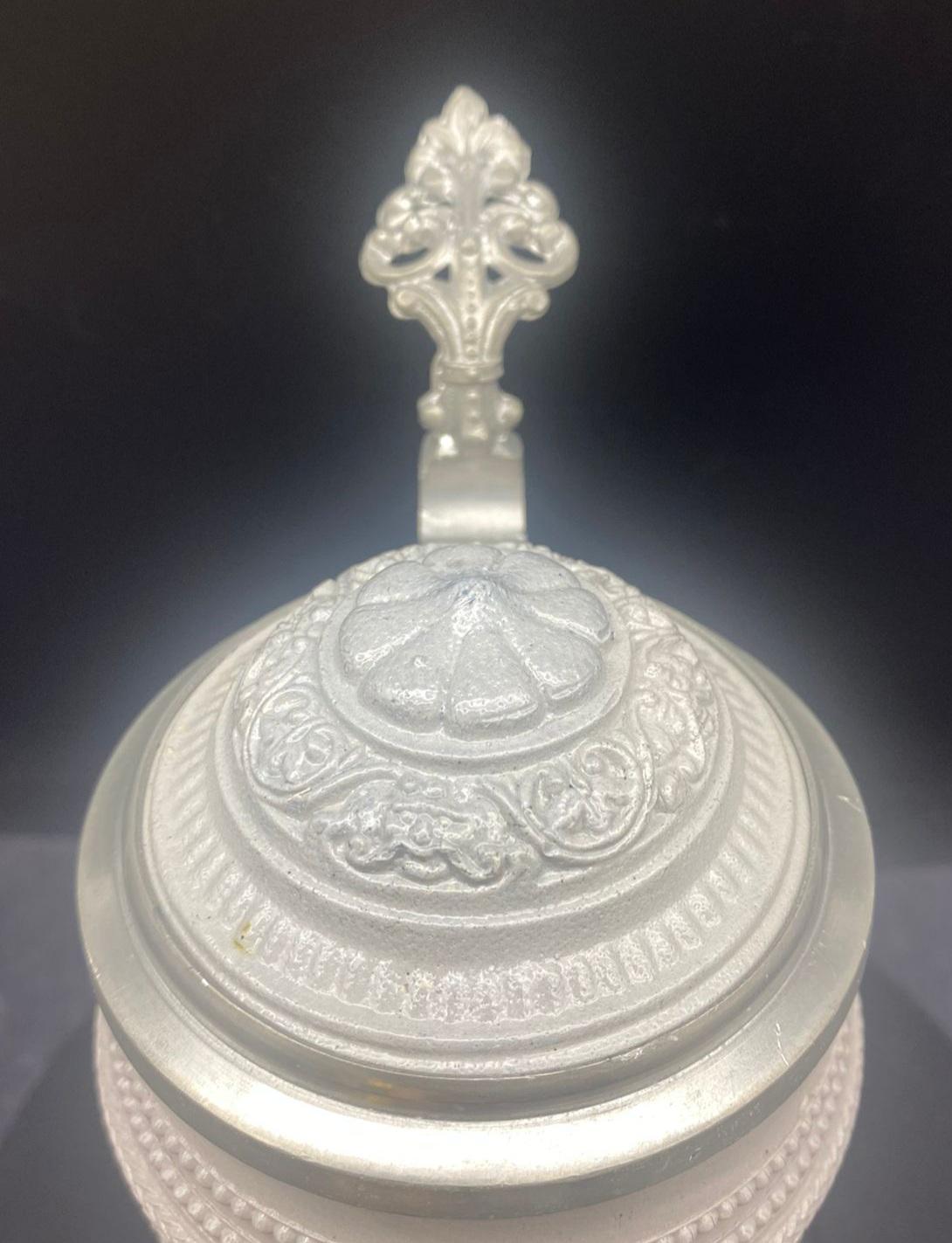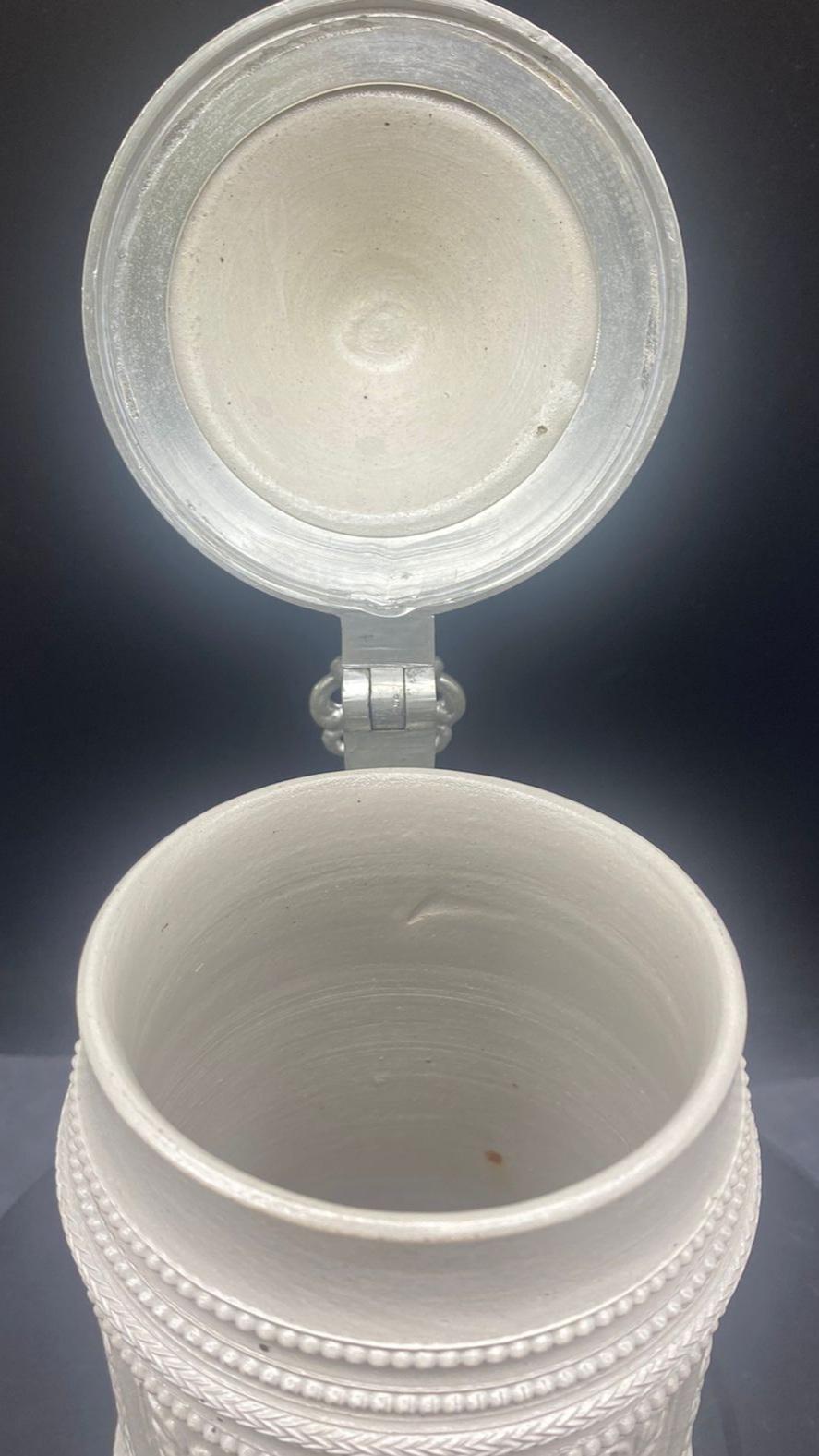 The inscription on the beer mug (stein) in German reads: "Ein Trunk zur rechten Zeit. Hält stets das Herz erfreut". Translated, it means: "A sip at the right time always makes the heart happy." This phrase is a common traditional inscription on German beer mugs, which were often decorated with such sayings to add humor or philosophy to the process of drinking beer.