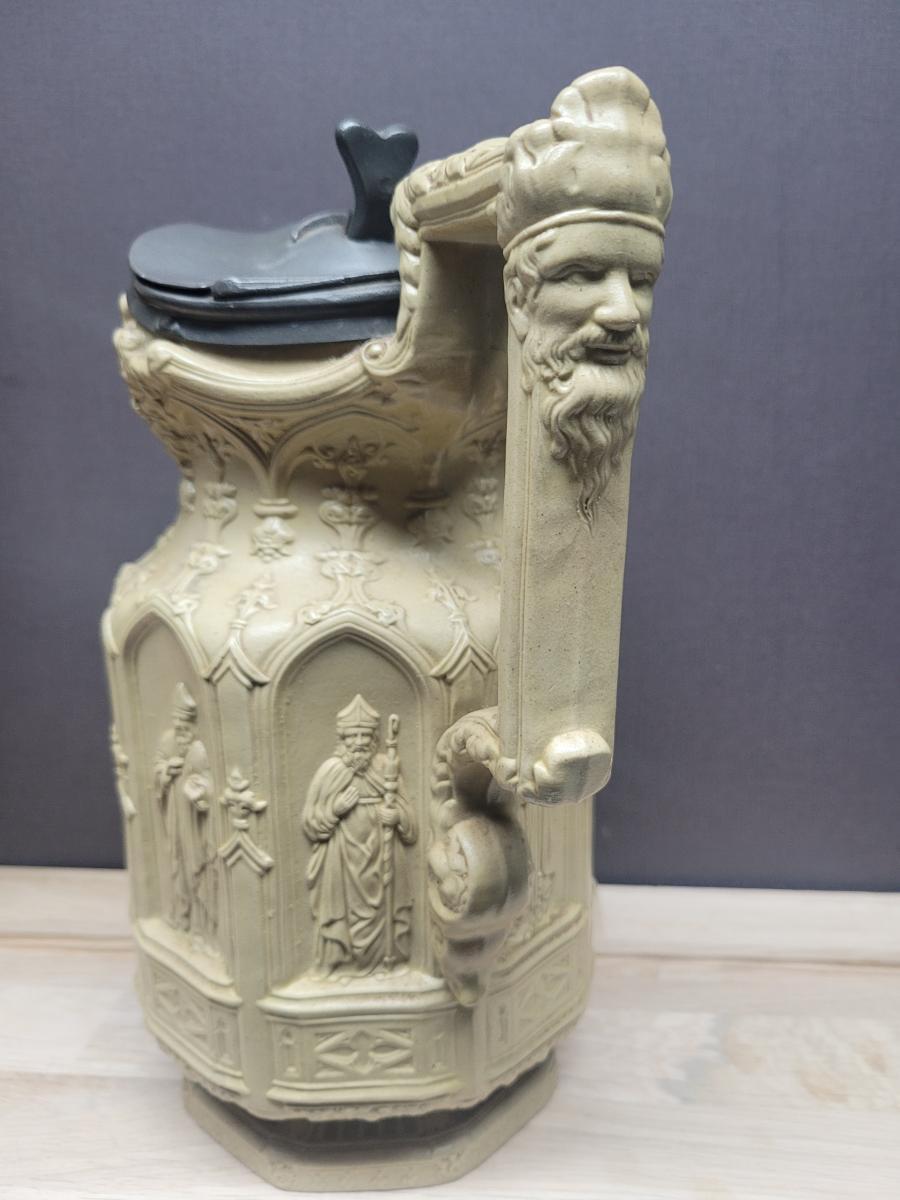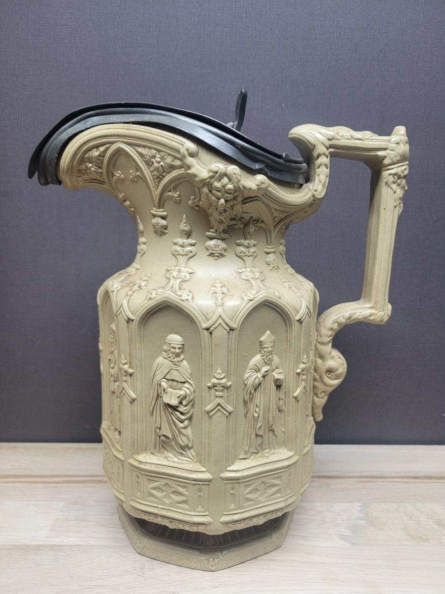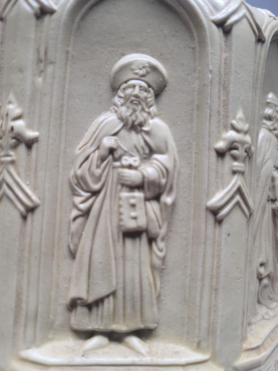 'Jug of white stoneware. Octagonal body moulded with ecclesiastical figures in eight Gothic niches. The angular loop handle and curved mouth and lip are moulded with bearded masks and Gothic ornament.' See: [link]