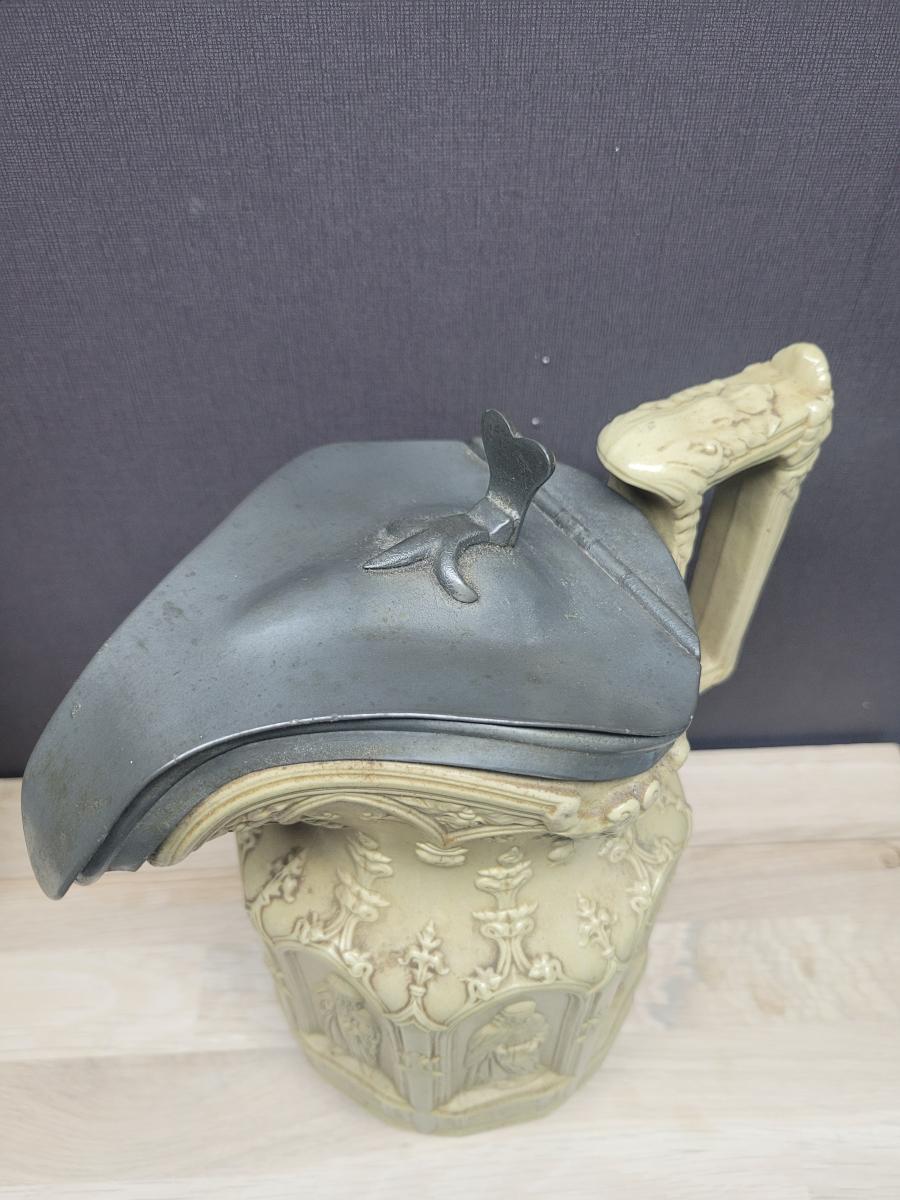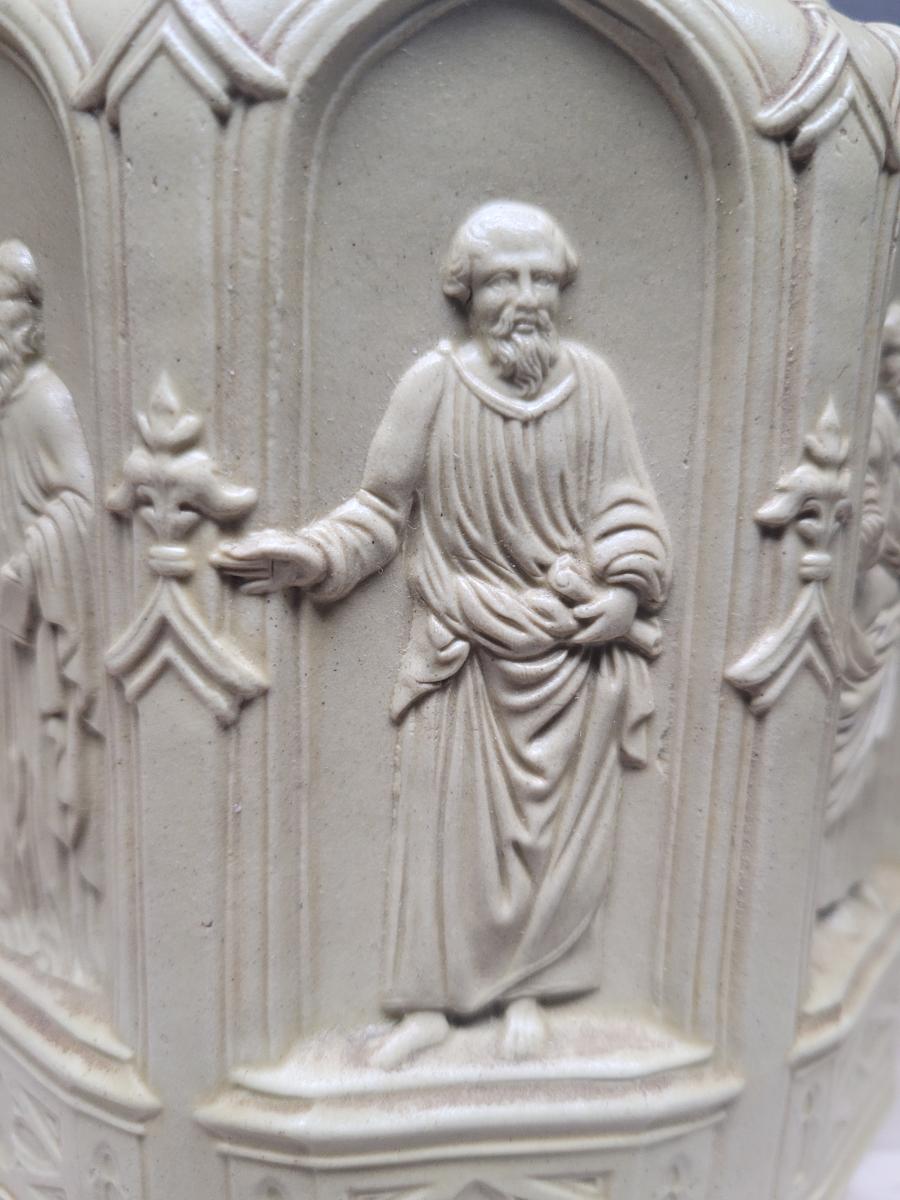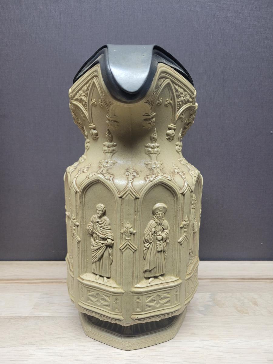 'Jug of white stoneware. Octagonal body moulded with ecclesiastical figures in eight Gothic niches. The angular loop handle and curved mouth and lip are moulded with bearded masks and Gothic ornament.' See: [link]