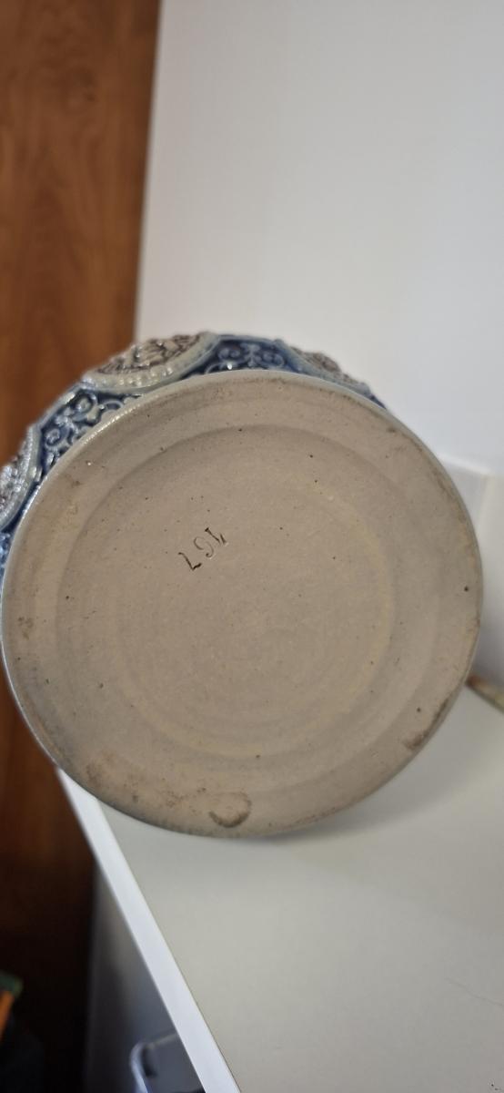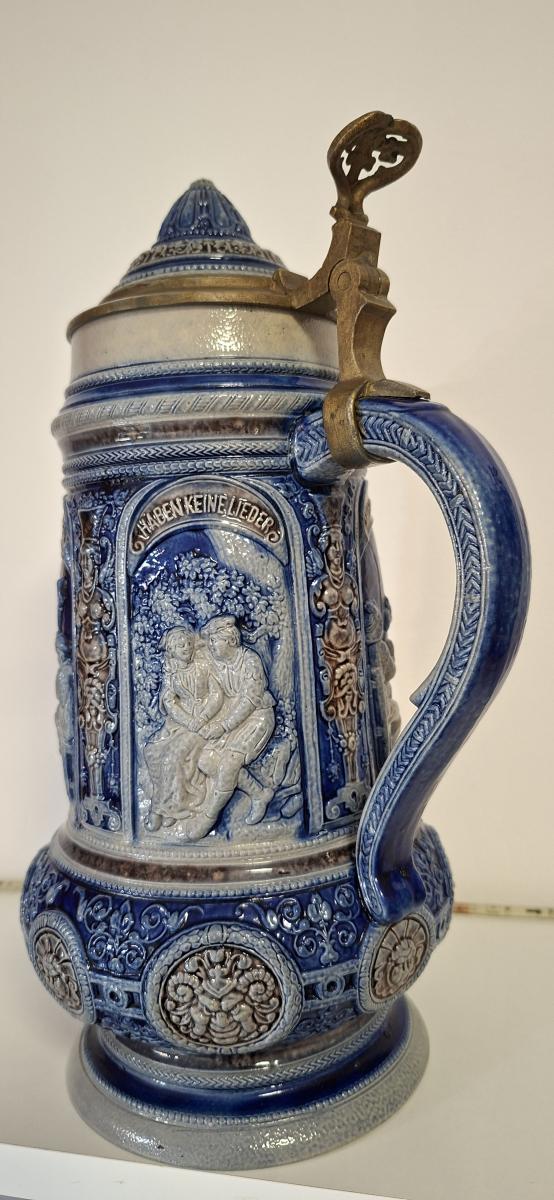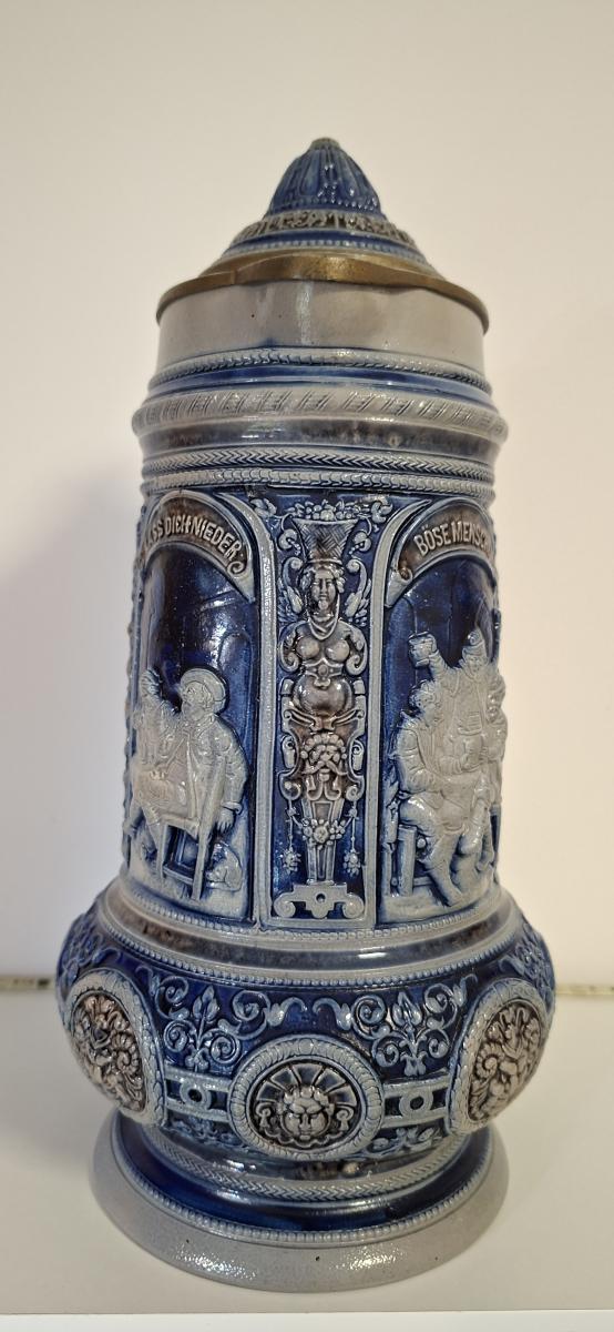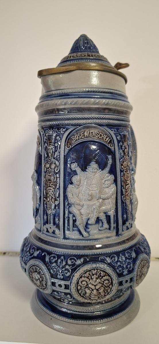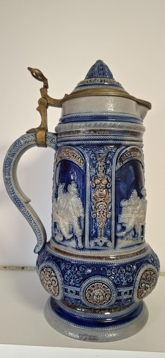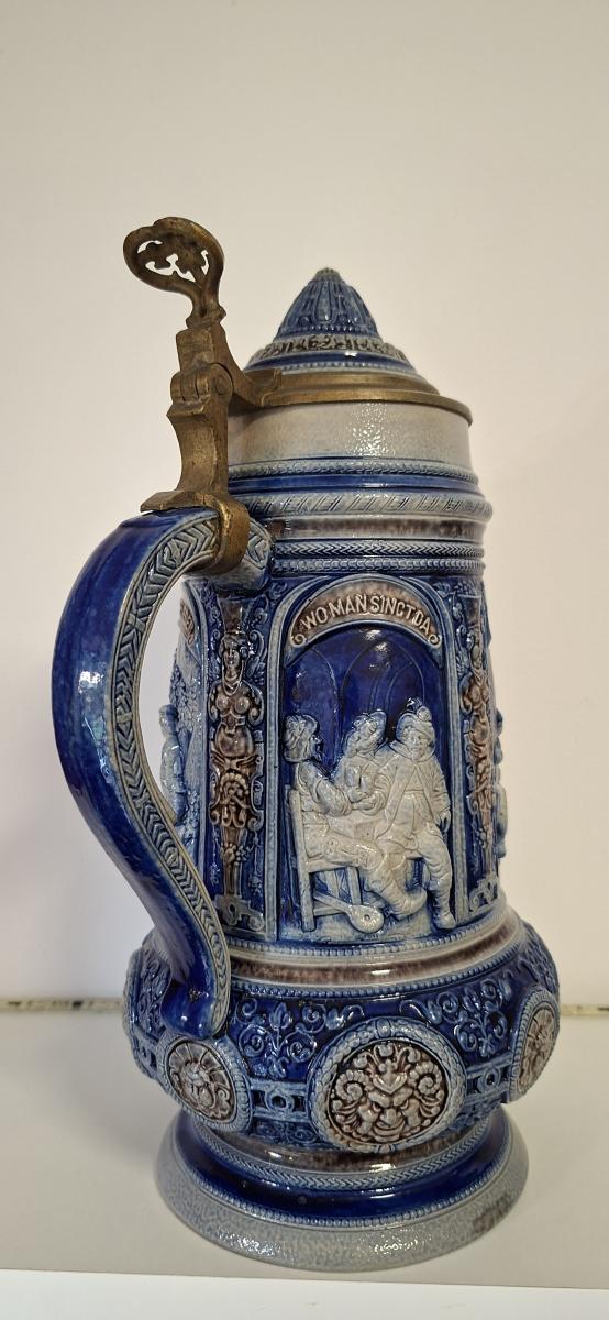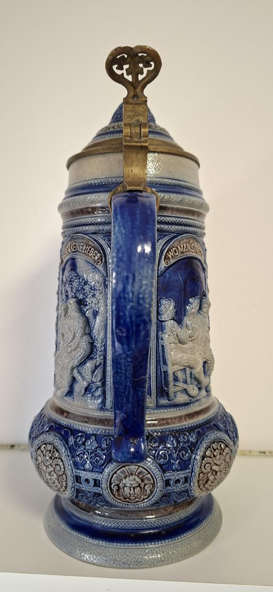 A beautiful, massive 2-liter stoneware beerstein/jug named "Tavern scenes" from the westerwald region of Germany, town Hohr, made by the Simon Peter Gerz factory. Mold number is #467. As befits the westerwald region, the beerstein is richly decorated in a predominantly cobalt blue and glazed with salt. It features an inlaid lid. The beerstein was likely made between 1875 and 1895, when it featured massive fittings with an "open" hinge with three rings and a thumb grip located directly above the hinge. The mark on the inside of the lid ("Reichszinn Hohr") also indicates a similar age, with such marks ("Reichszinn") being used among others on beersteins between 1871 and 1918, suggesting a high-quality item made before World War I.