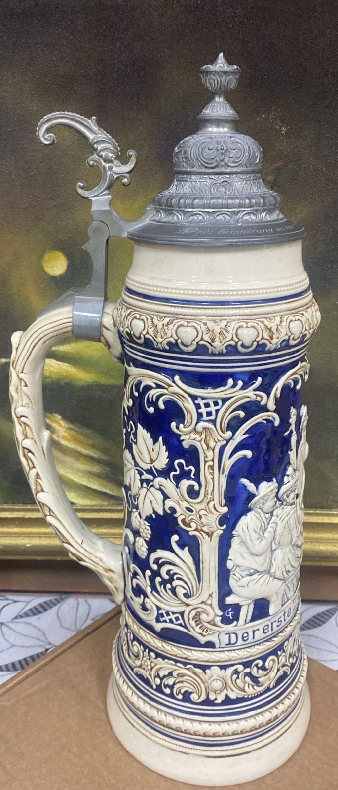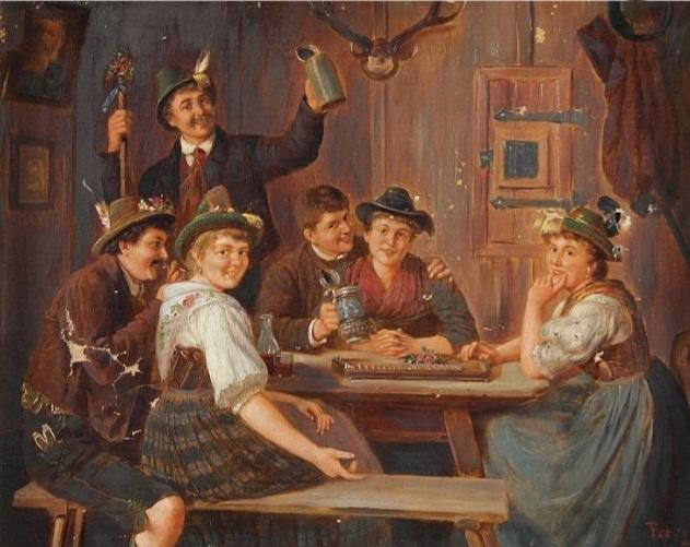 The painting in the image is the work of the German artist Friedrich Anton Prelss (1855-1934). It is known as the "Tavern Scene" (Wirtshausszene) or "Come and Sit Down" (Come and Sit Down).
