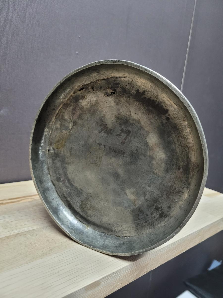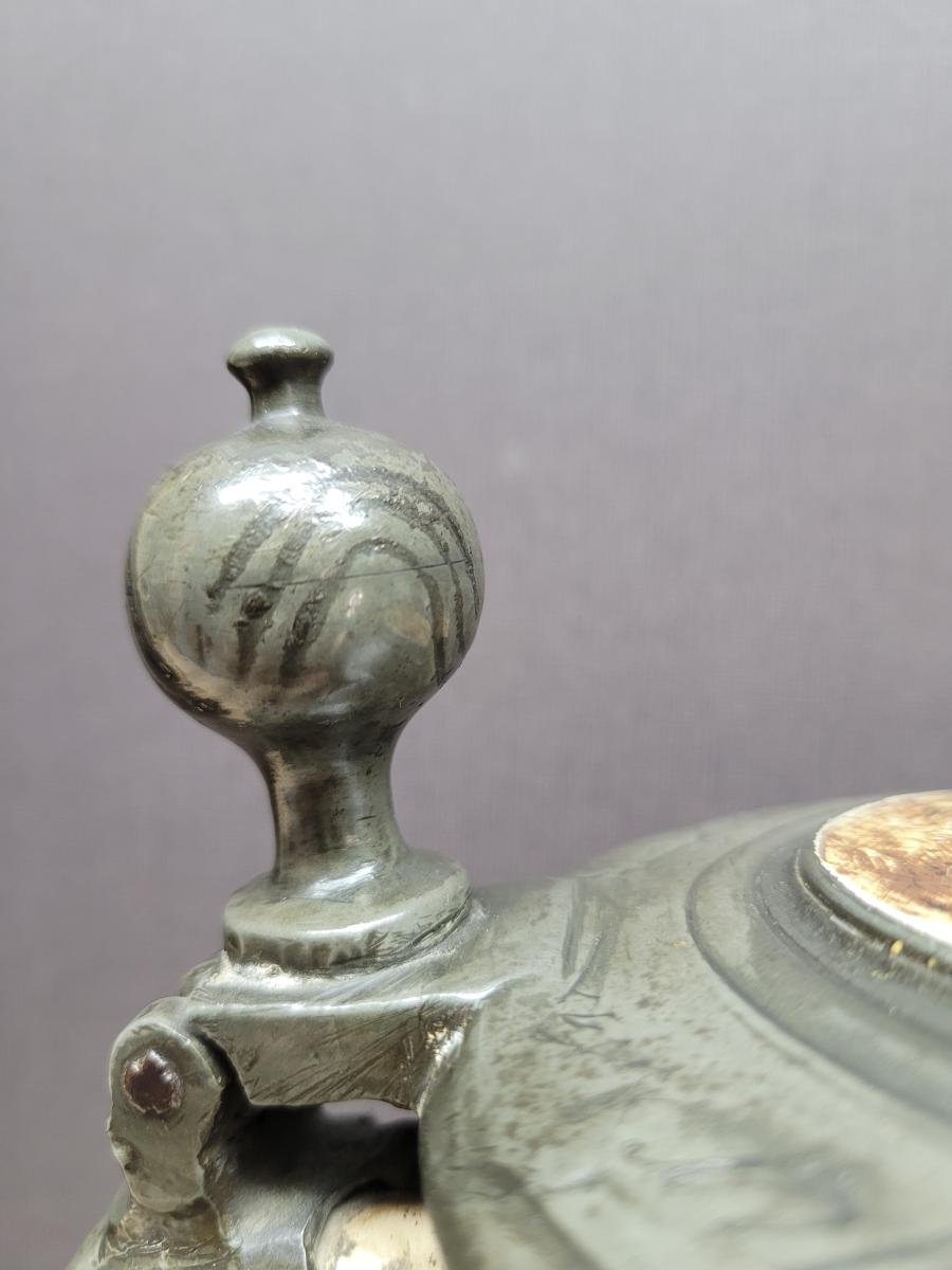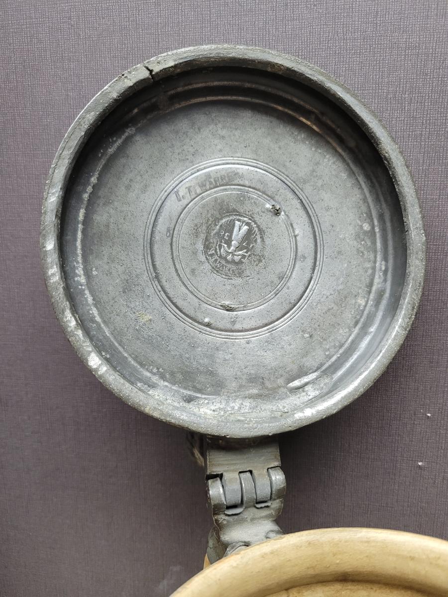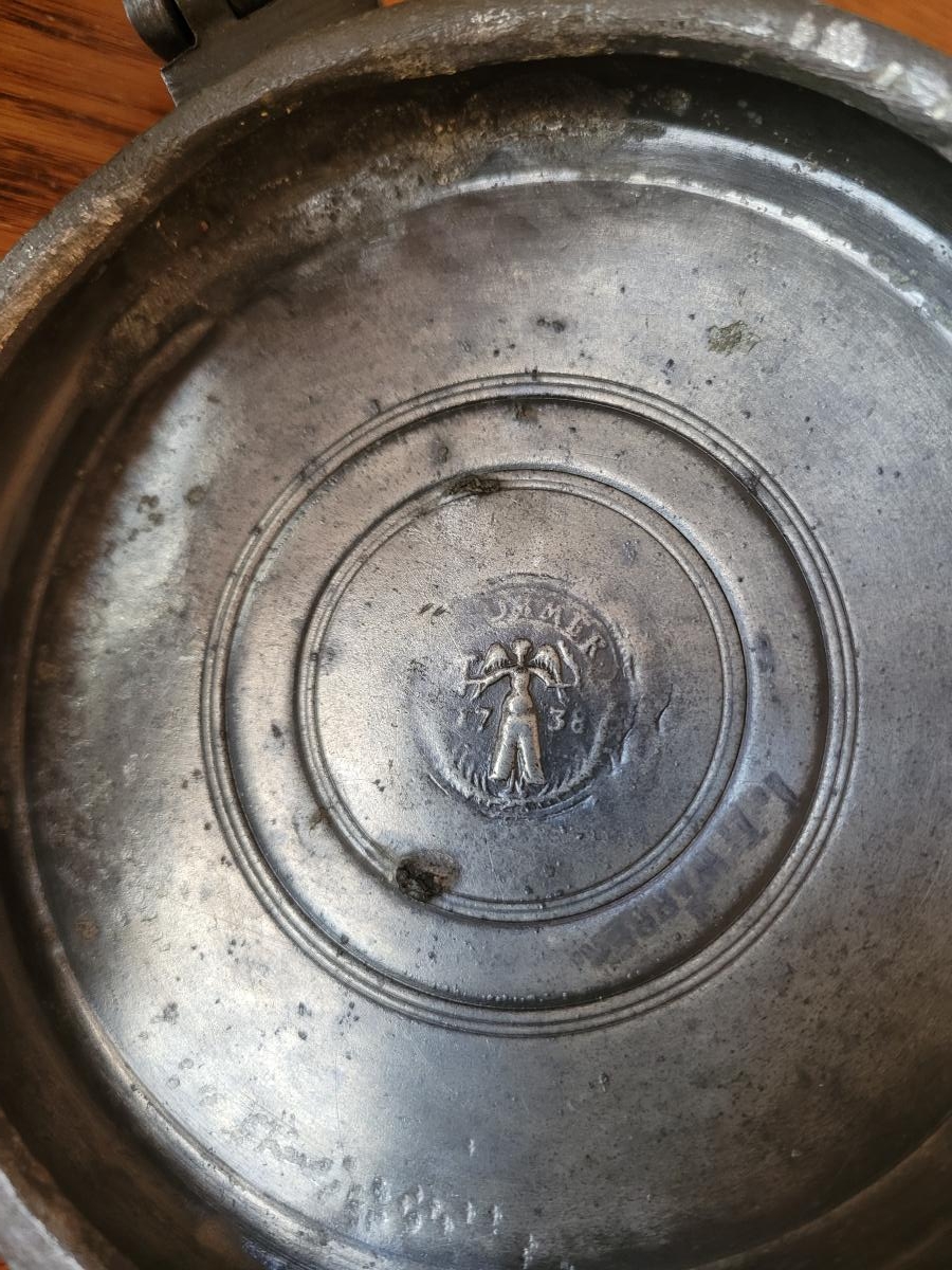 A pewterer's mark inside the lid shows a angel and the year 1738. In pewter marks such a number may refer to the year the pewterer became 'master' pewterer, not the year an object was made.