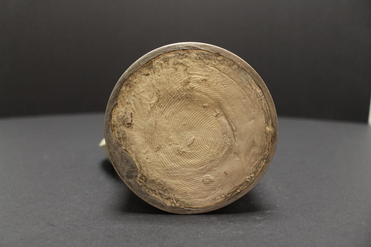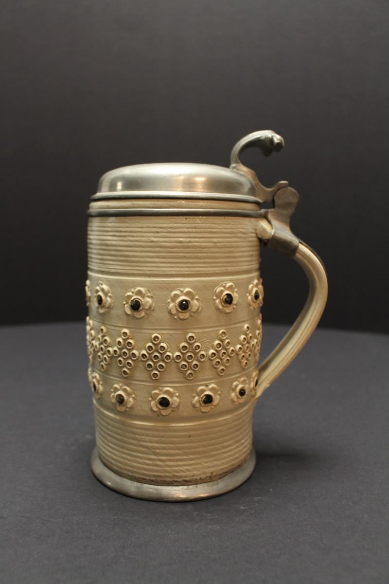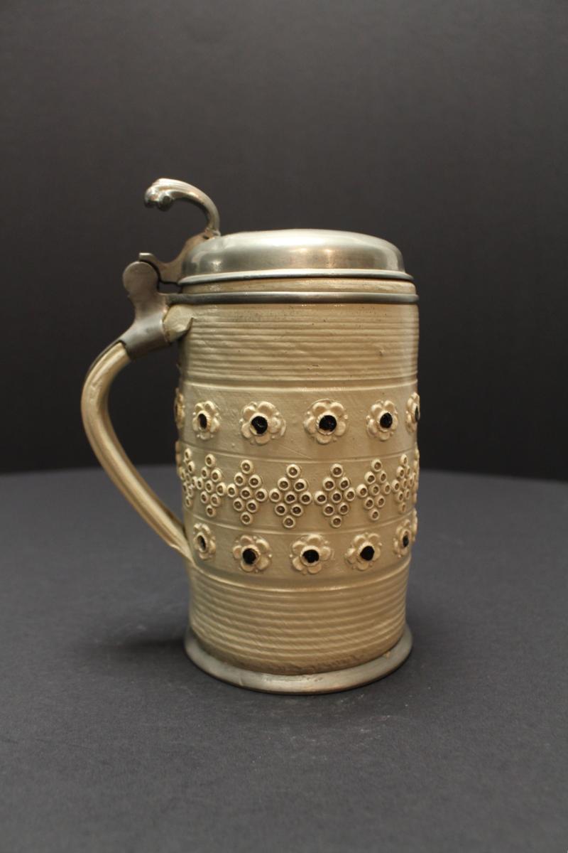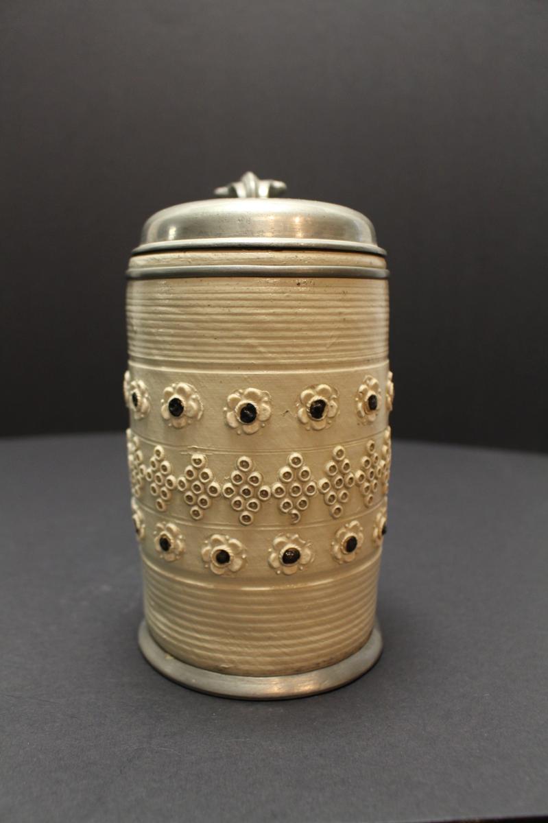 From 1745 to 1780, the Altenburg potters produced reduction fired vessels. Reduction firing (reduced oxygen in the kiln) resulted in vessels that were light gray or almost white. From about 1750 to 1765, small circles were very popular as a decoration. The circles were applied, forming a lacework edge, which looks like a slightly shifted diamond band.