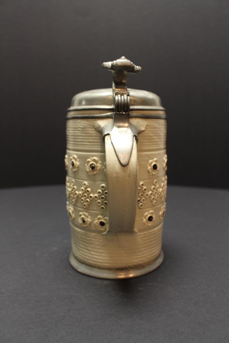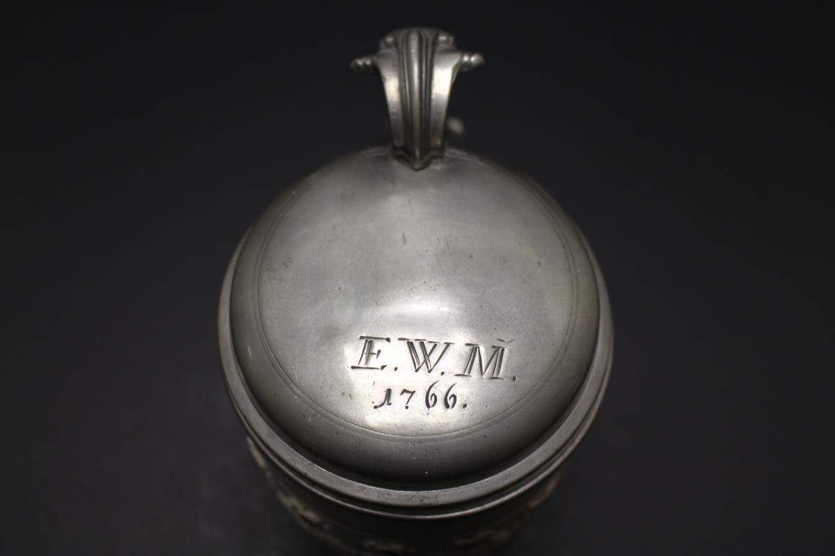 The pewter lid, large closed 5 ring hinge, and thumb lift are appropriate for the time period. Unlike earlier Altenburg vessels, there is only one pewter body ring below the lid and there is only a simple foot ring. The lid is personalized “E.W.M. and dated 1766.