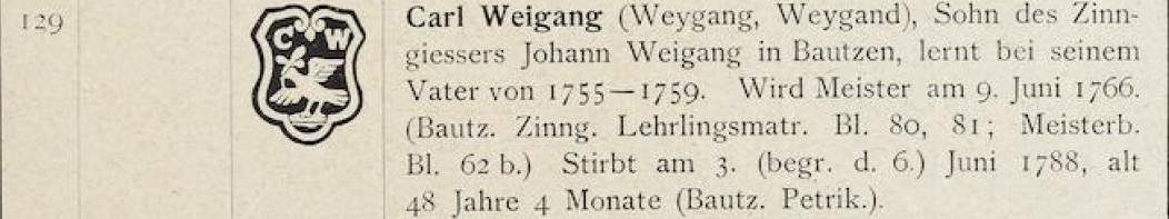 The pewter mark with the initials “CW” and the bird image were identified as belonging to Carl Weigang (Weygang, Weygand), son of the pewterer Johann Weigang in Bautzen. Weigang trained with his father from 1755 to 1759 and he became a master craftsman on June 9, 1766.