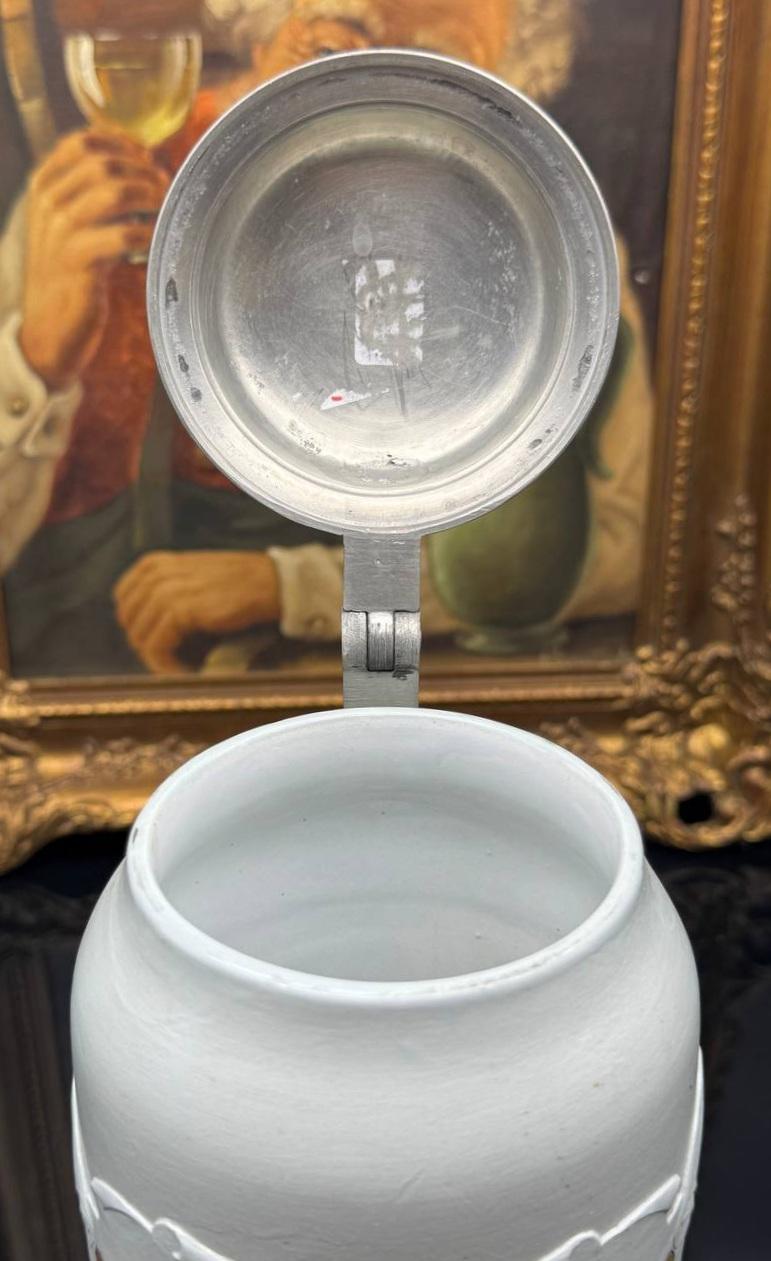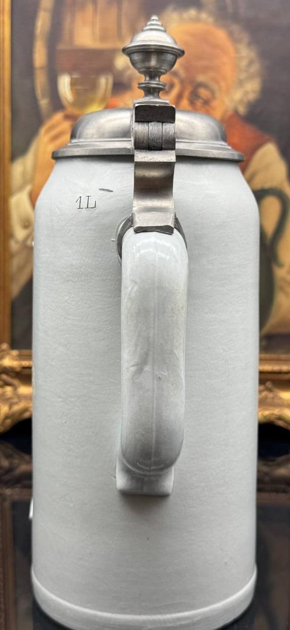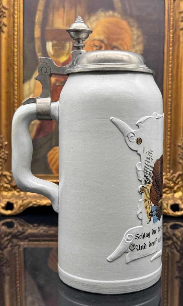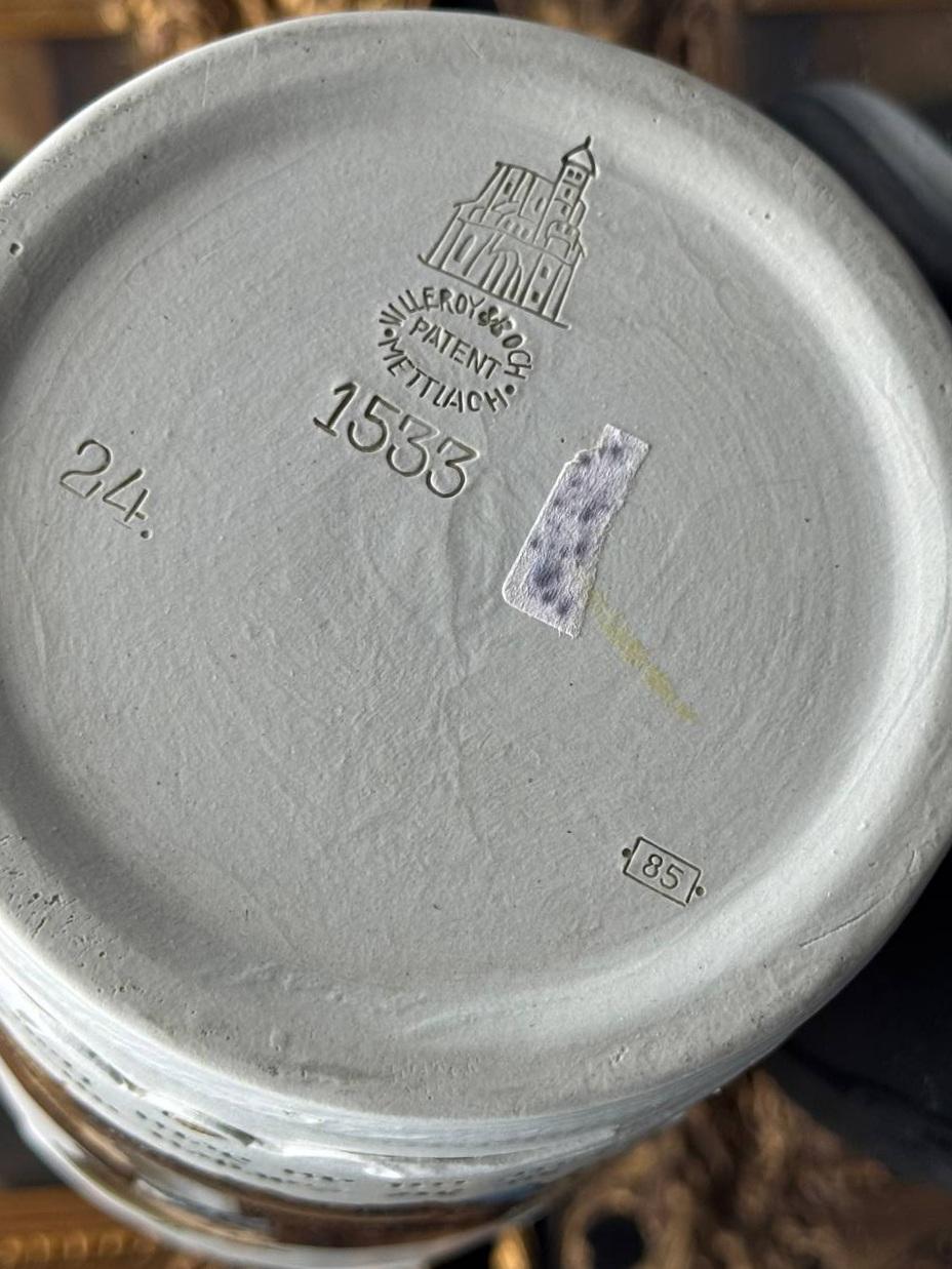 A large antique German beer mug called "Mountain Dweller" with a capacity of 1 liter. The mug was made in 1885 at the famous Villeroy & Boch factory. In the Villeroy & Boch product catalog, the mold of this mug has the number 1533.