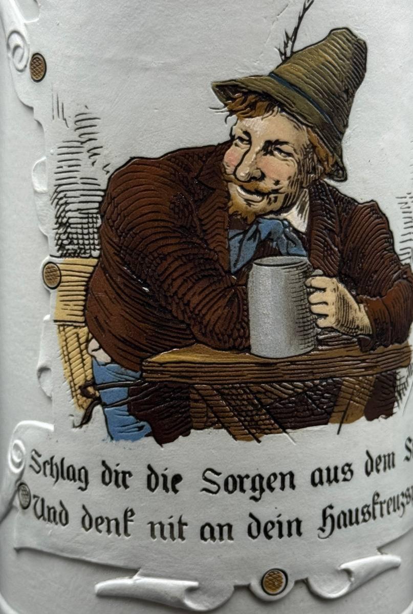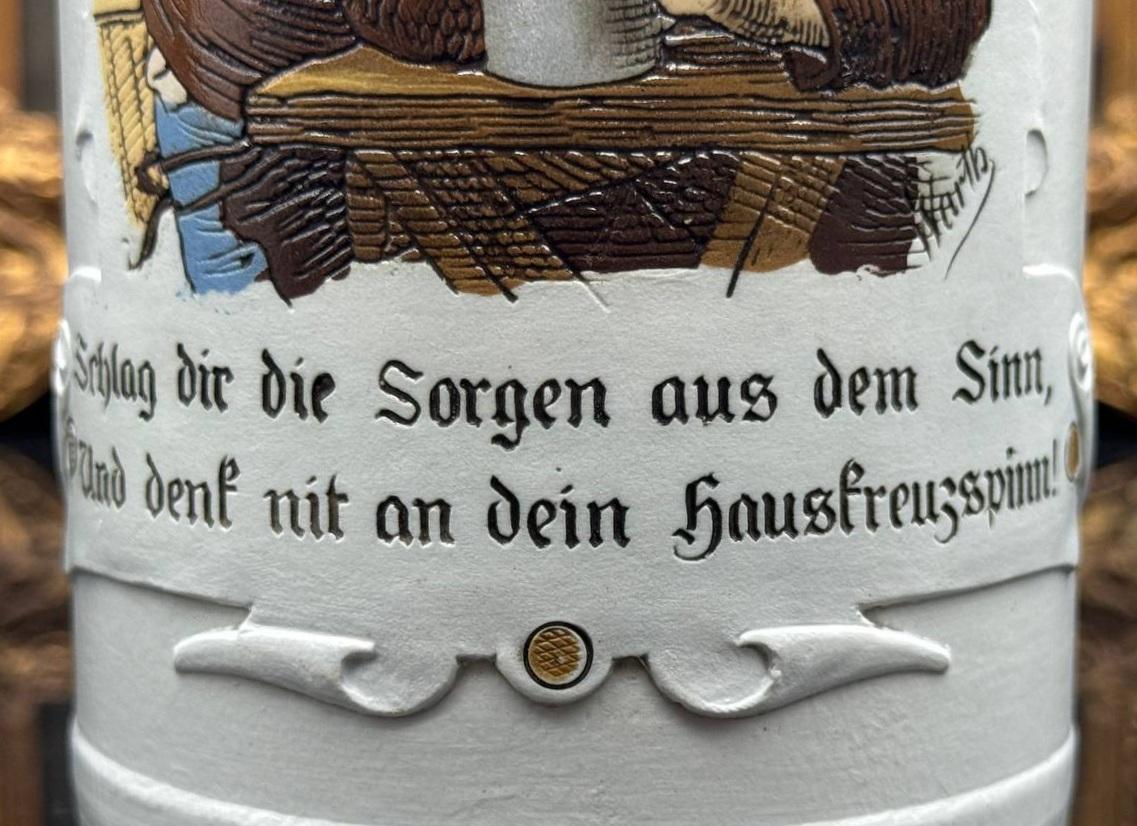 At the bottom of the circle there is a text in German in the old font: "Schlag dir die Sorgen aus dem Sinn, Und denk nit an dein Hauskreuzspinn!" Loosely translated, it means: "Put the worries out of your head and don't think about domestic troubles!" (literally: don't think about your "home cross" — a grumpy wife or domestic problems). This is a typical German table toast, encouraging you to relax, drink a beer and forget about everyday worries.