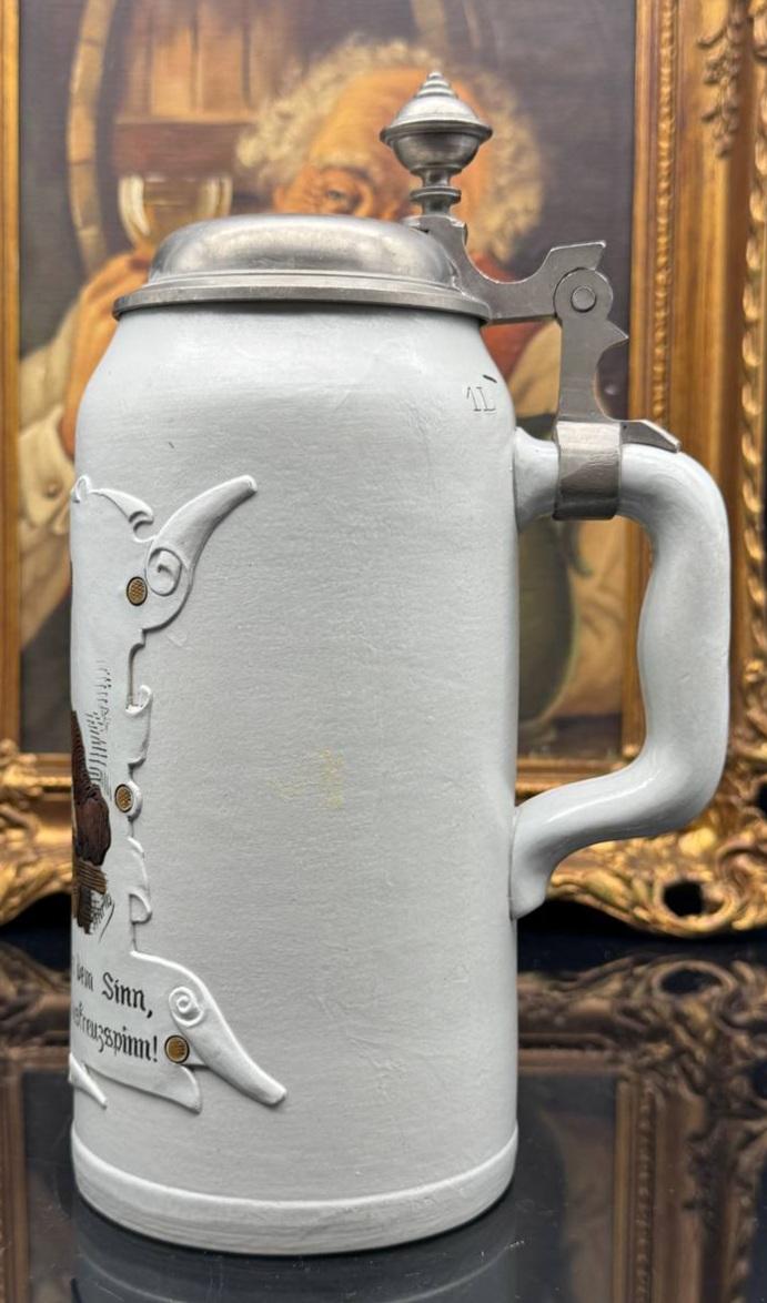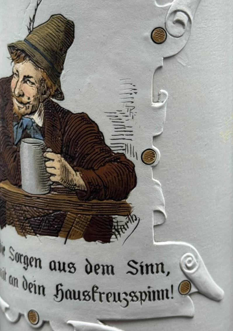 The decoration of the mug is made in a combination of two complex techniques. The relief base for the drawing is applied using the tapestry technique. It's like a carpet attached to a wall surface. The portrait drawing itself is made using the ceramic etching technique. Combining these two techniques is considered very difficult and time-consuming. This significantly increases the value of the product. Because of the specifics and shape of the decoration, beer mugs of this category have received a stable name among collectors - tapestry mugs.