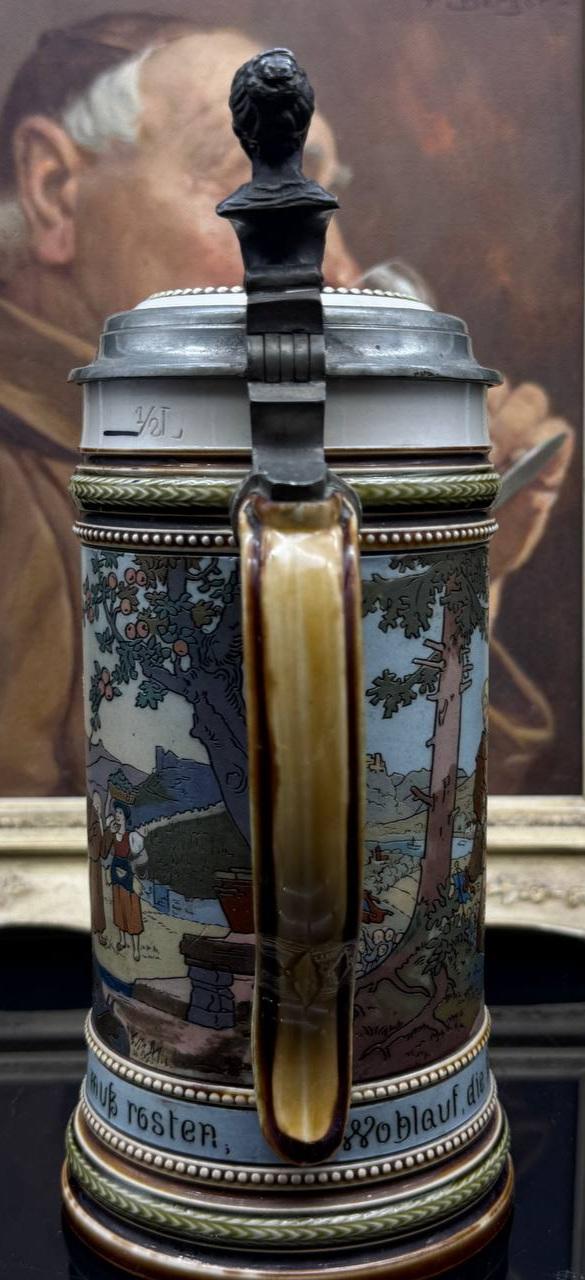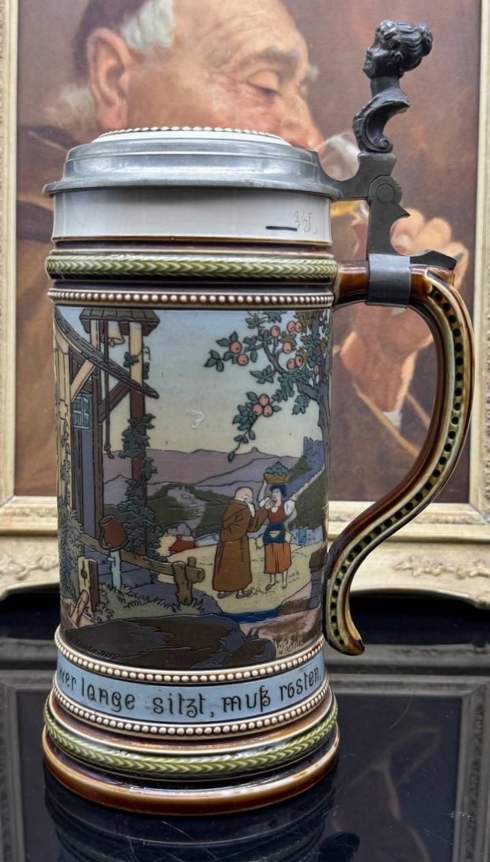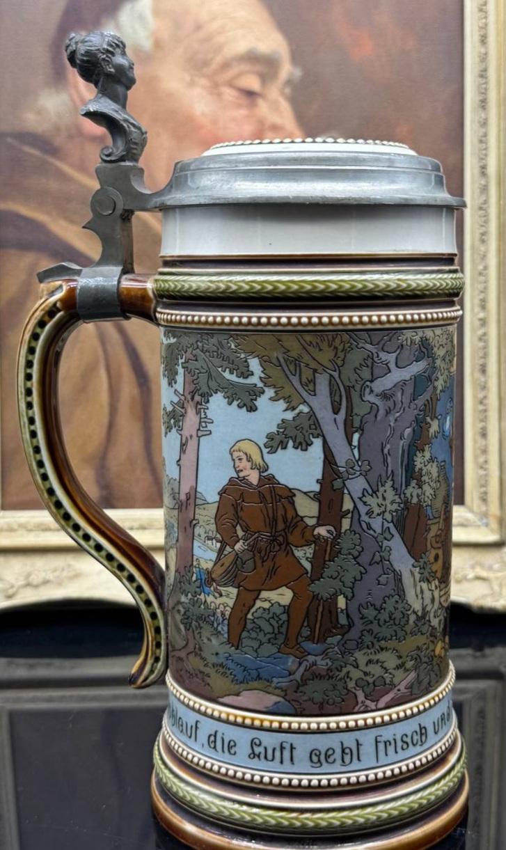 An antique 0.5 liter beer mug was made in 1898 at the famous Villeroy & Boch factory. In the product catalog of the Villeroy & Boch factory, the mold of this mug has the number 2531. It is called "Minstrel Drinking".