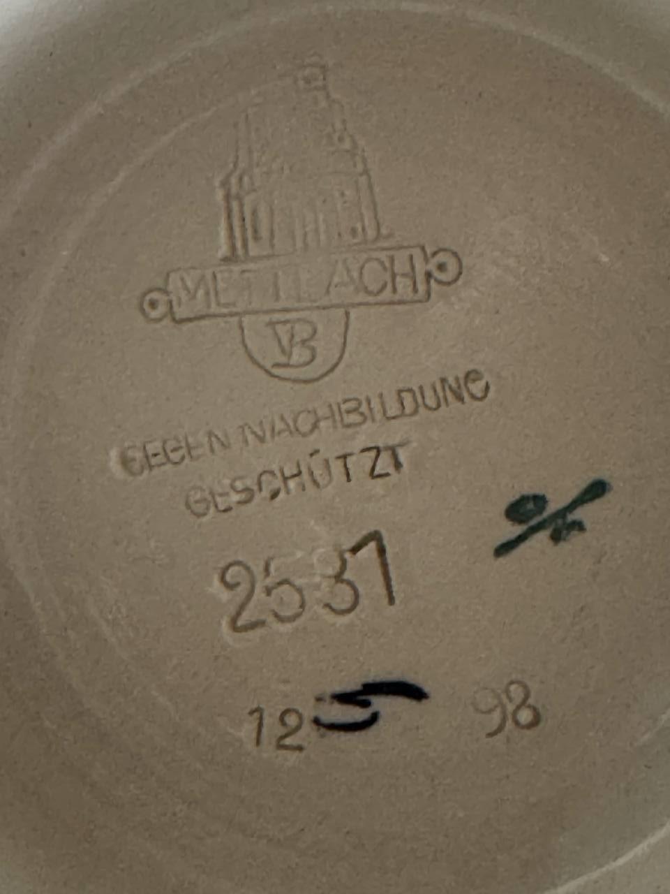 There is an inscription on the mug. Translated from German, it means: "Let it rain, the wind blows fresh and clean, and those who sit back will rust." The text is taken from the first line of the poem (Lied der Franken), written in 1859 by Joseph Victor von Scheffel and set to music in 1870 by Valentin Eduard Becker.
